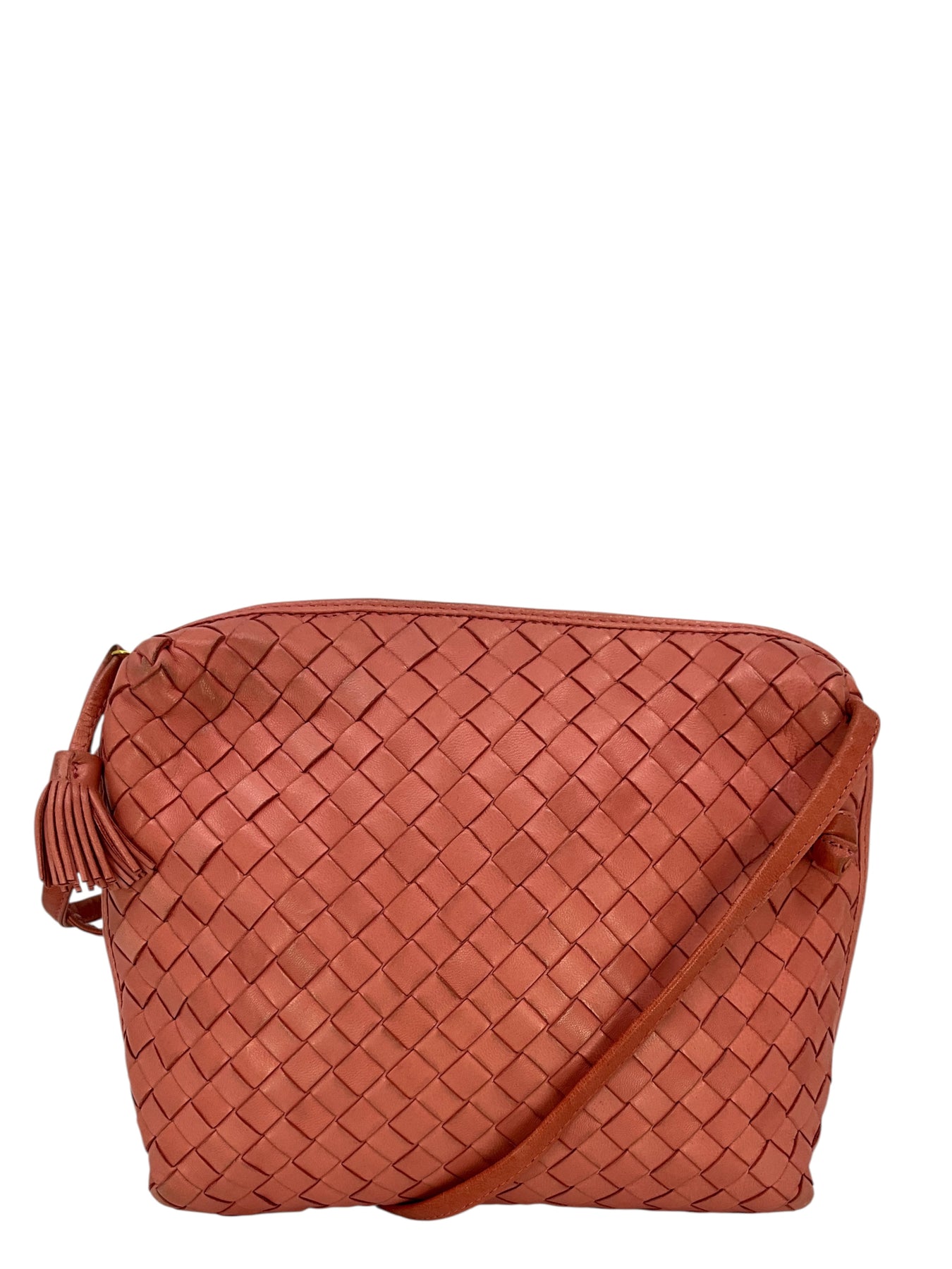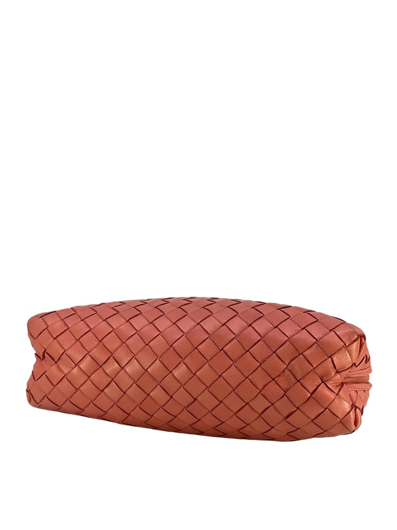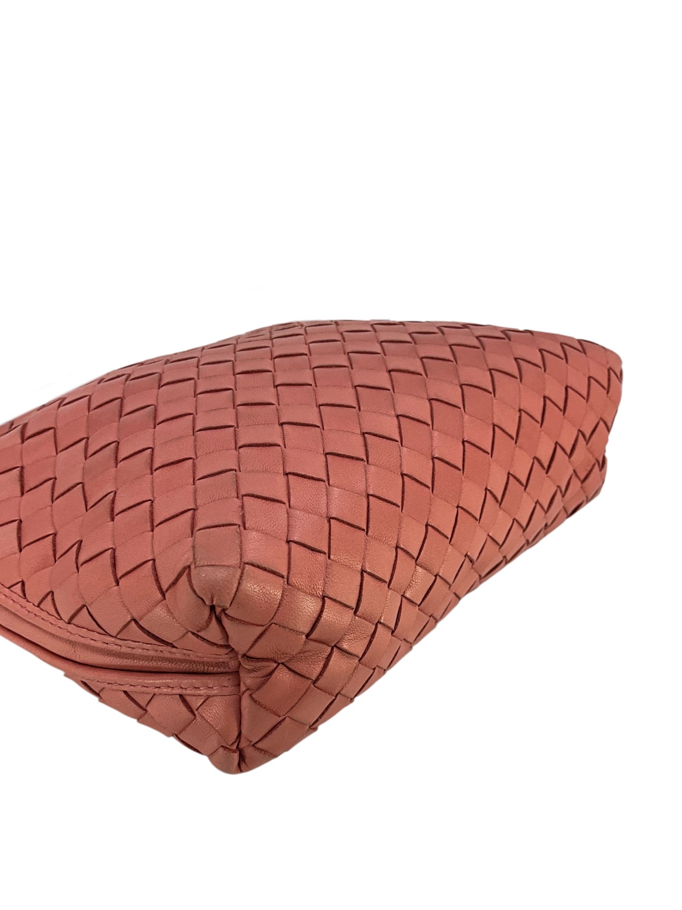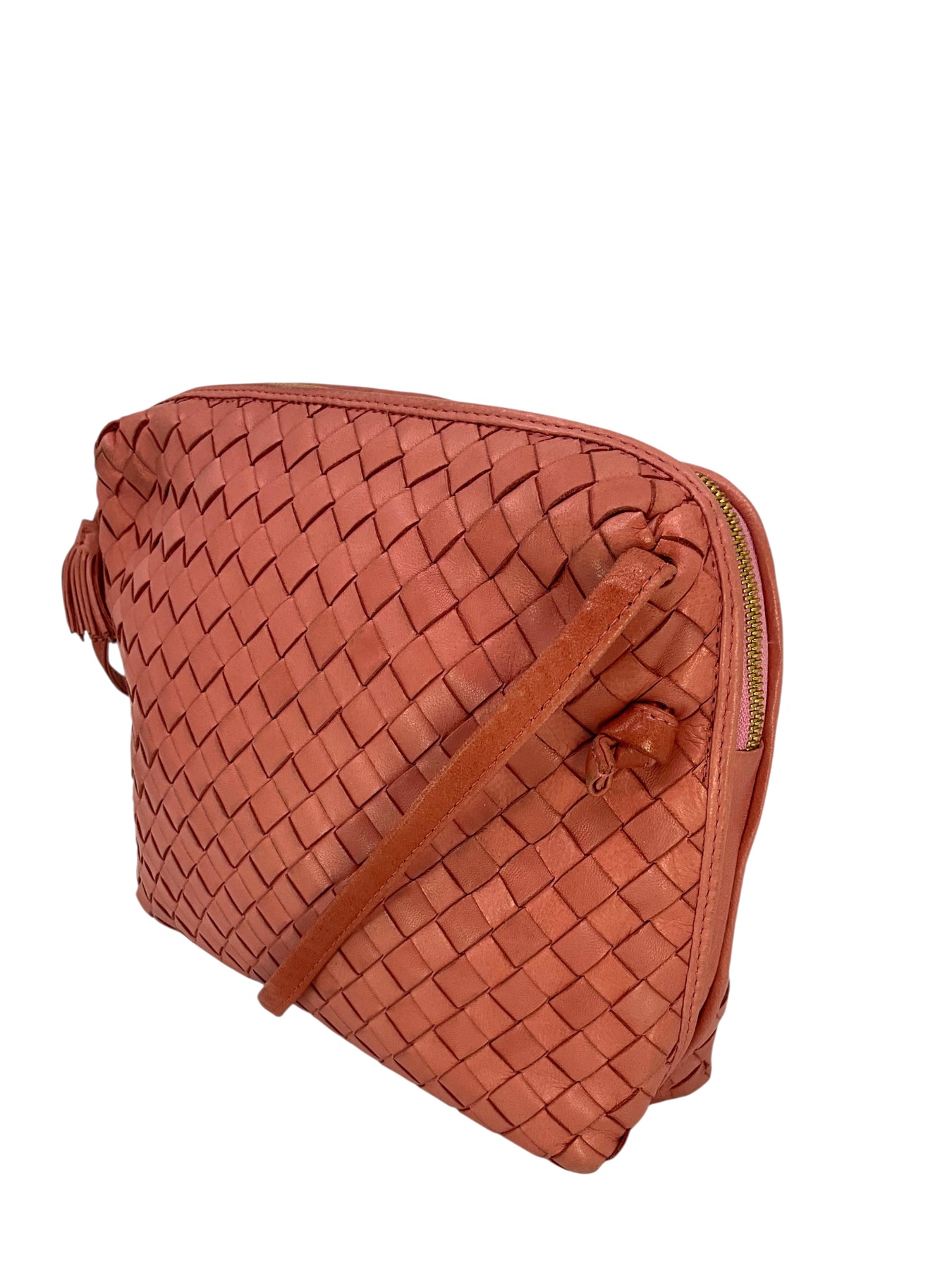 This is an authentic Bottega Veneta Vintage Nodini Intrecciato Crossbody Bag crafted in signature tightly woven salmon pink Intrecciato nappa leather. It features a thin leather crossbody strap and a spacious interior lined in smooth leather with a zipper pocket.