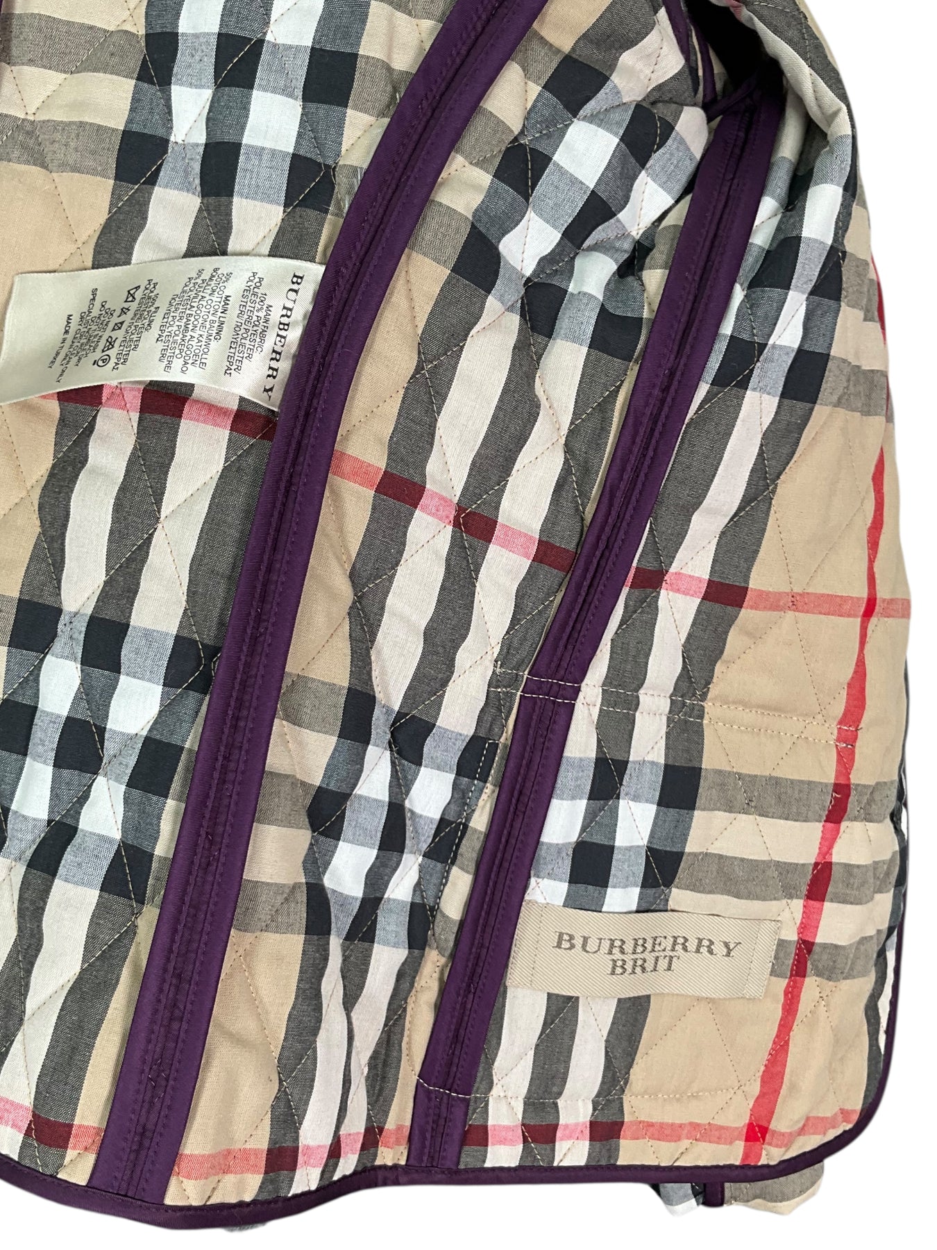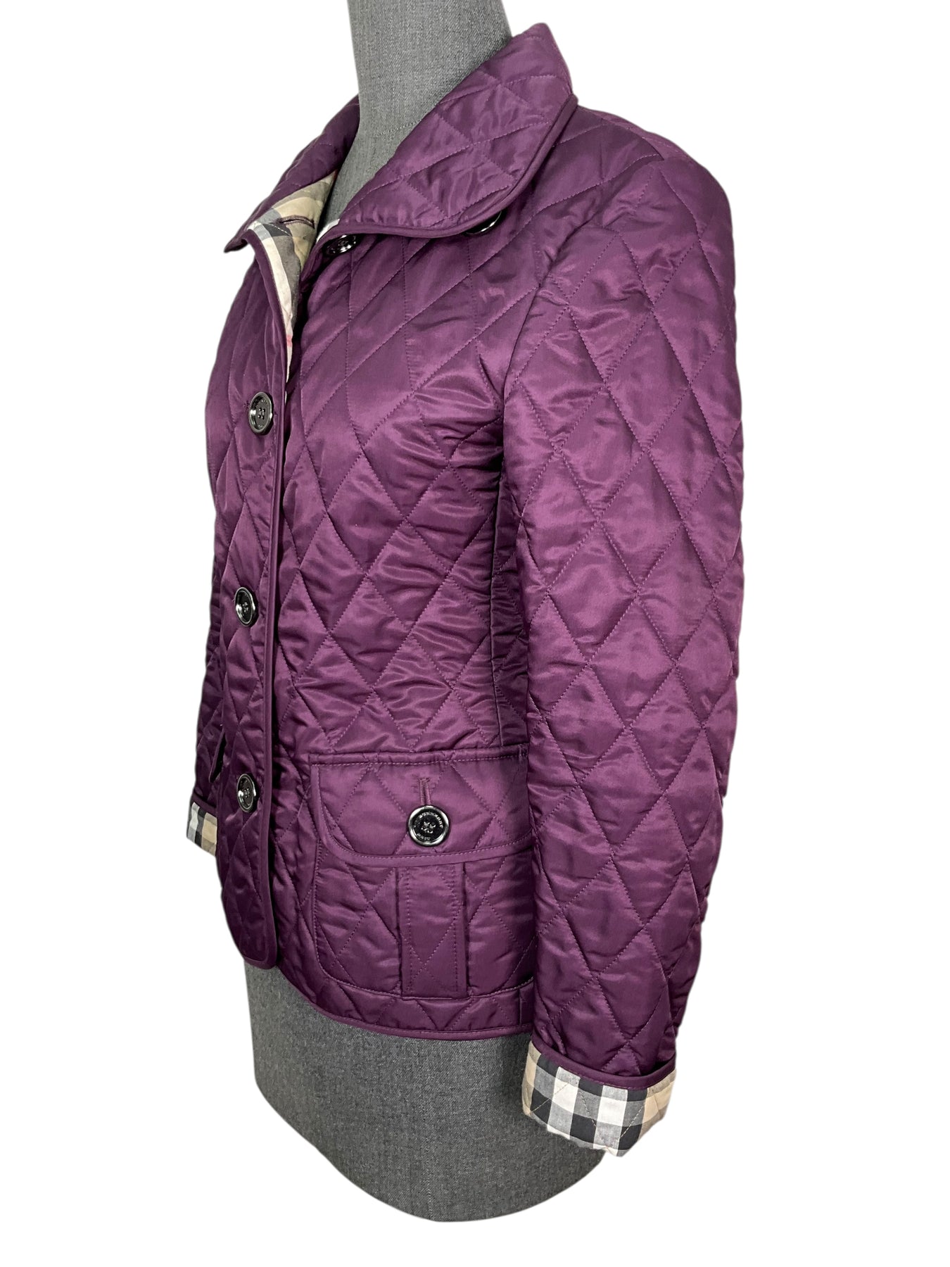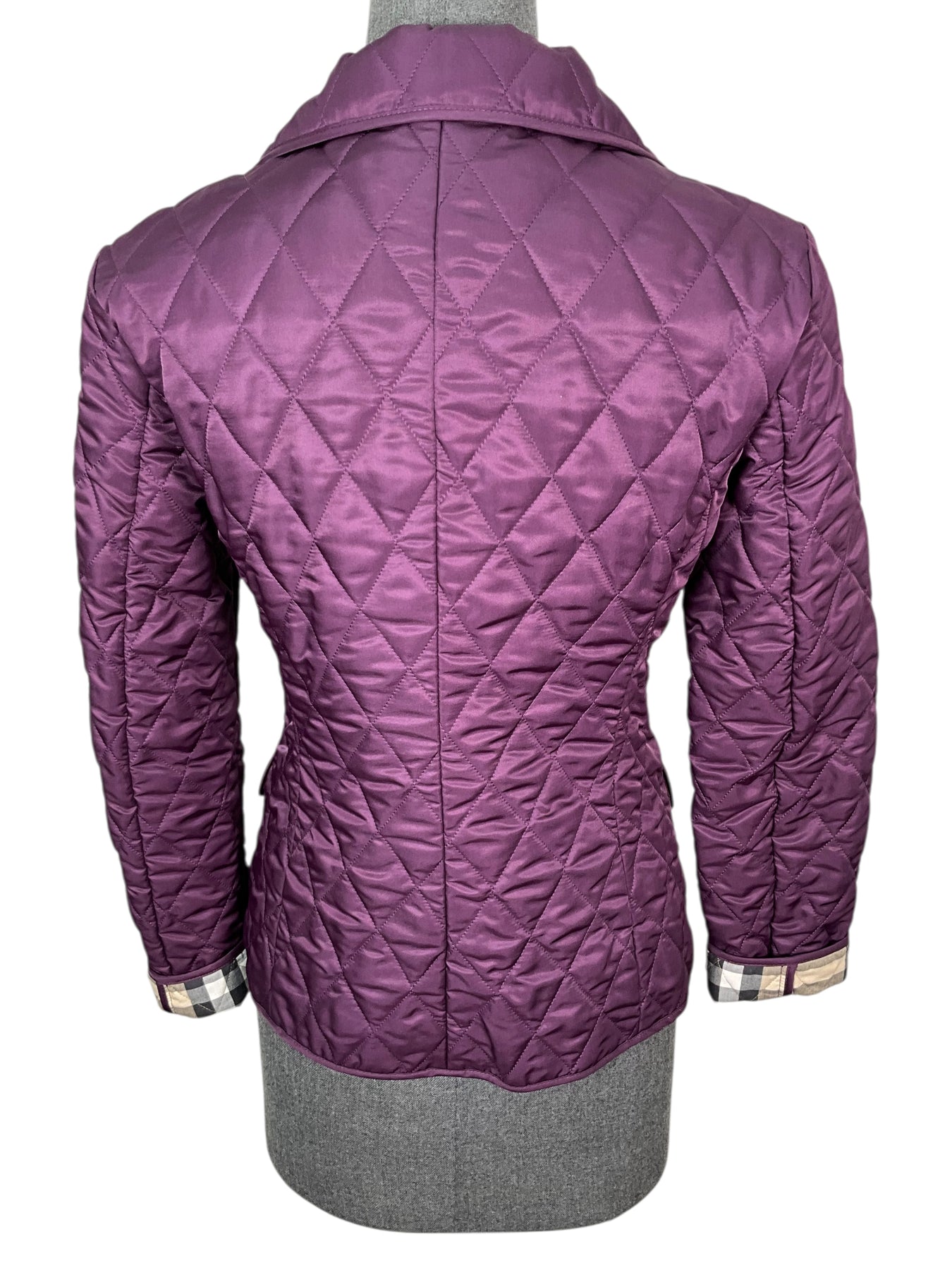 We guarantee the authenticity of this Burberry Brit Diamond Quilted Jacket Size XS in purple featuring two patch pockets and metallic button closures at the front. Fully lined in classic nova check.
