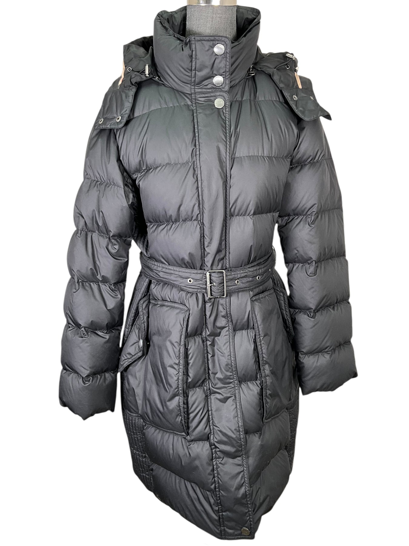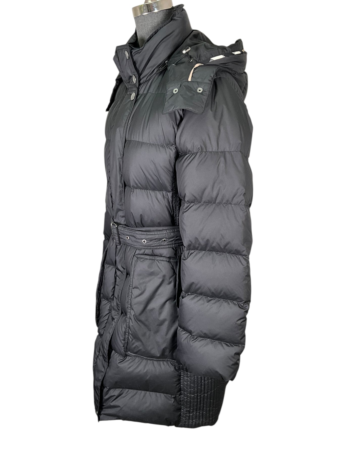 This is an authentic knee length Burberry Brit Quilted Belted Puffer Jacket Size XL in black. Featuring a removable zip hood, metallic buttons, an adjustable belted waist, front zip and snap closures. Fully lined in checkered nylon.