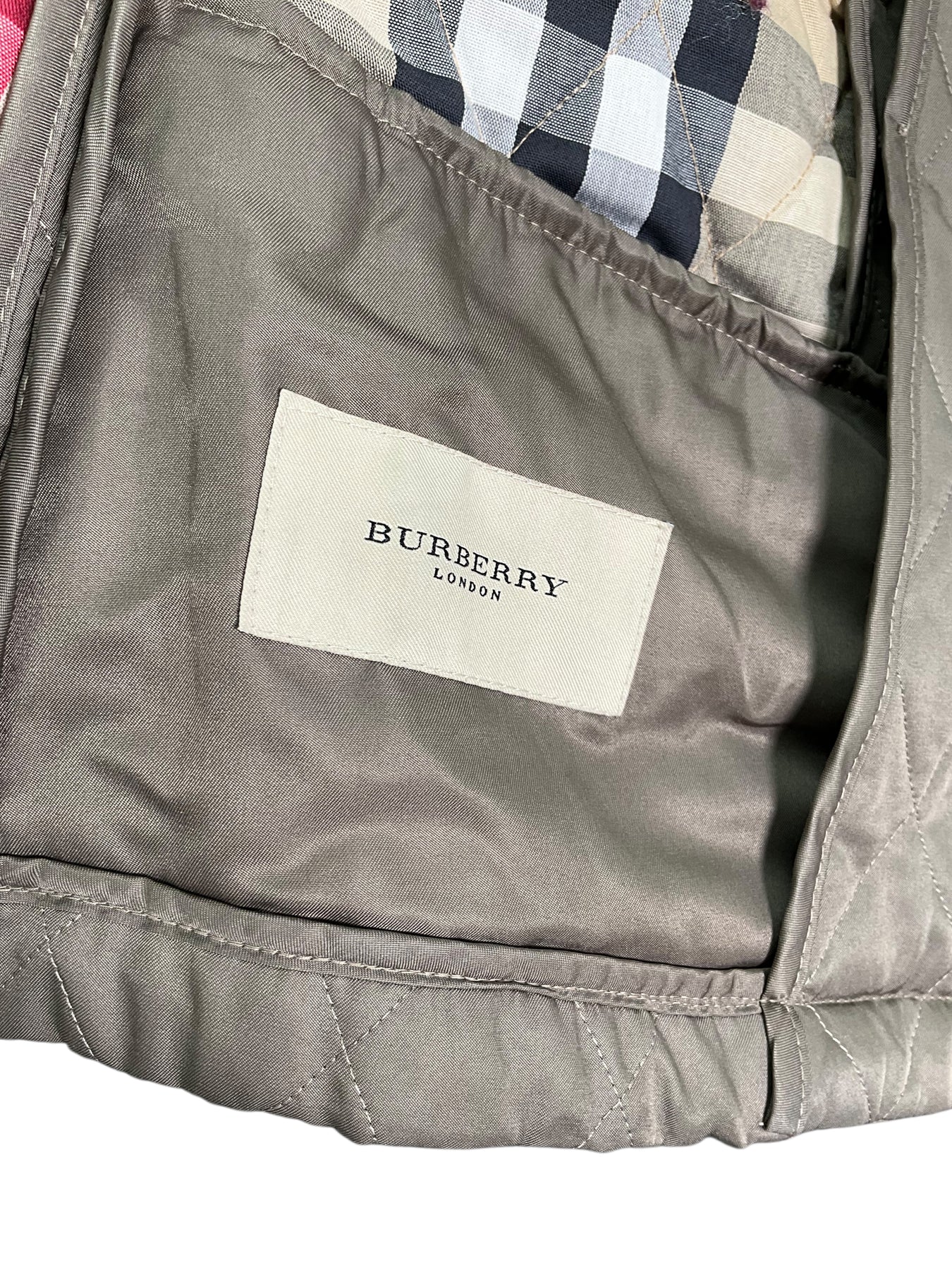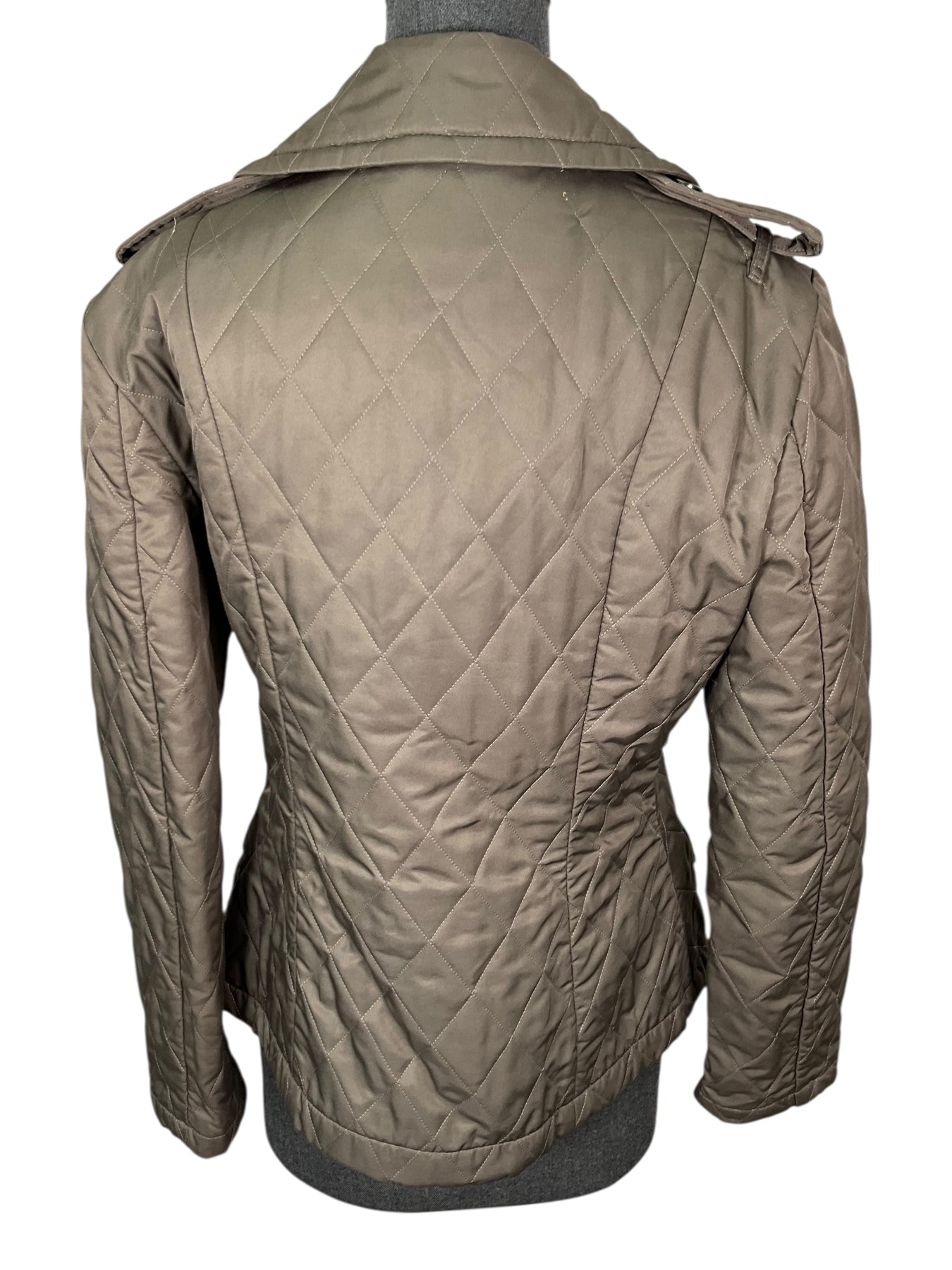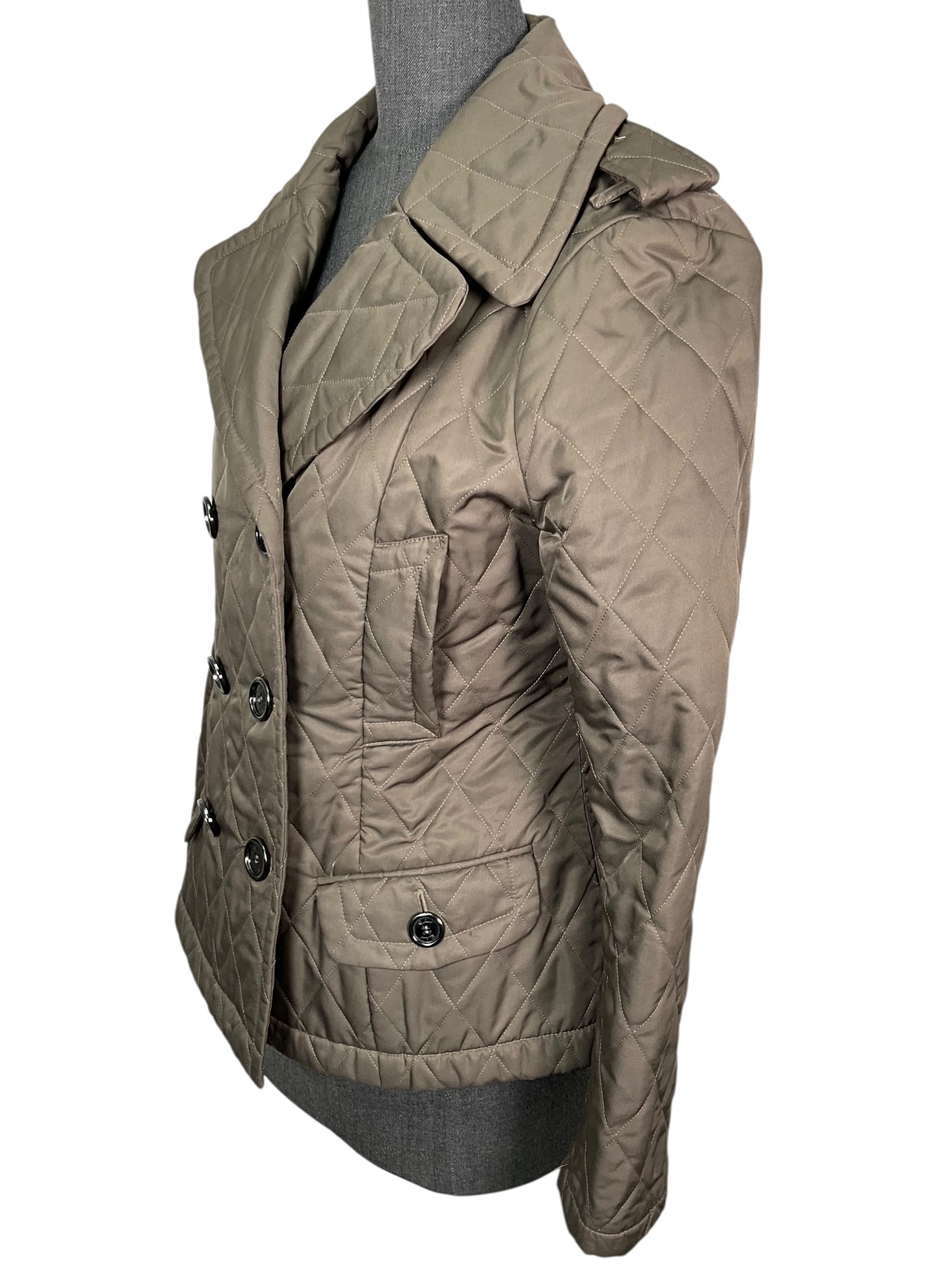 We guarantee the authenticity of this Burberry London Diamond Quilted Double Breasted Jacket Size S in taupe featuring two patch pockets and metallic button closures at the front. Fully lined in classic nova check.