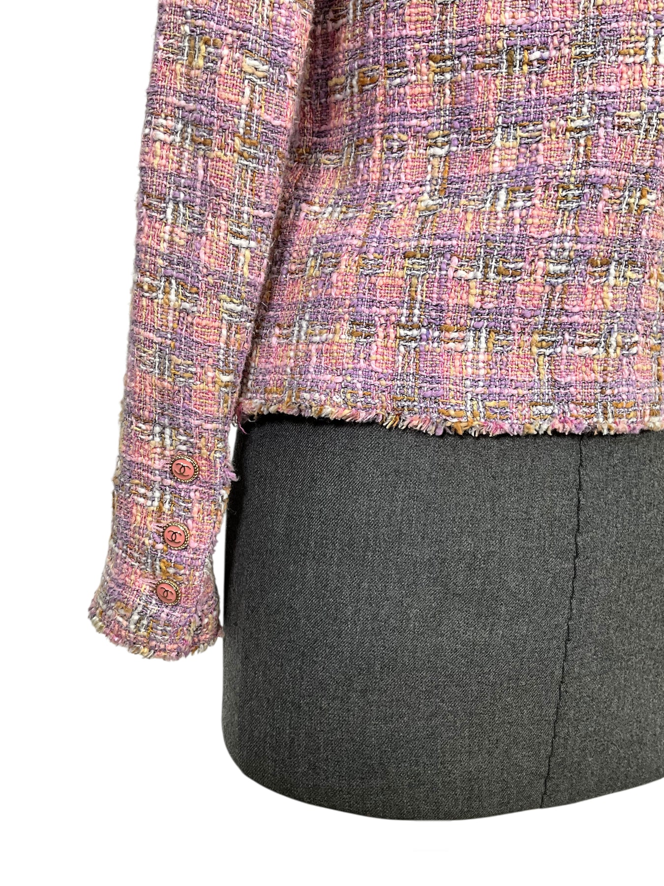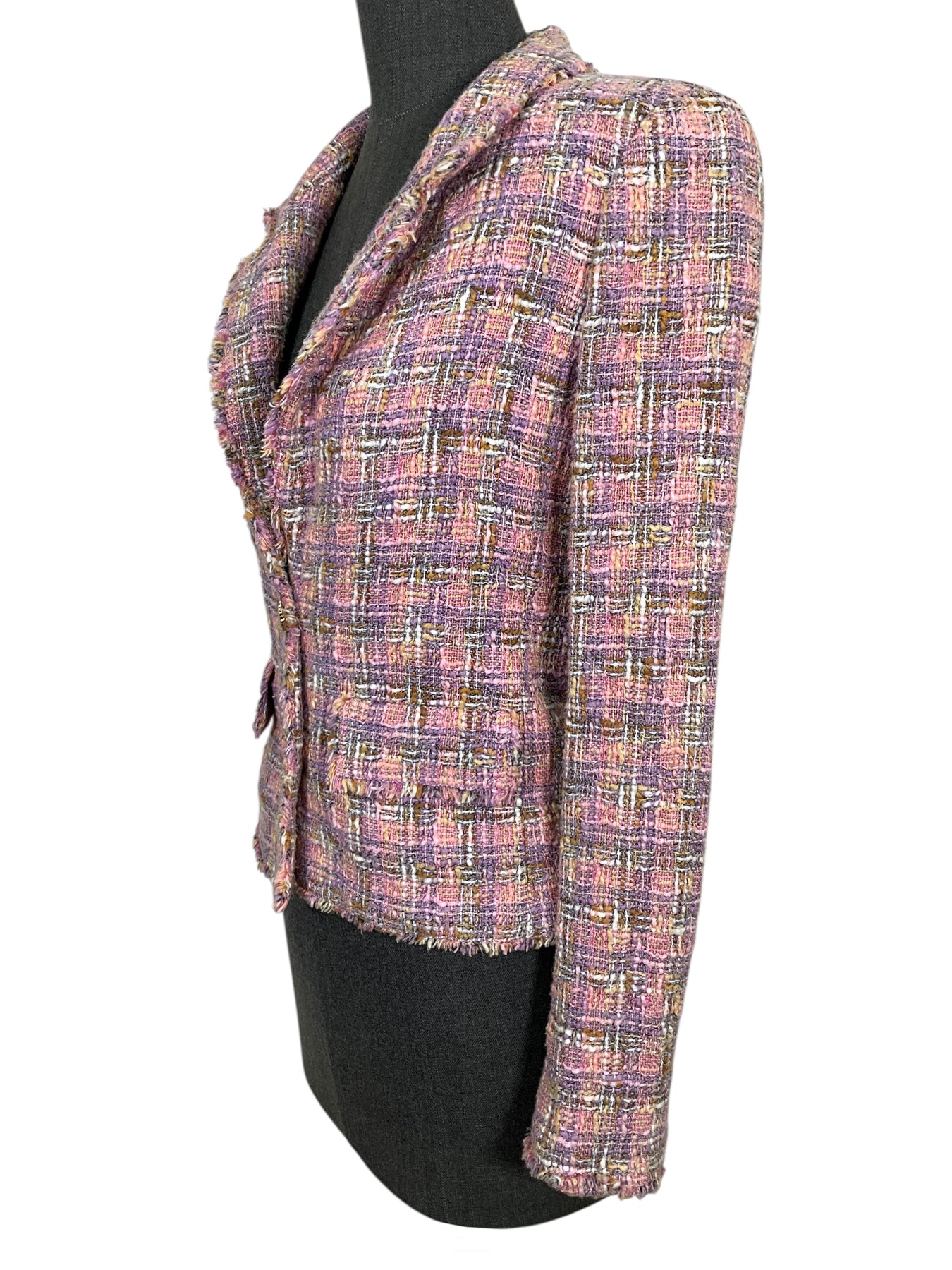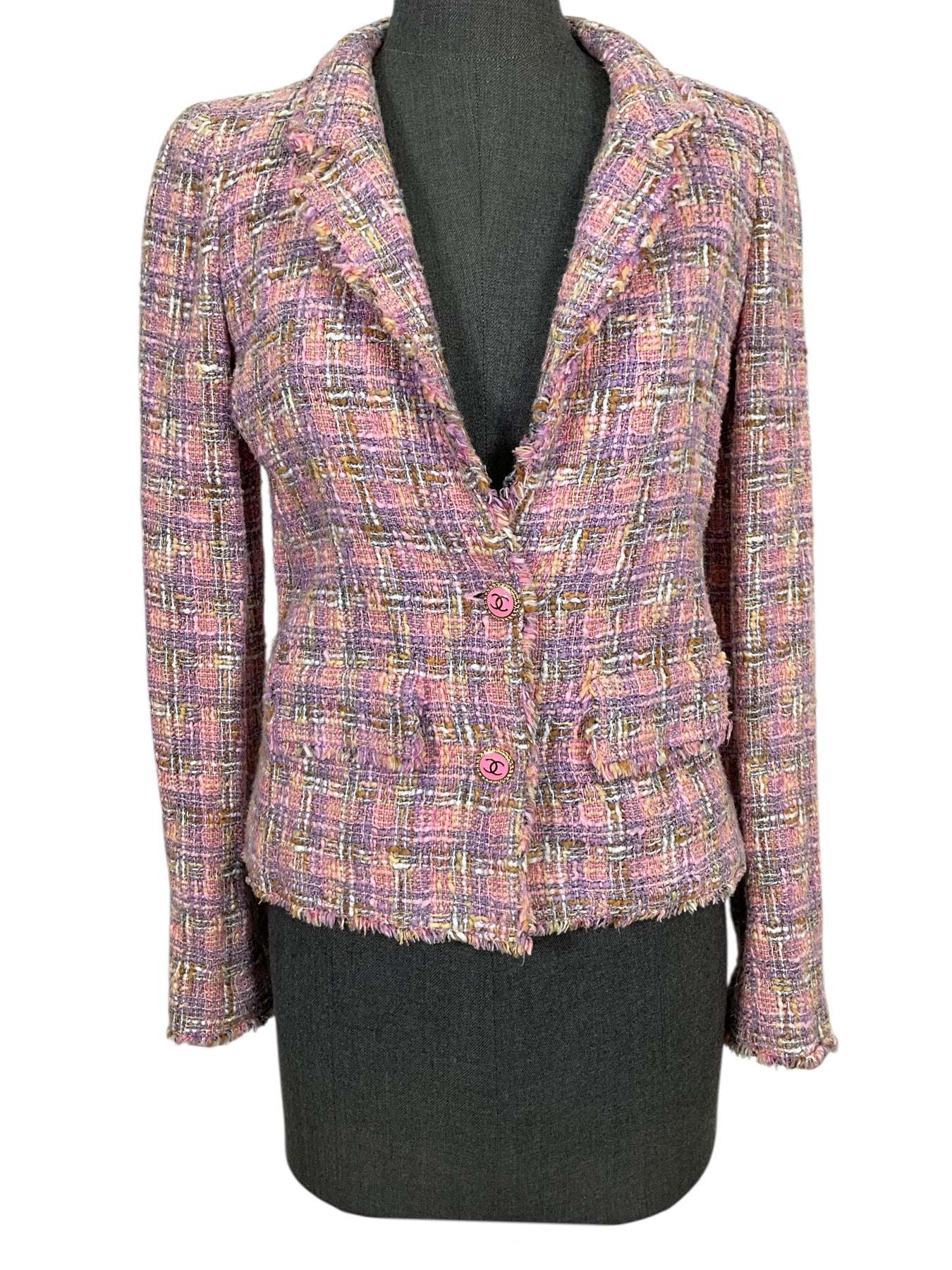 Prepare to turn heads with this gorgeous authentic CHANEL 05P Frayed Trim Tweed Jacket Size S crafted from a beautiful pink and purple plaid tweed. Featuring a notched lapel collar, two flap pockets and secure CC logo button closures.