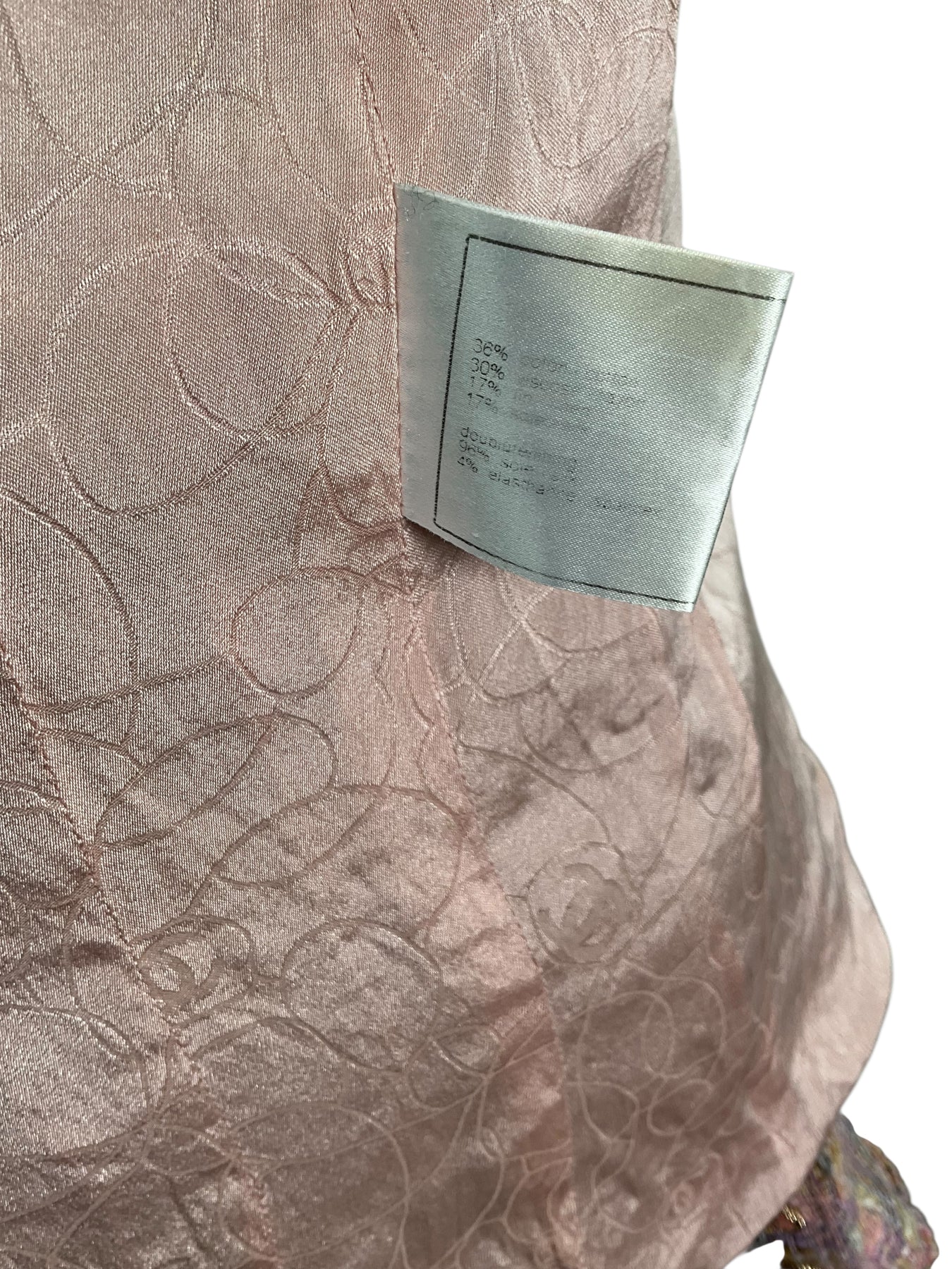 Condition: Very Good. No visible marks, scuffs, pulls or signs of wear on the exterior. *The Camellia silk lining has mild tearing and staining at the armpits.