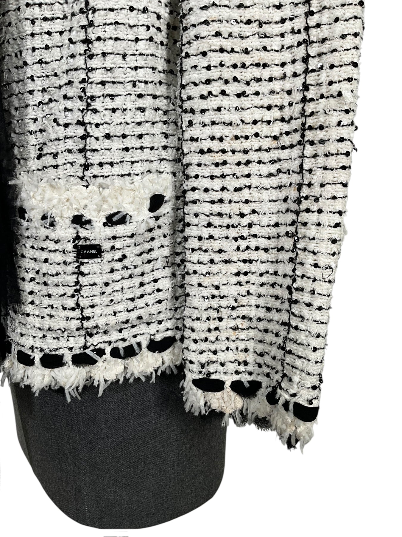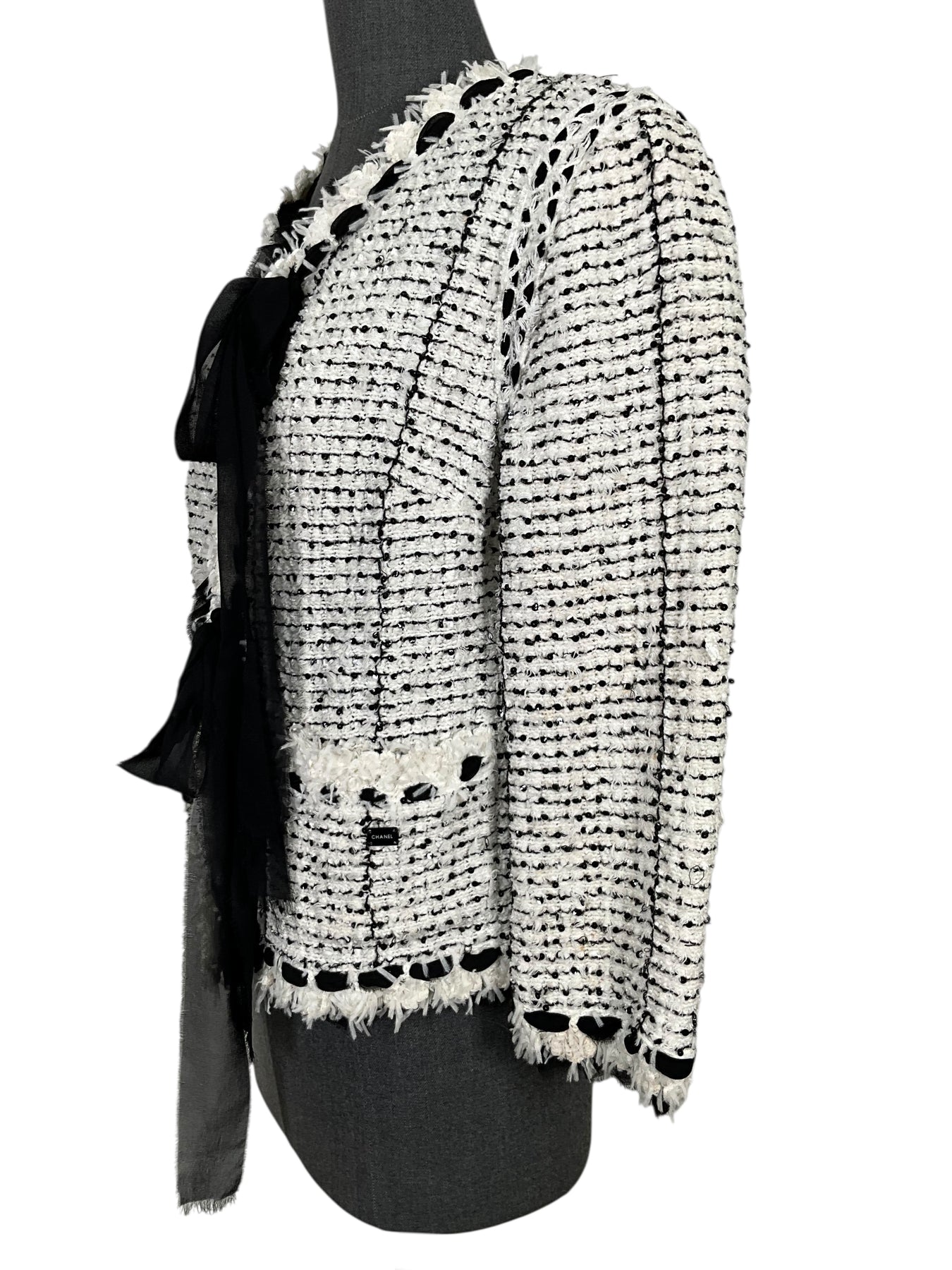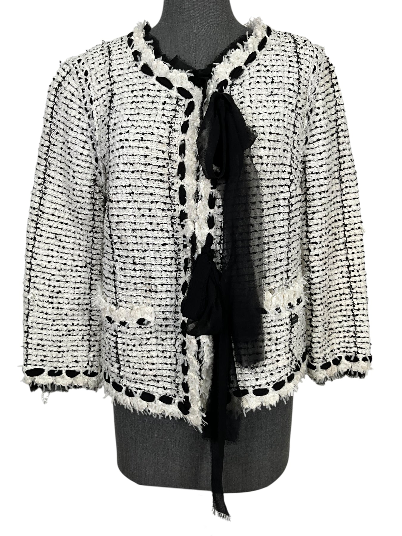 Prepare to turn heads with this gorgeous authentic CHANEL 05P Tweed Jacket Size XL from Spring 2005 Collection. Beautifully crafted from white chenille with black stripes and a black chiffon fringe trim.