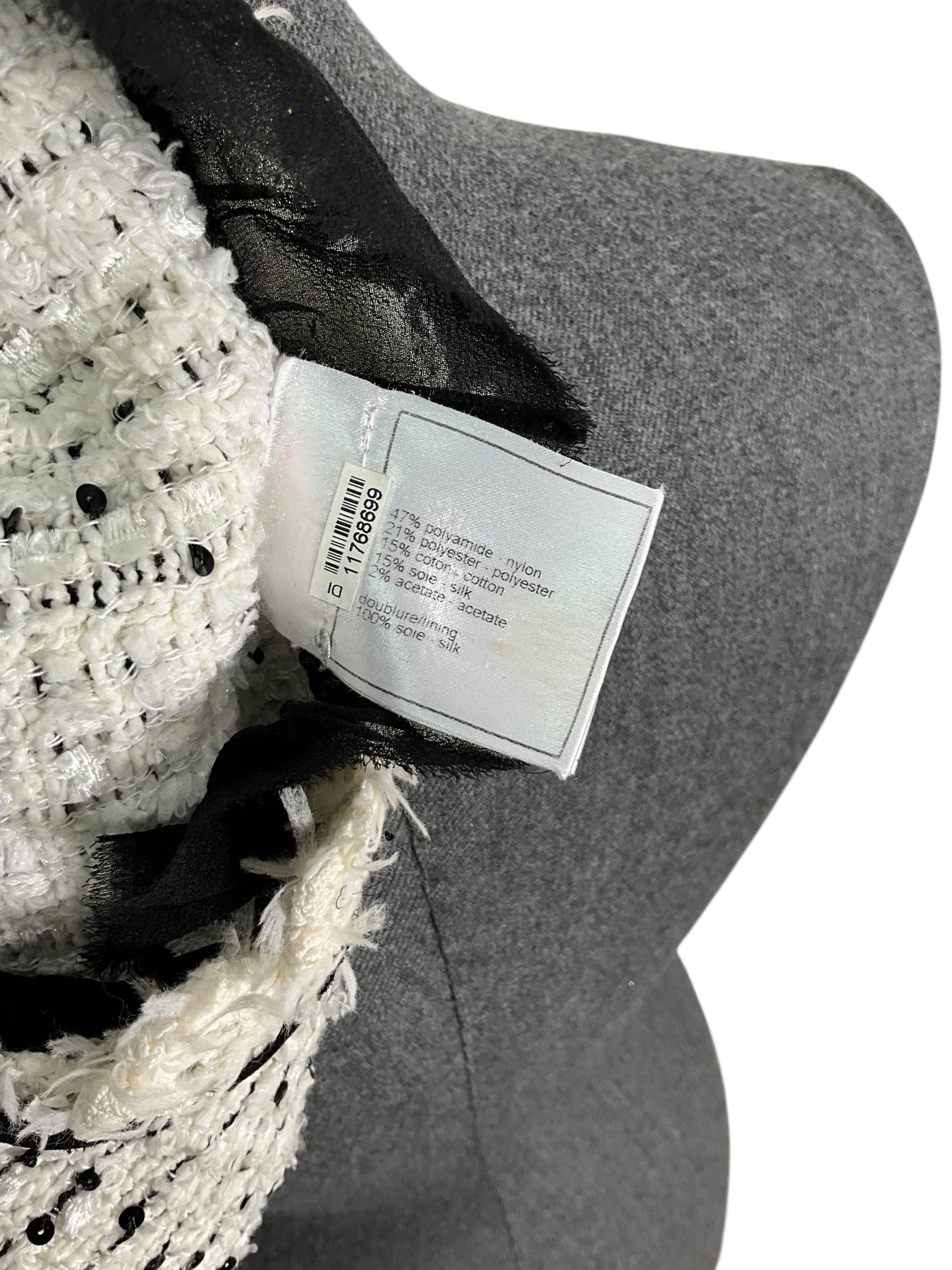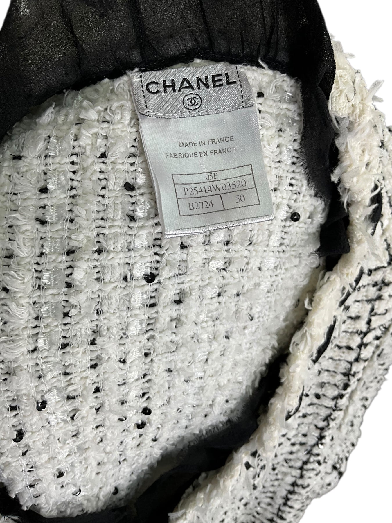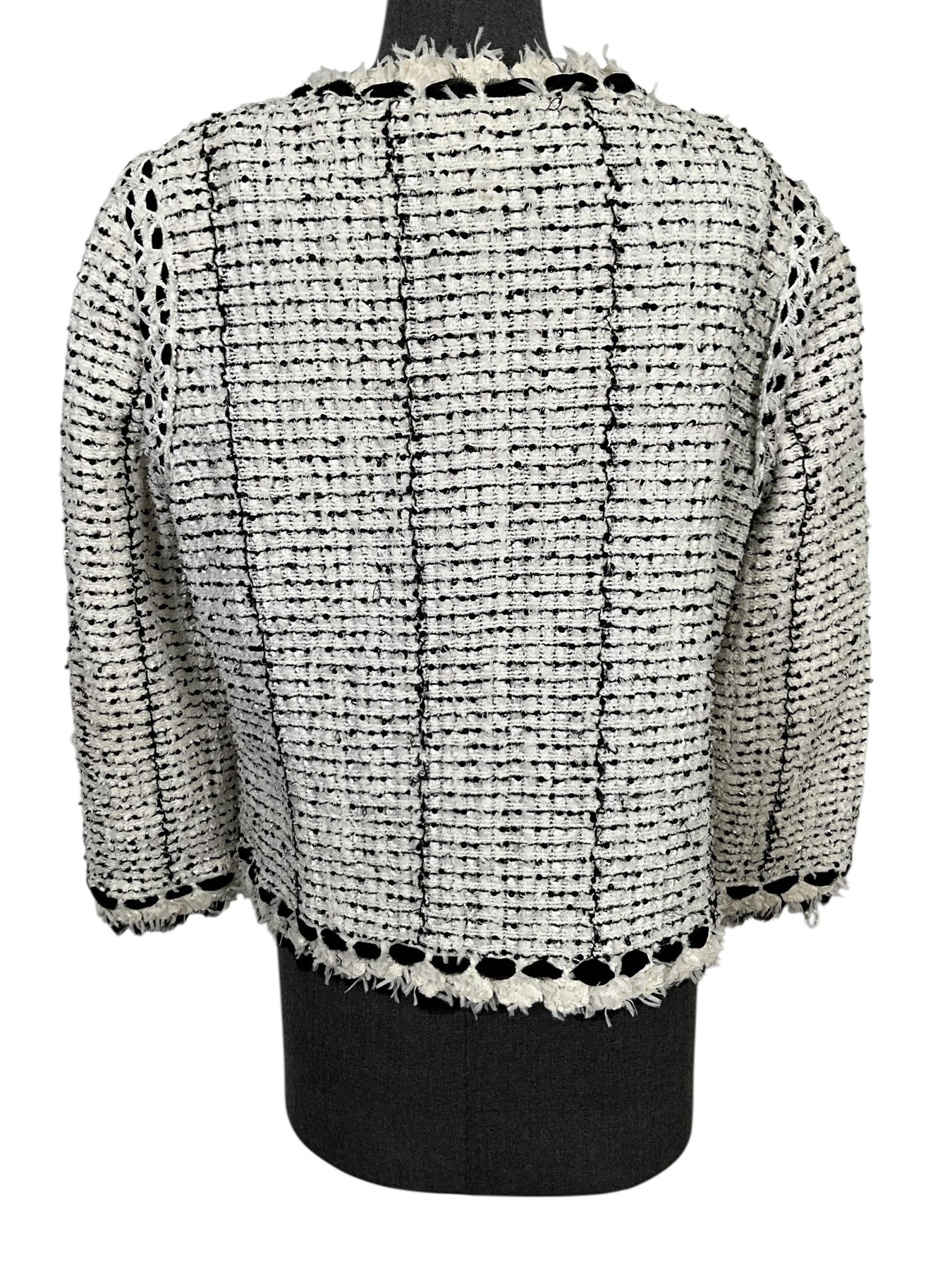 Prepare to turn heads with this gorgeous authentic CHANEL 05P Tweed Jacket Size XL from Spring 2005 Collection. Beautifully crafted from white chenille with black stripes and a black chiffon fringe trim.