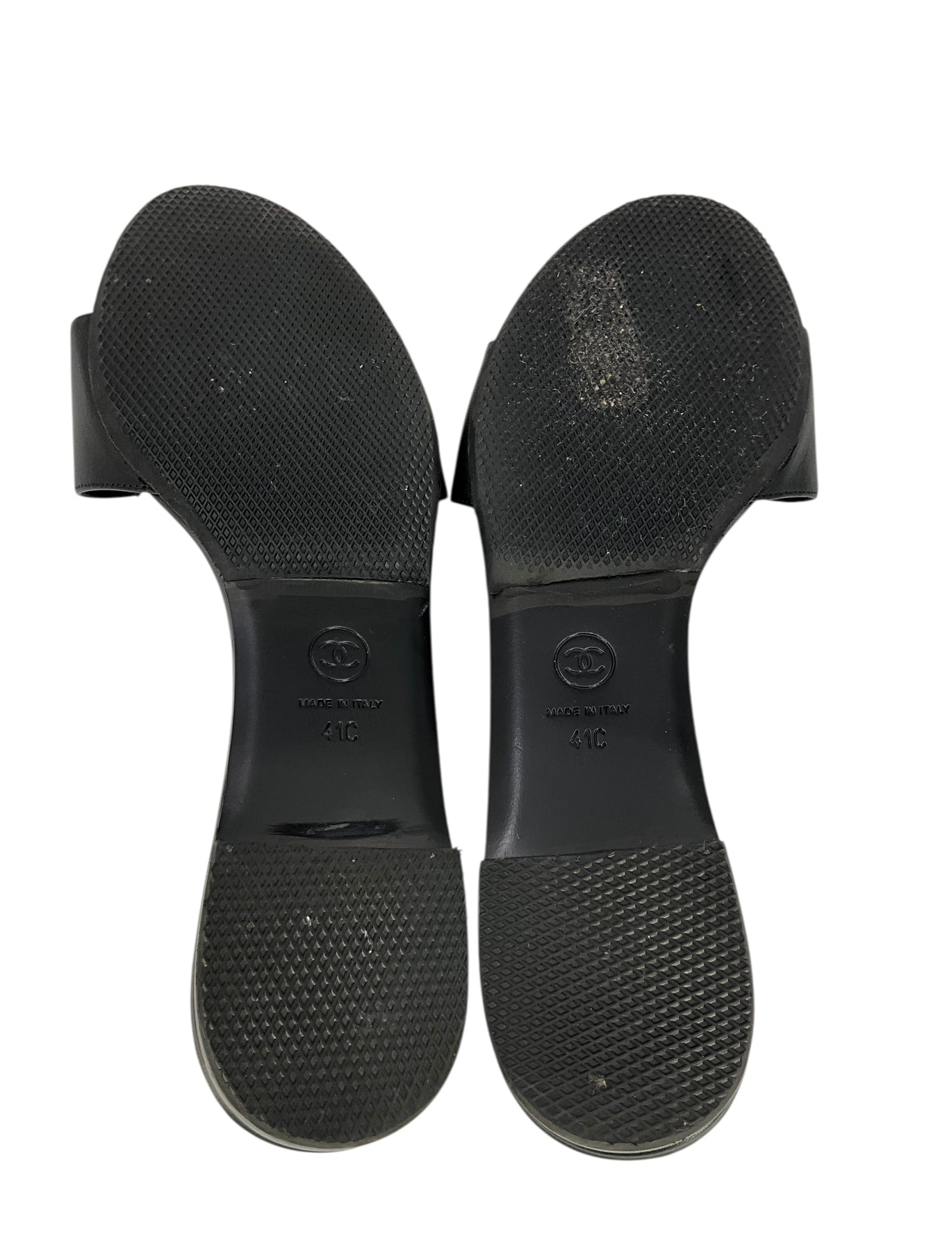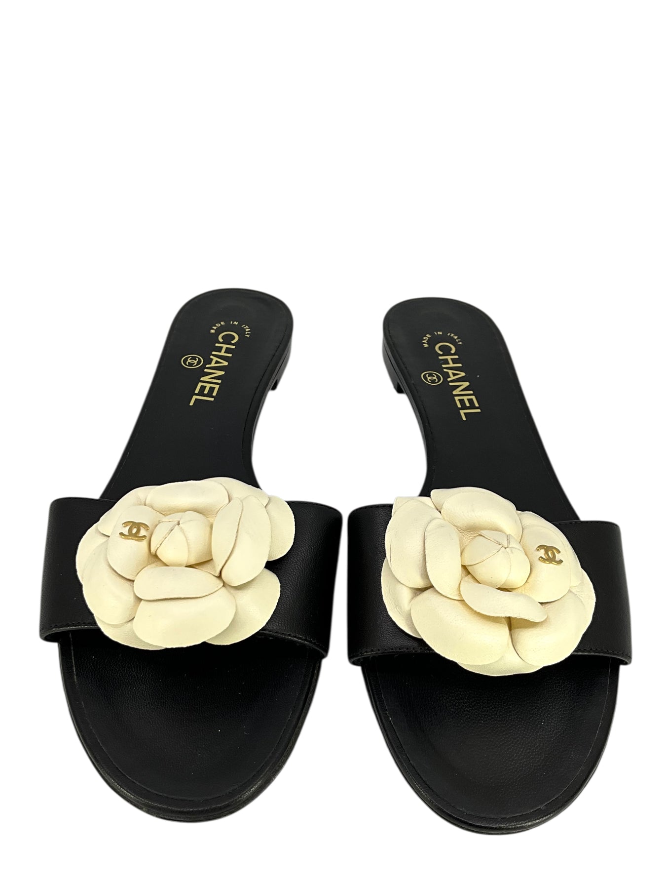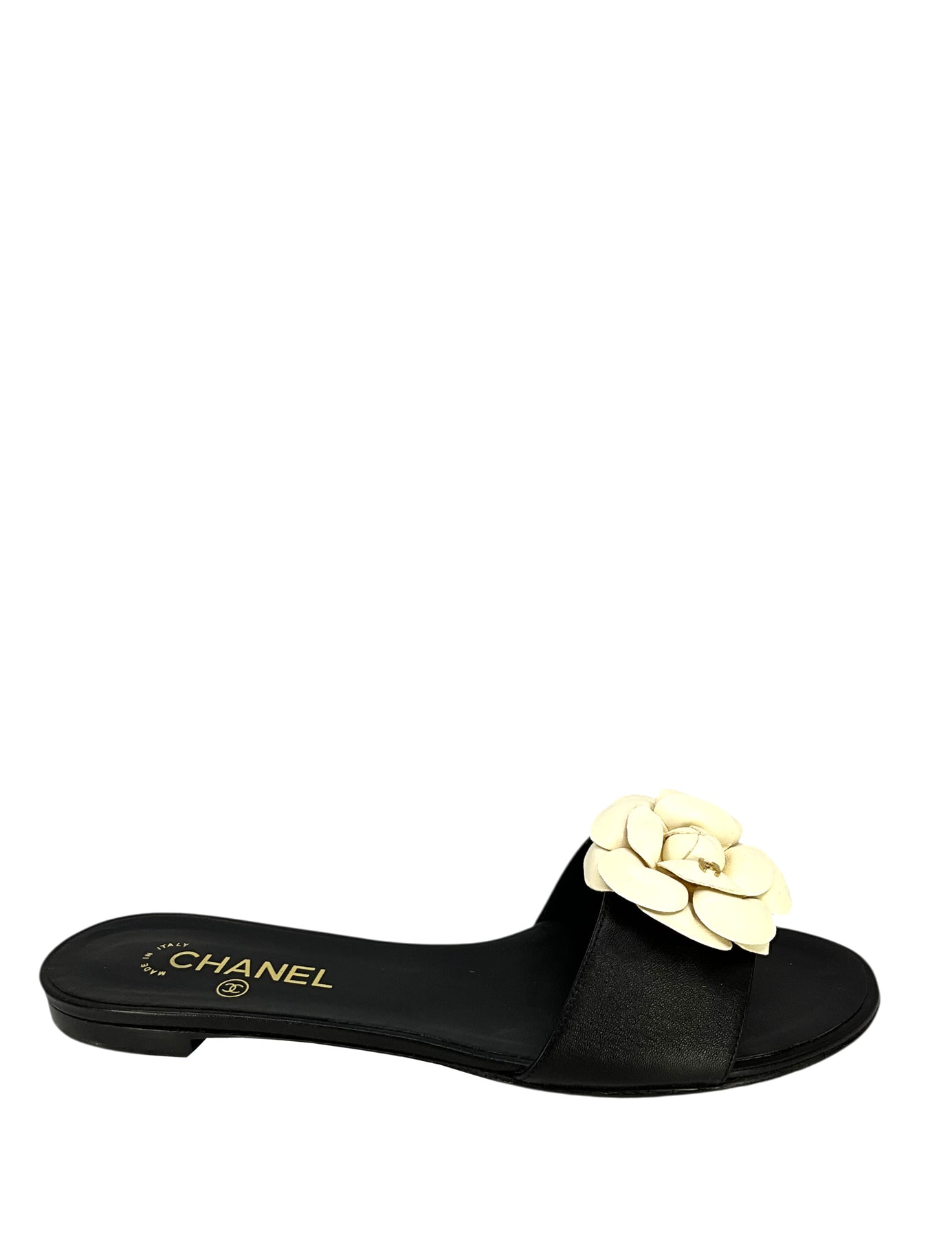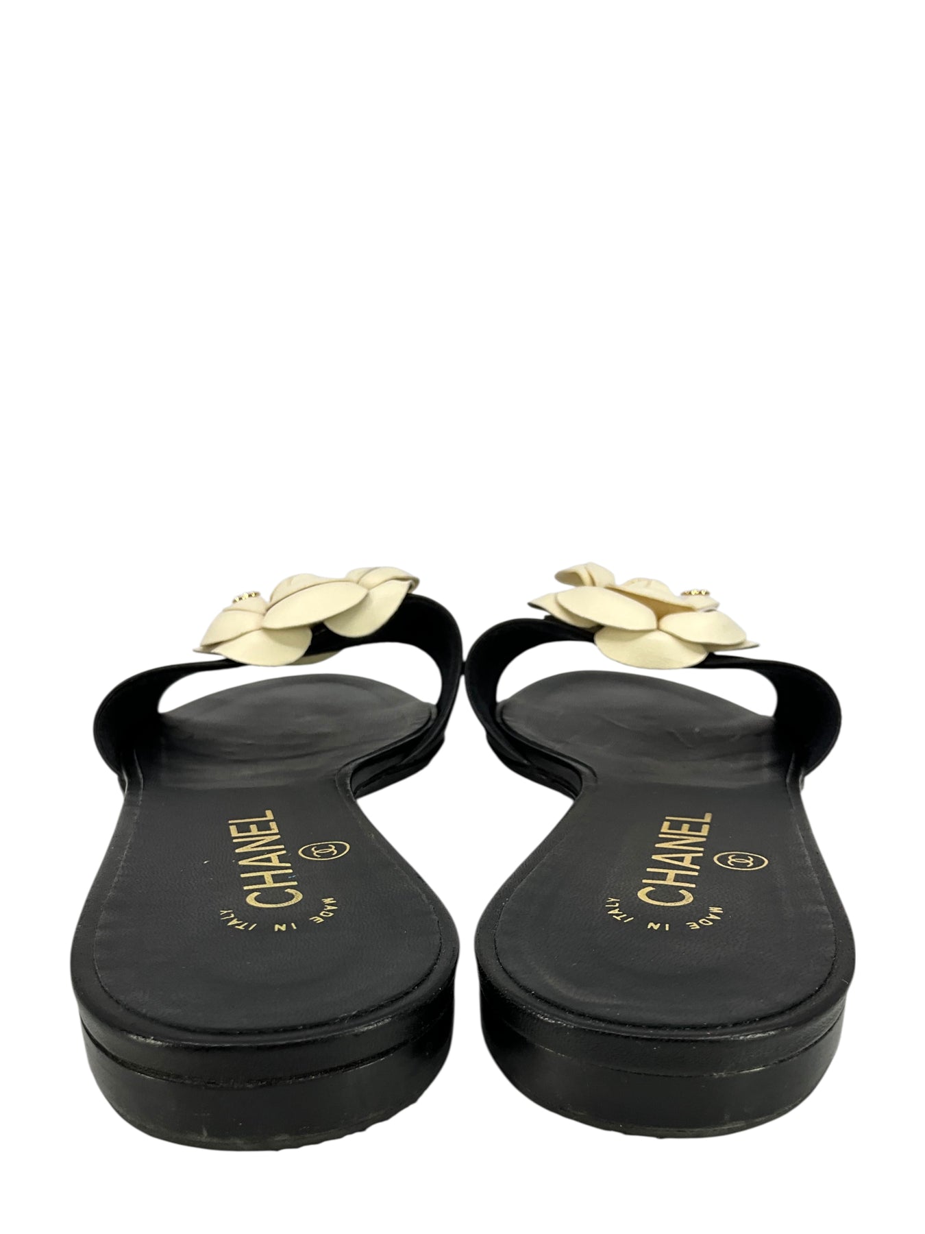 This is an authentic pair of Chanel 13P Leather Camellia Flower Mule Sandals Size 11. These iconic sandals are crafted from supple black leather uppers with a signature CC Camellia flower on the vamp. The perfect shoe you can dress up or down with ease, only from Chanel!