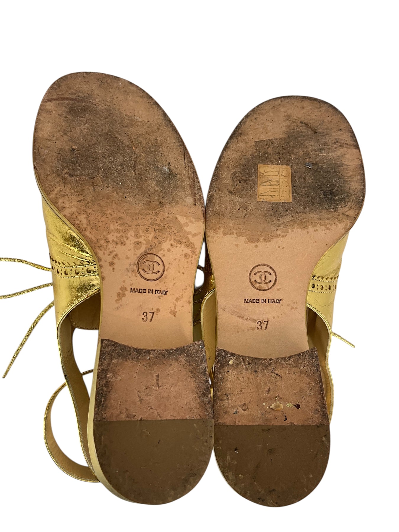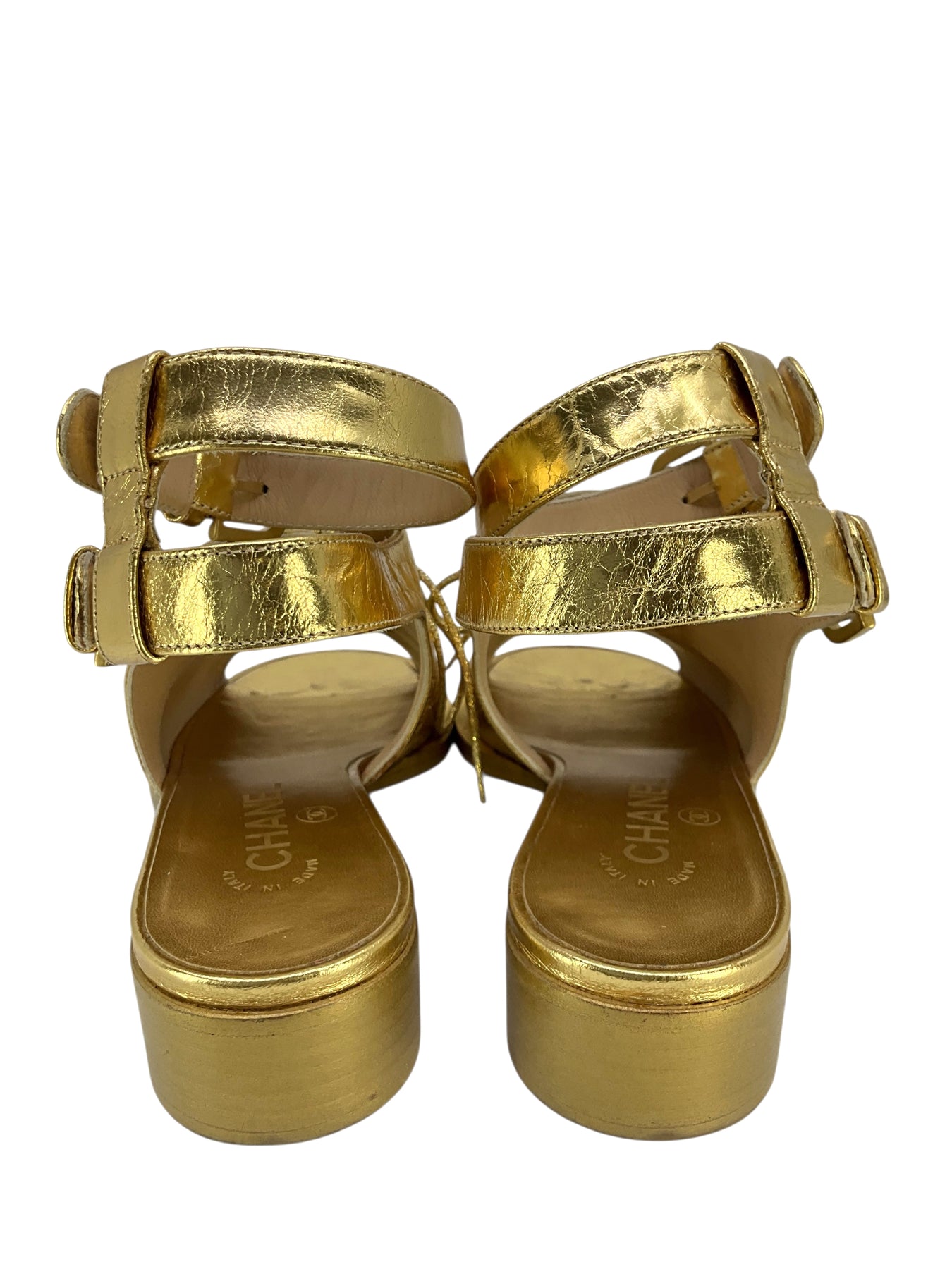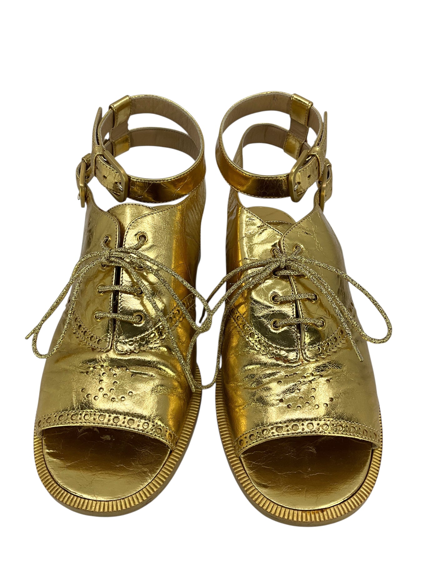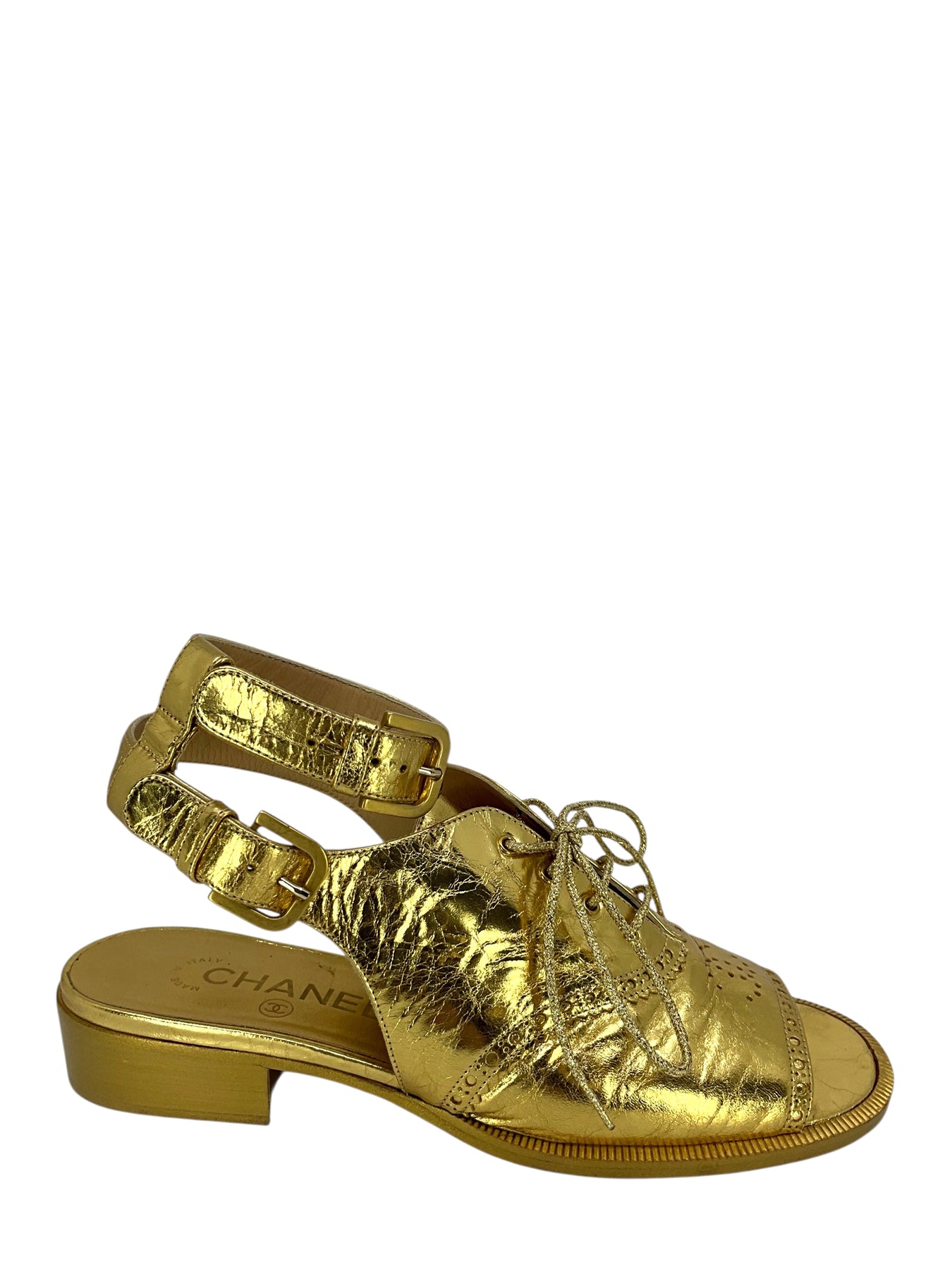 We guarantee the authenticity of these Chanel 15S Leather CC Brogue Lace Up Ankle Strap Sandals Size 7 crafted from crinkled metallic gold leather. Featuring adjustable ankle straps and a perforated CC logo at the vamp.