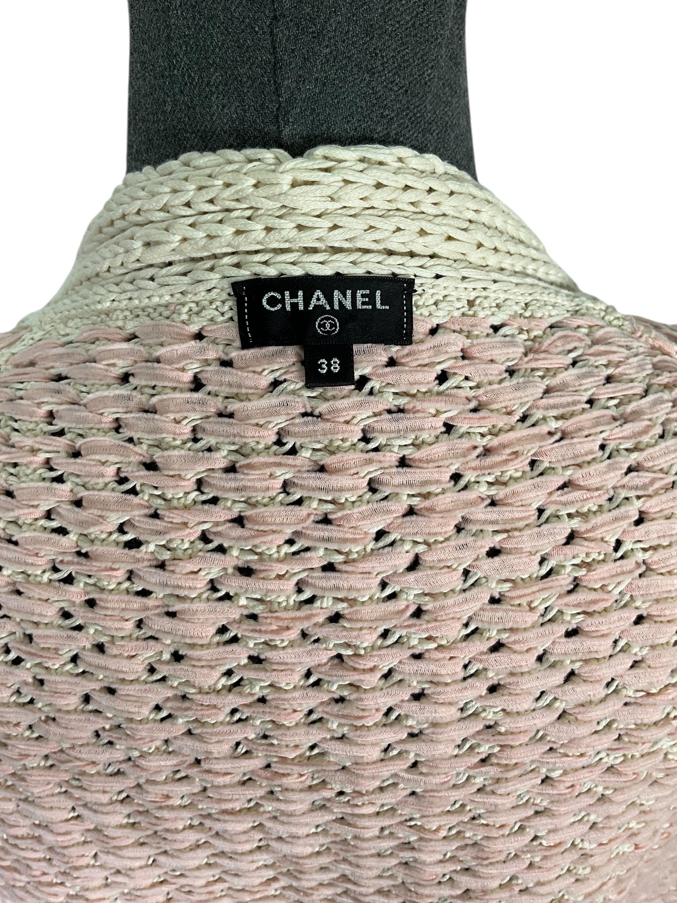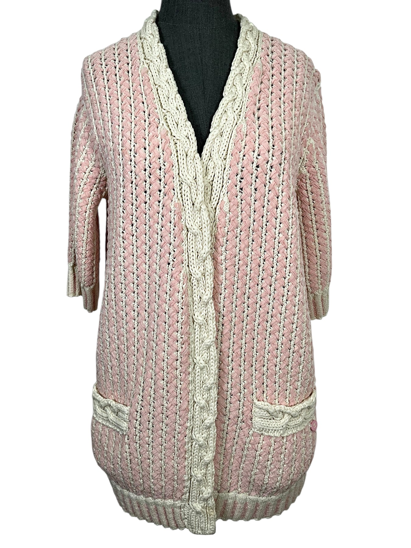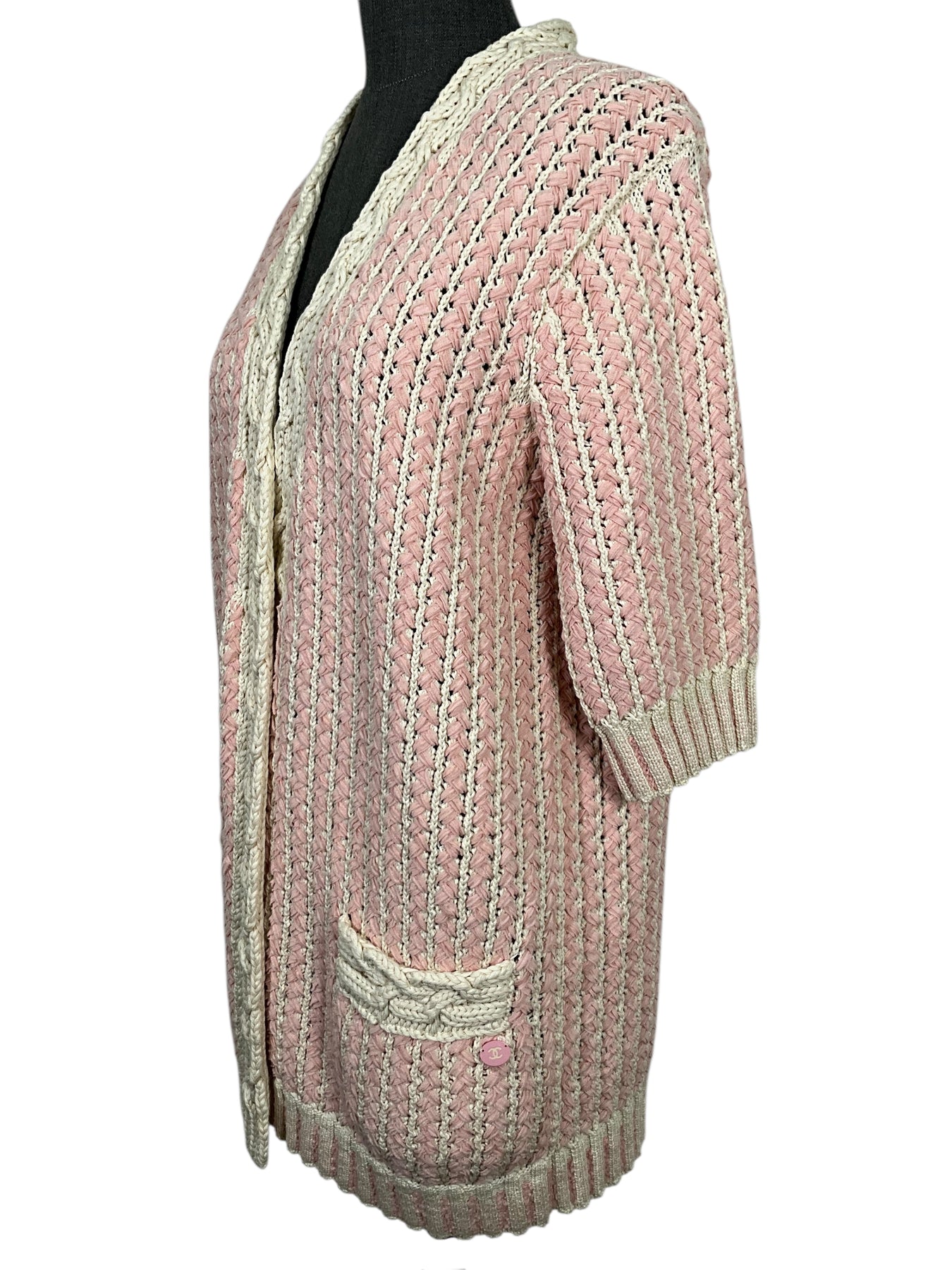 We guarantee the authenticity of this Chanel Cotton Knit Cardigan Sweater Size M expertly crafted from a beautiful pink cotton with an ivory braided trim and two lower-front patch pockets.