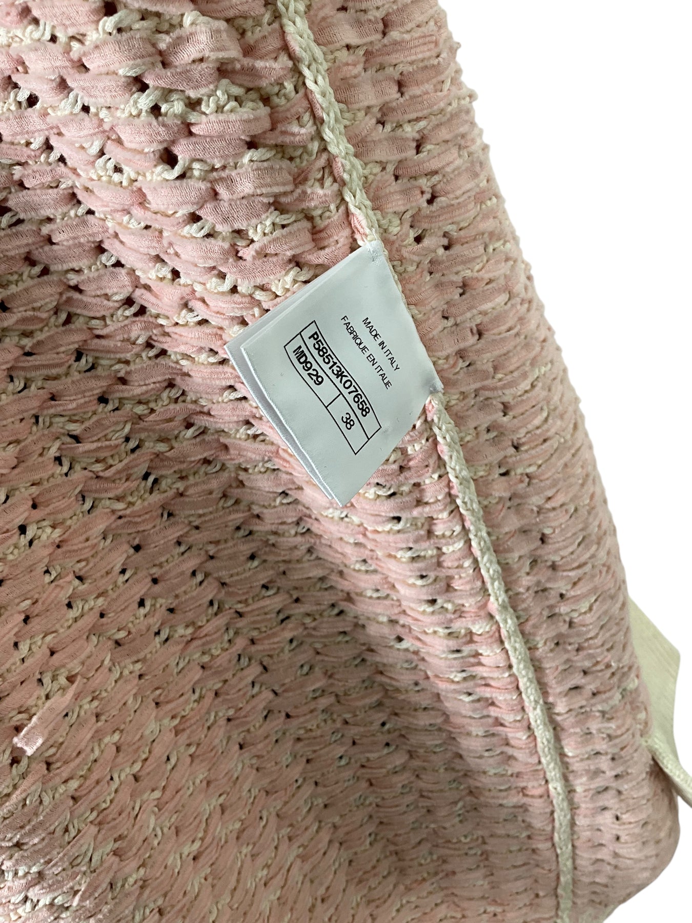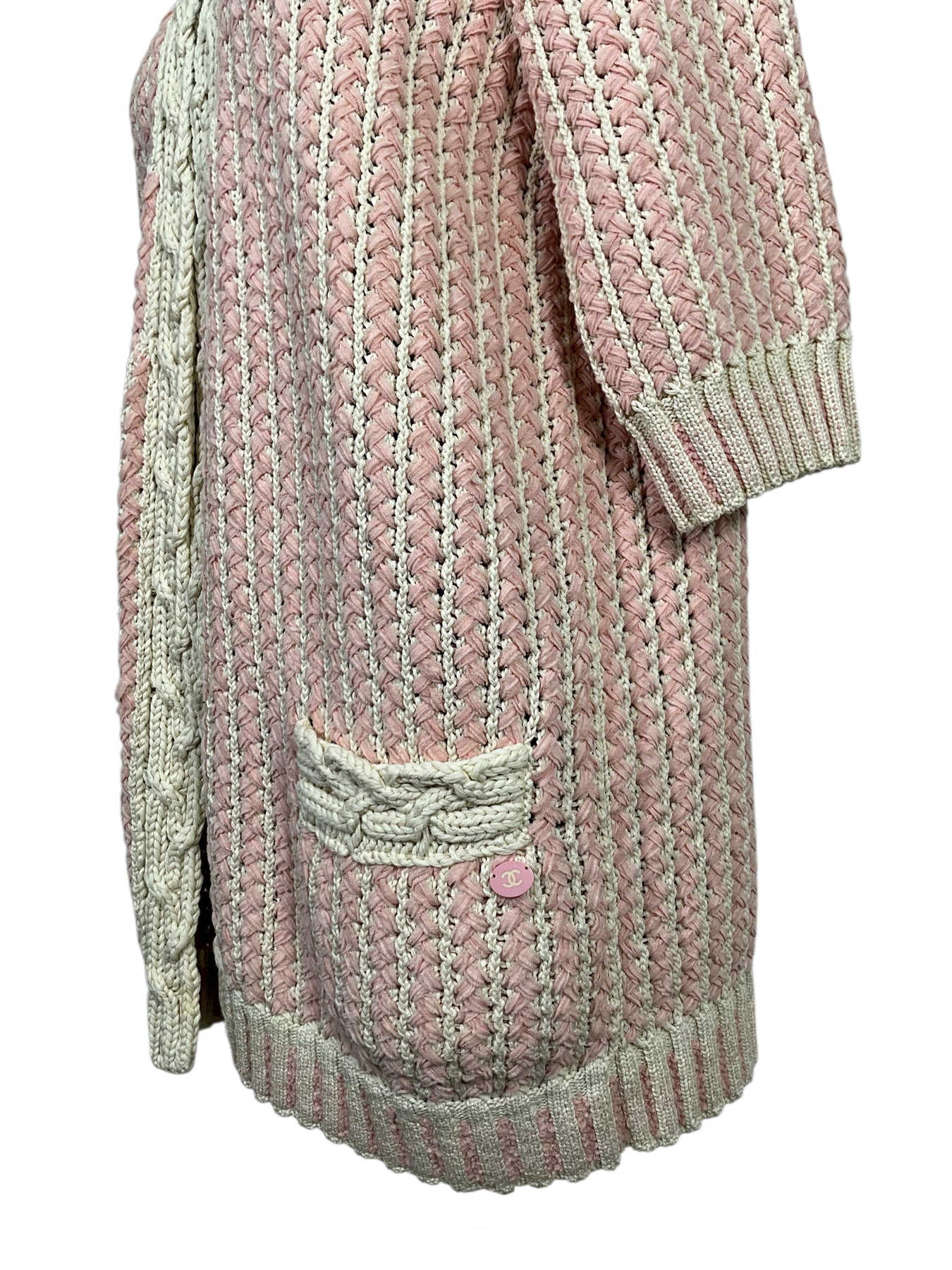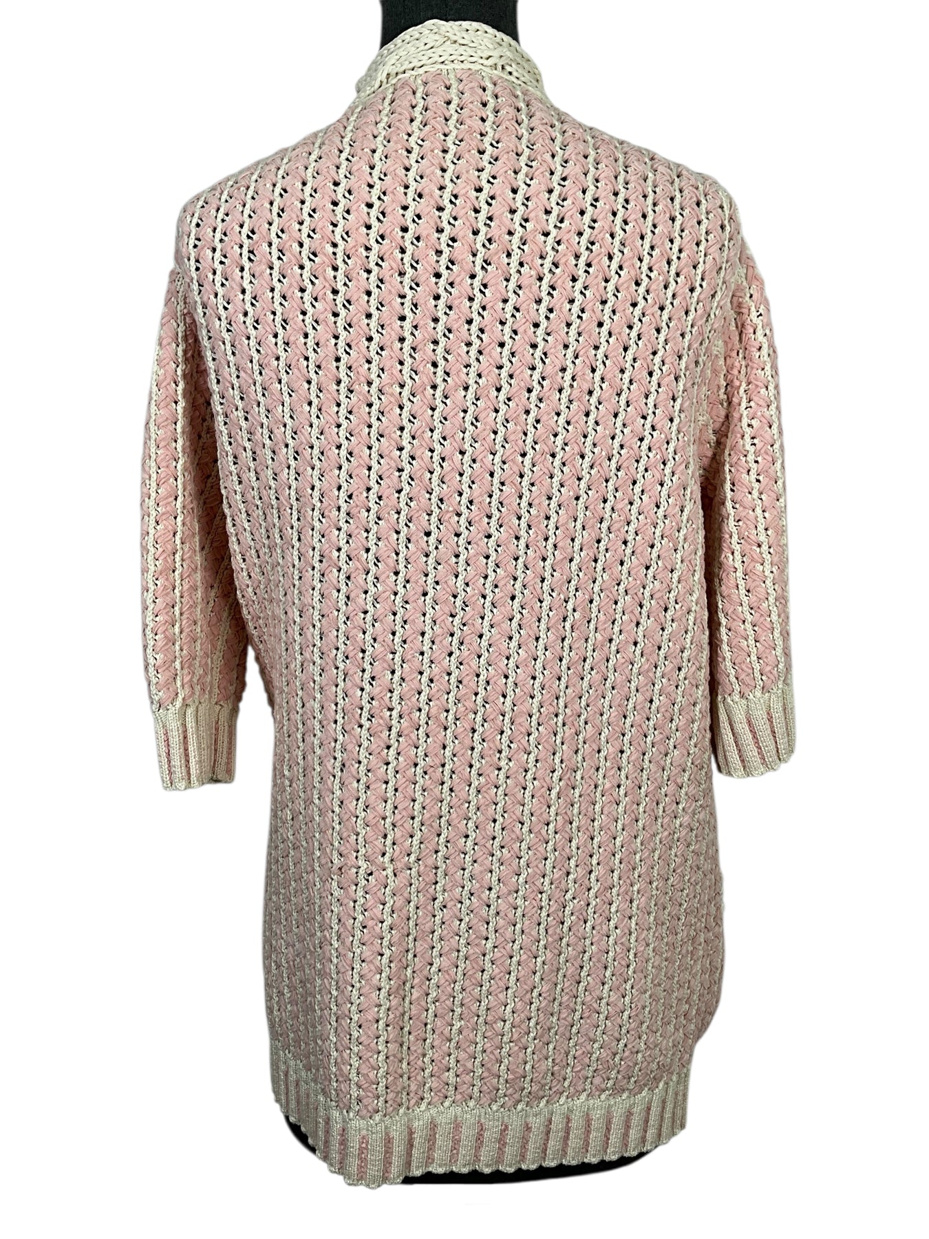We guarantee the authenticity of this Chanel Cotton Knit Cardigan Sweater Size M expertly crafted from a beautiful pink cotton with an ivory braided trim and two lower-front patch pockets.