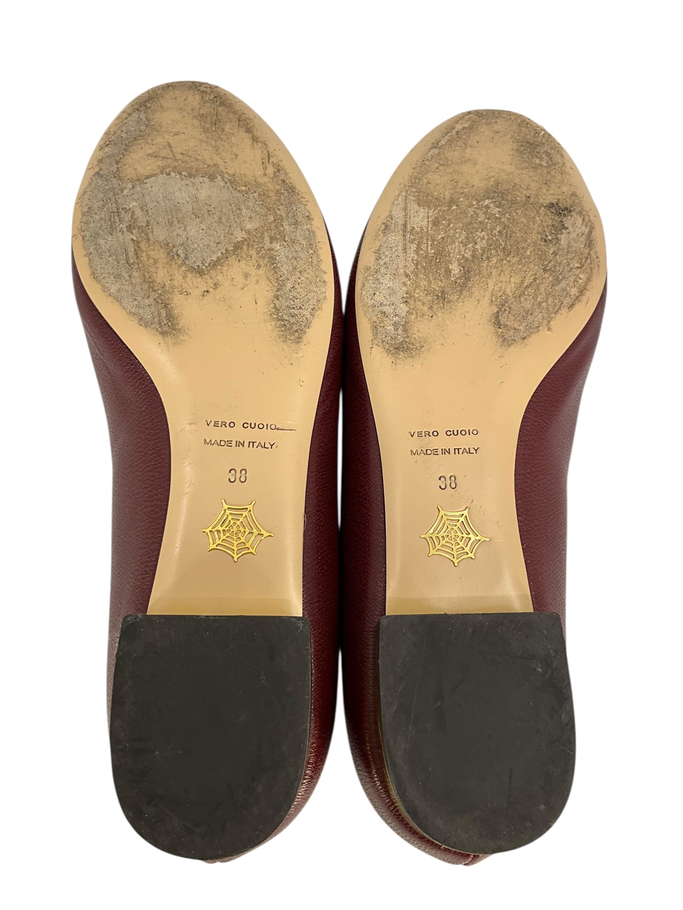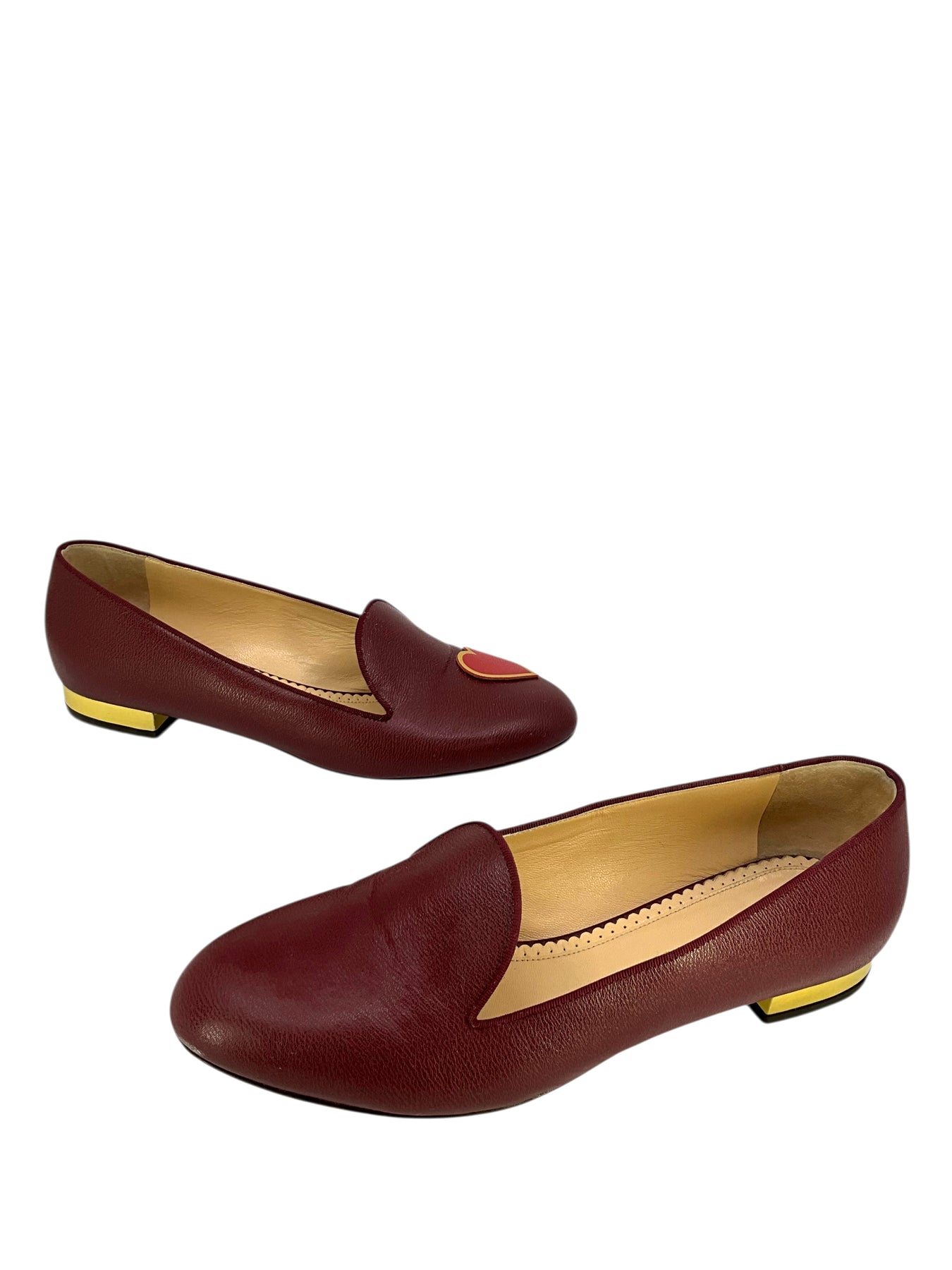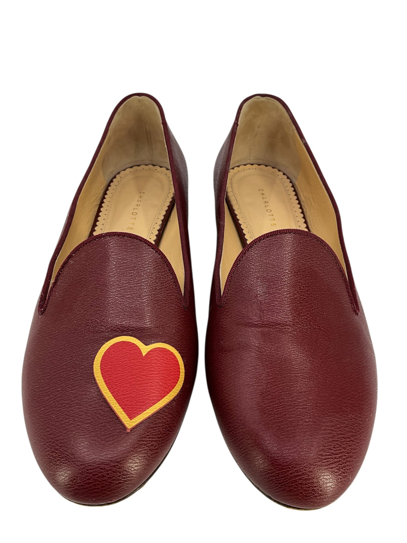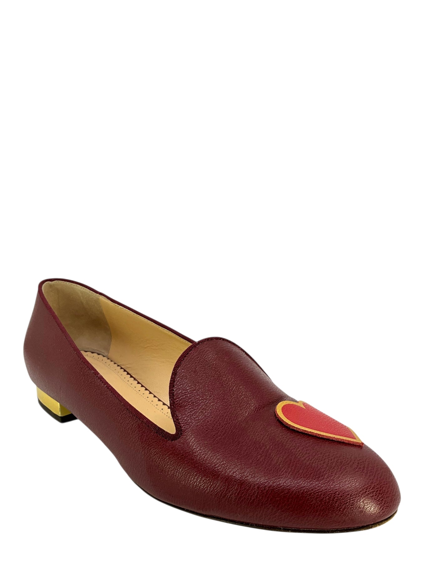 Step out in style with this current authentic pair of Charlotte Olympia ABC Heart Flats Size 8 crafted from beautiful burgundy leather uppers. Featuring a heart appliqué which accents the vamp and metallic gold accents on the chunky heel.