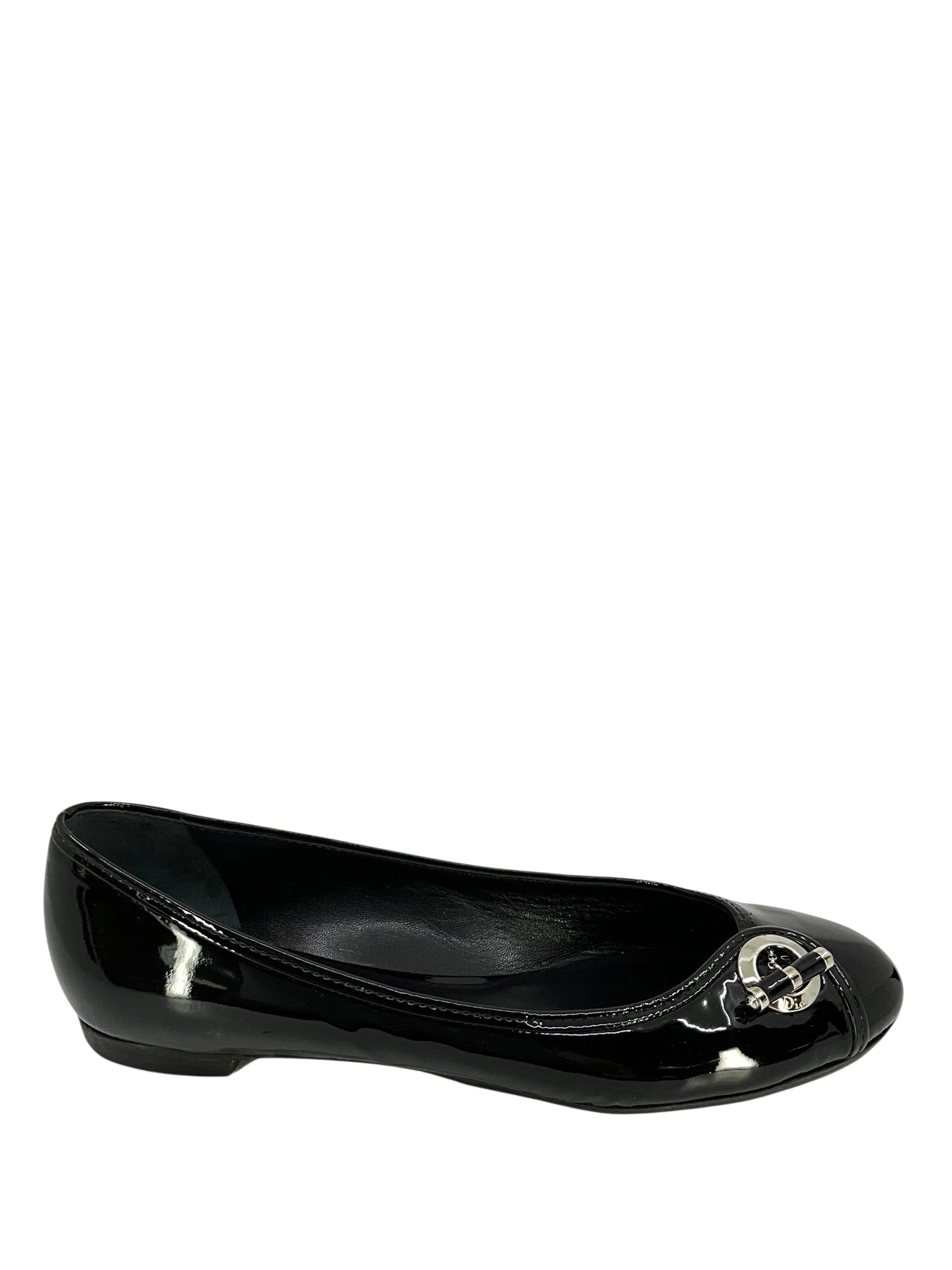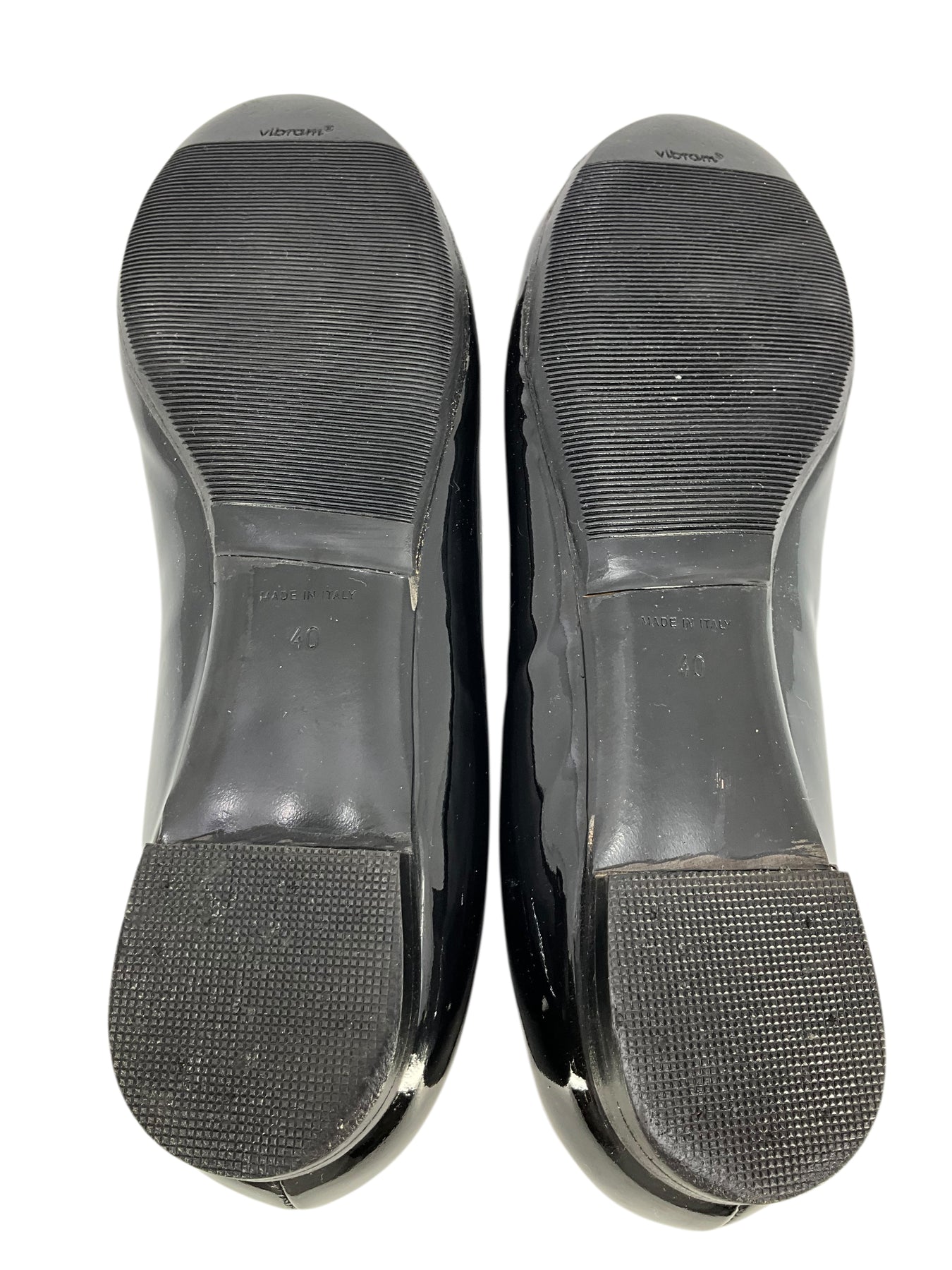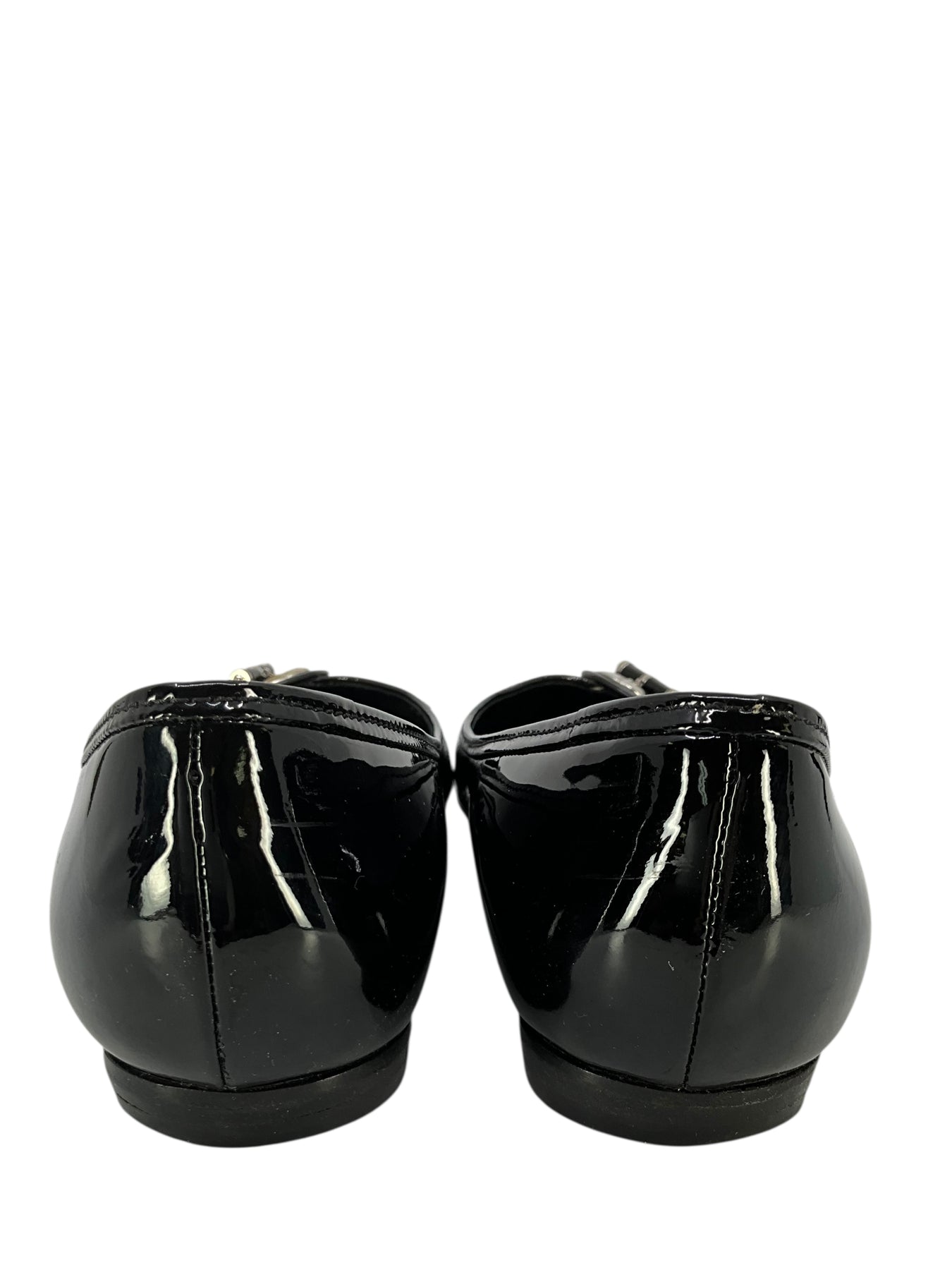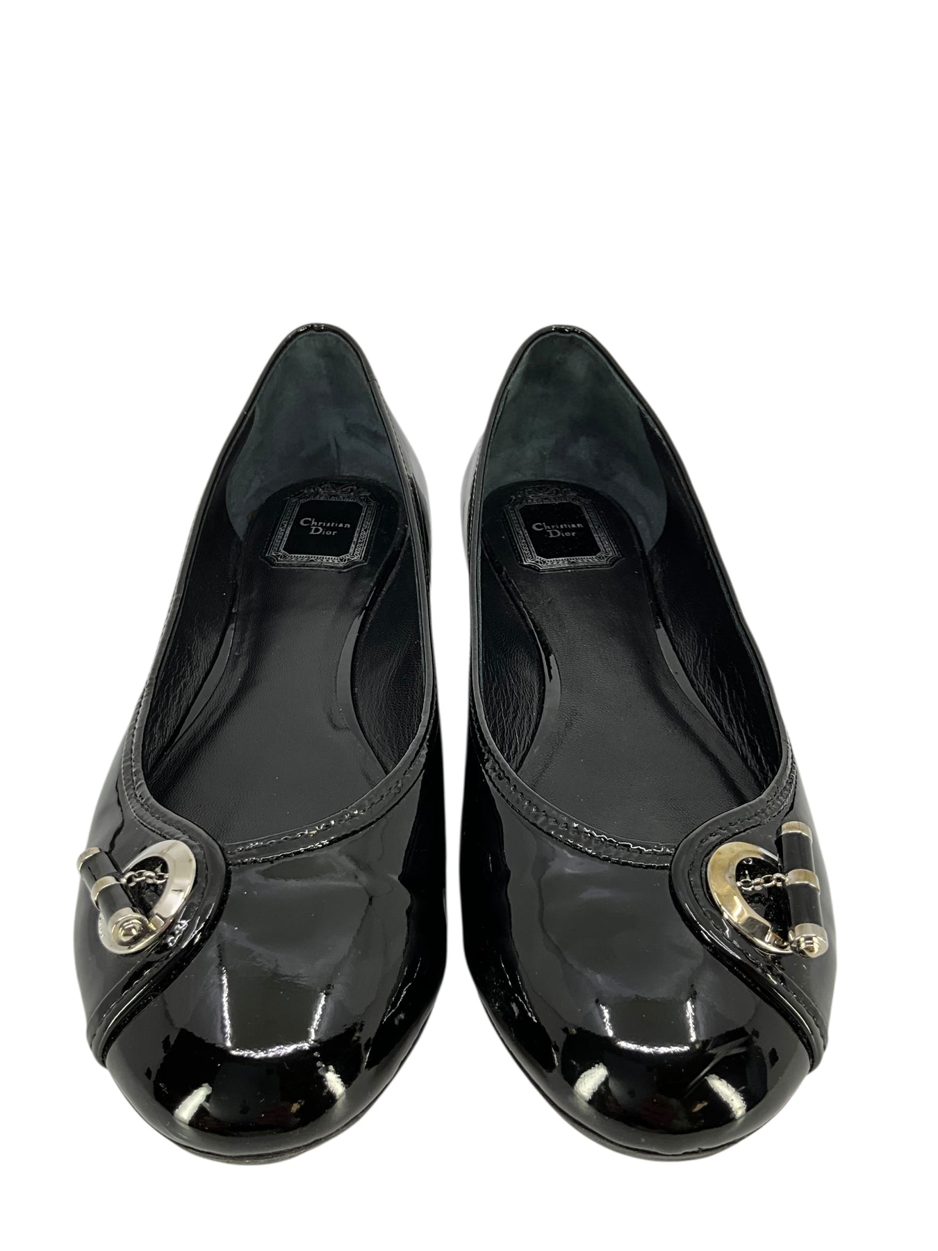Guaranteed authentic Christian Dior Patent Leather Ballet Flats Size 10 in black. Featuring a silver-tone logo-engraved buckle and a low chunky block heel.