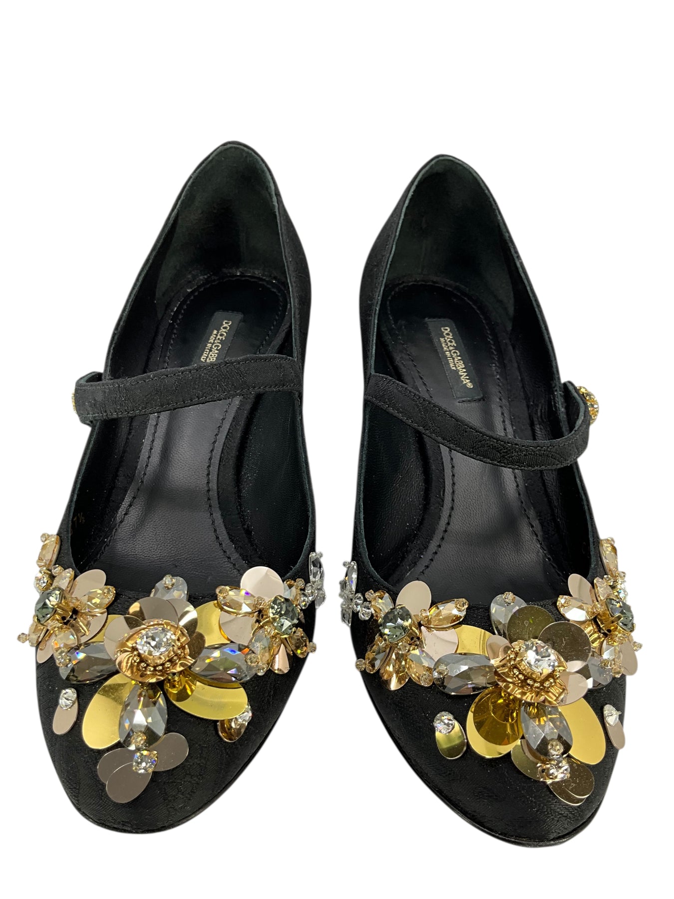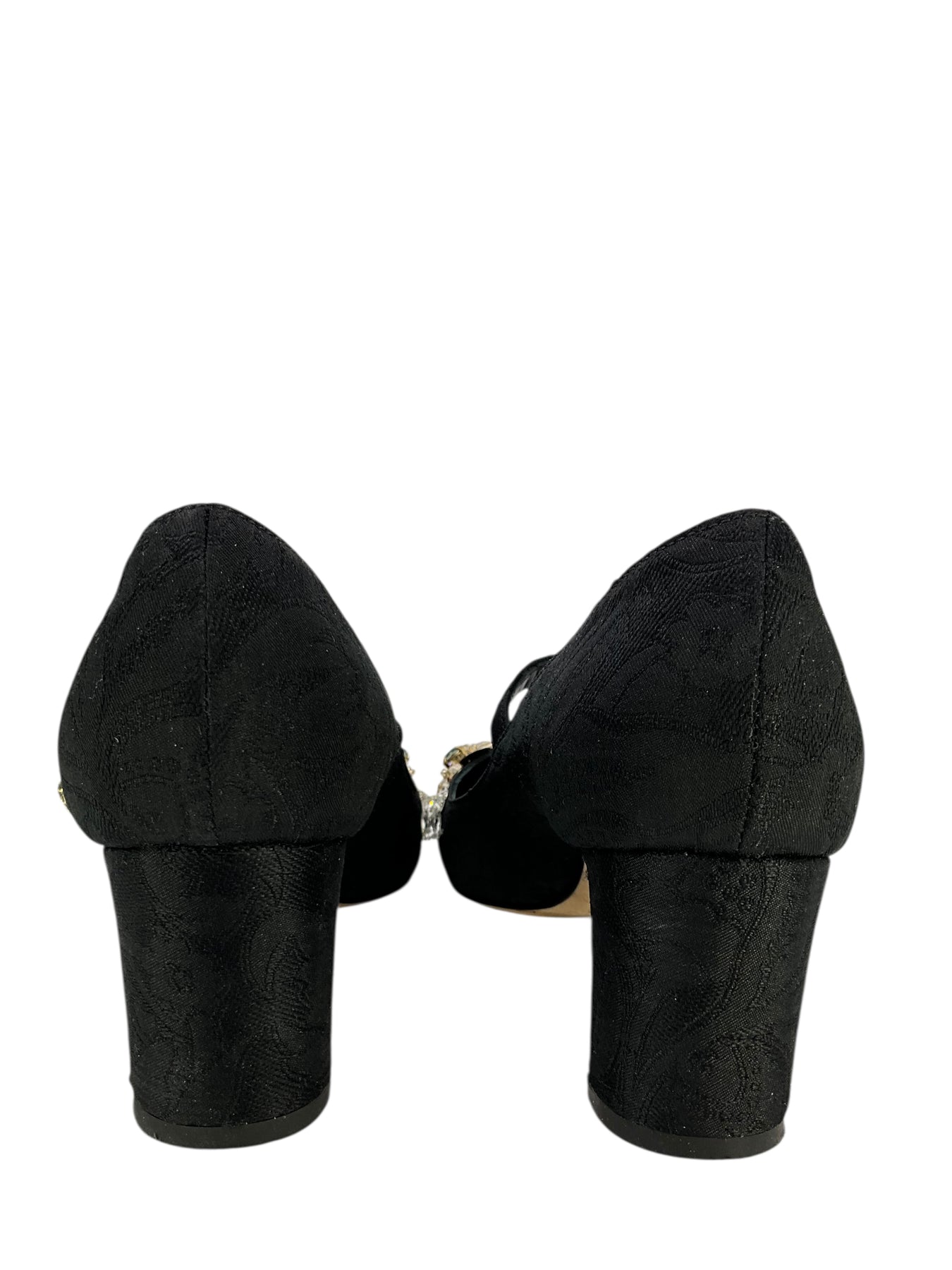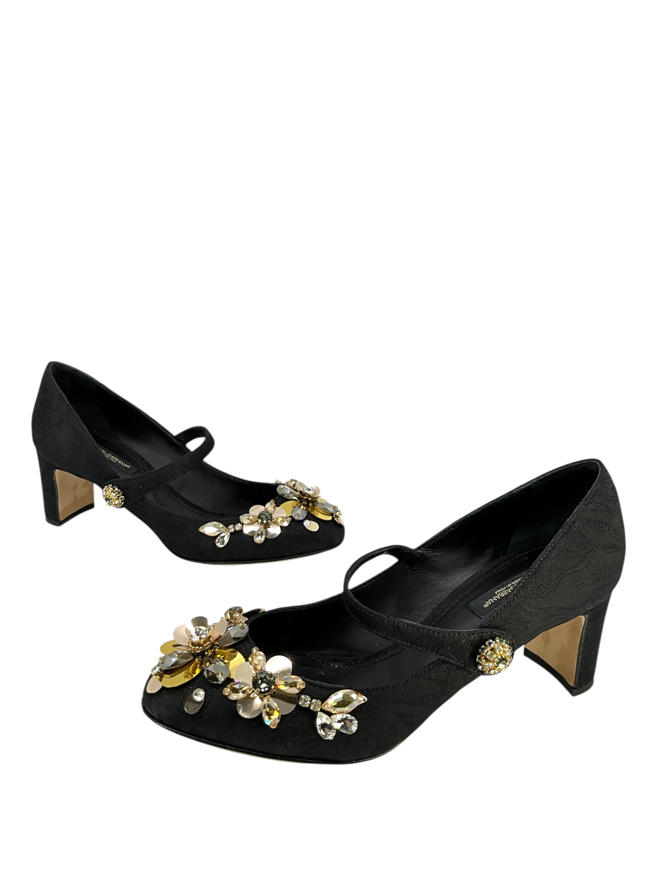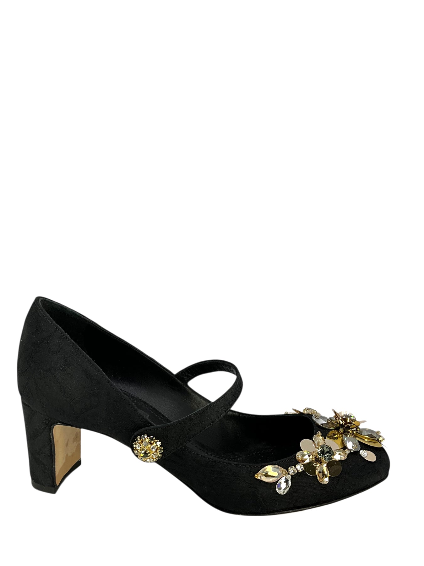 We guarantee the authenticity of these Dolce & Gabbana Embellished Brocade Mary Jane Pumps Size 7.5 in black and hand crafted in Italy. They feature crystal and sequin accents, round toes, self covered chunky heels a Mary jane cross-strap.