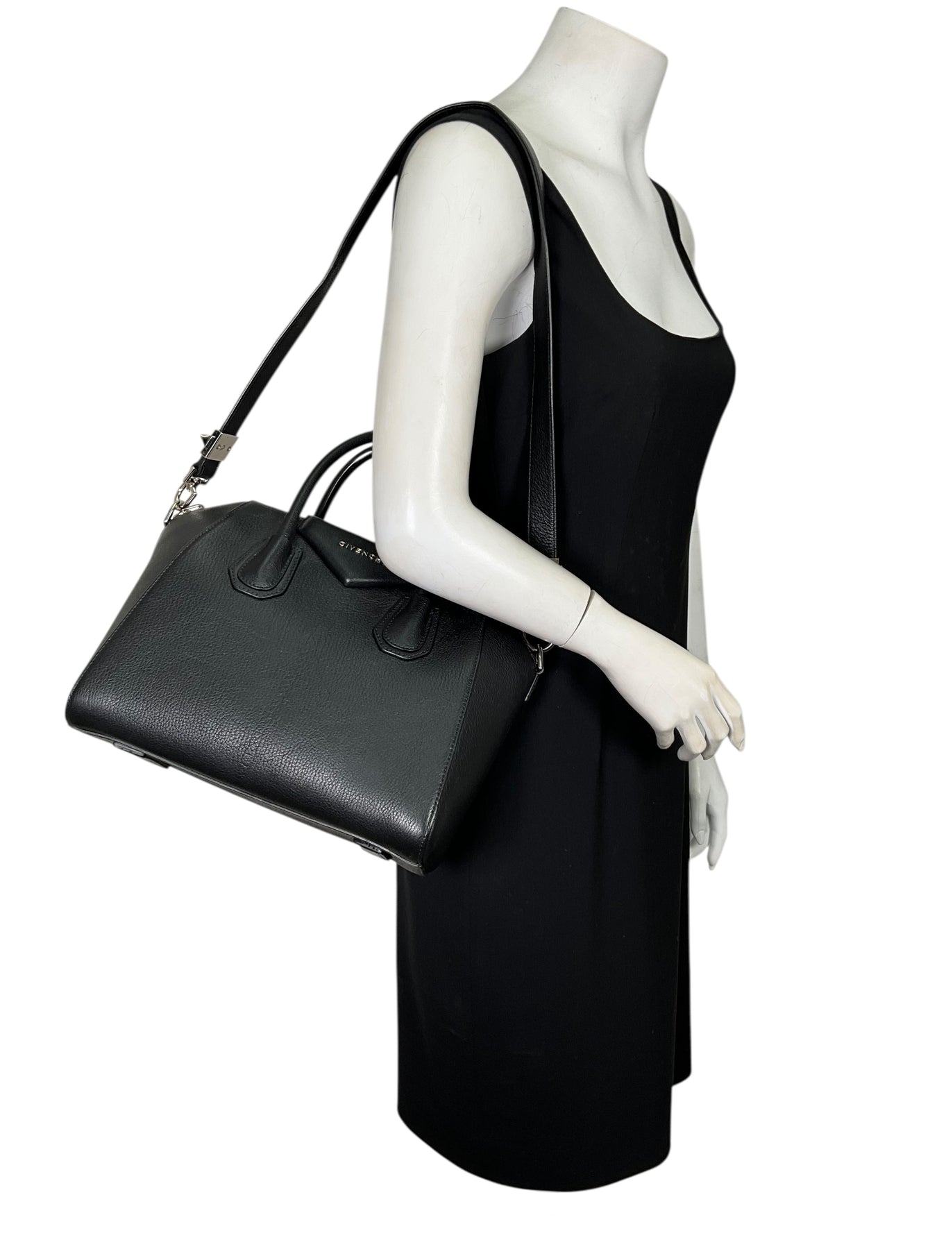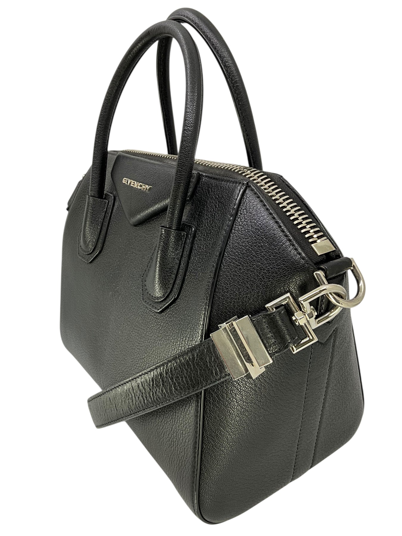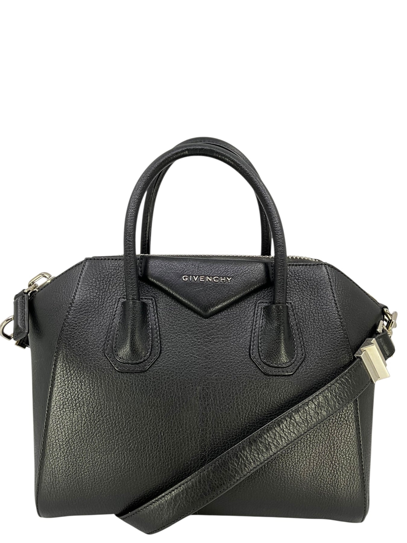 We guarantee the authenticity of this  Givenchy Leather Small Antigona Bag crafted from gorgeous black grained leather and light silver-tone hardware. Featuring rolled leather top handles, including a flat shoulder strap and an envelope flap detail at front with logo lettering.