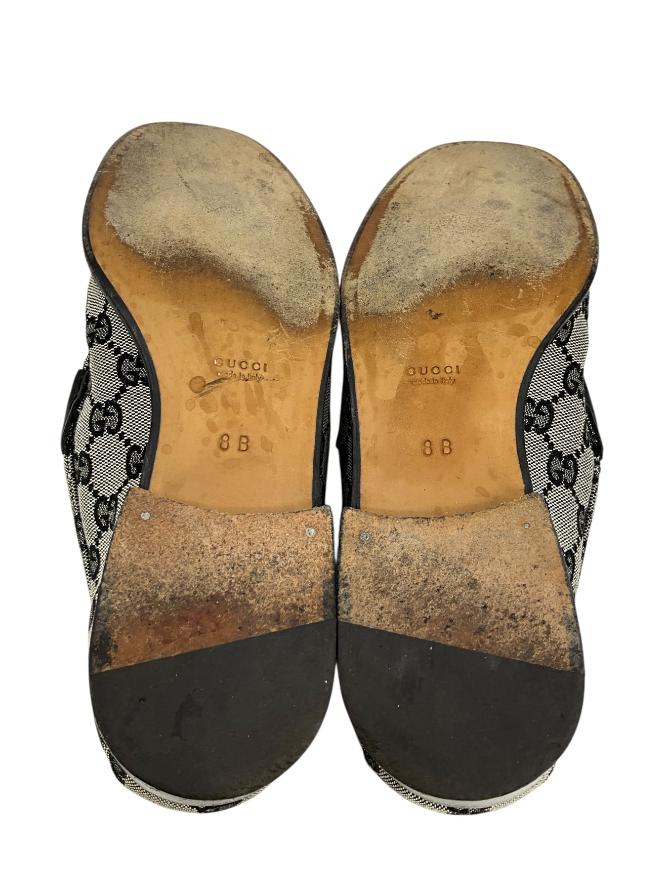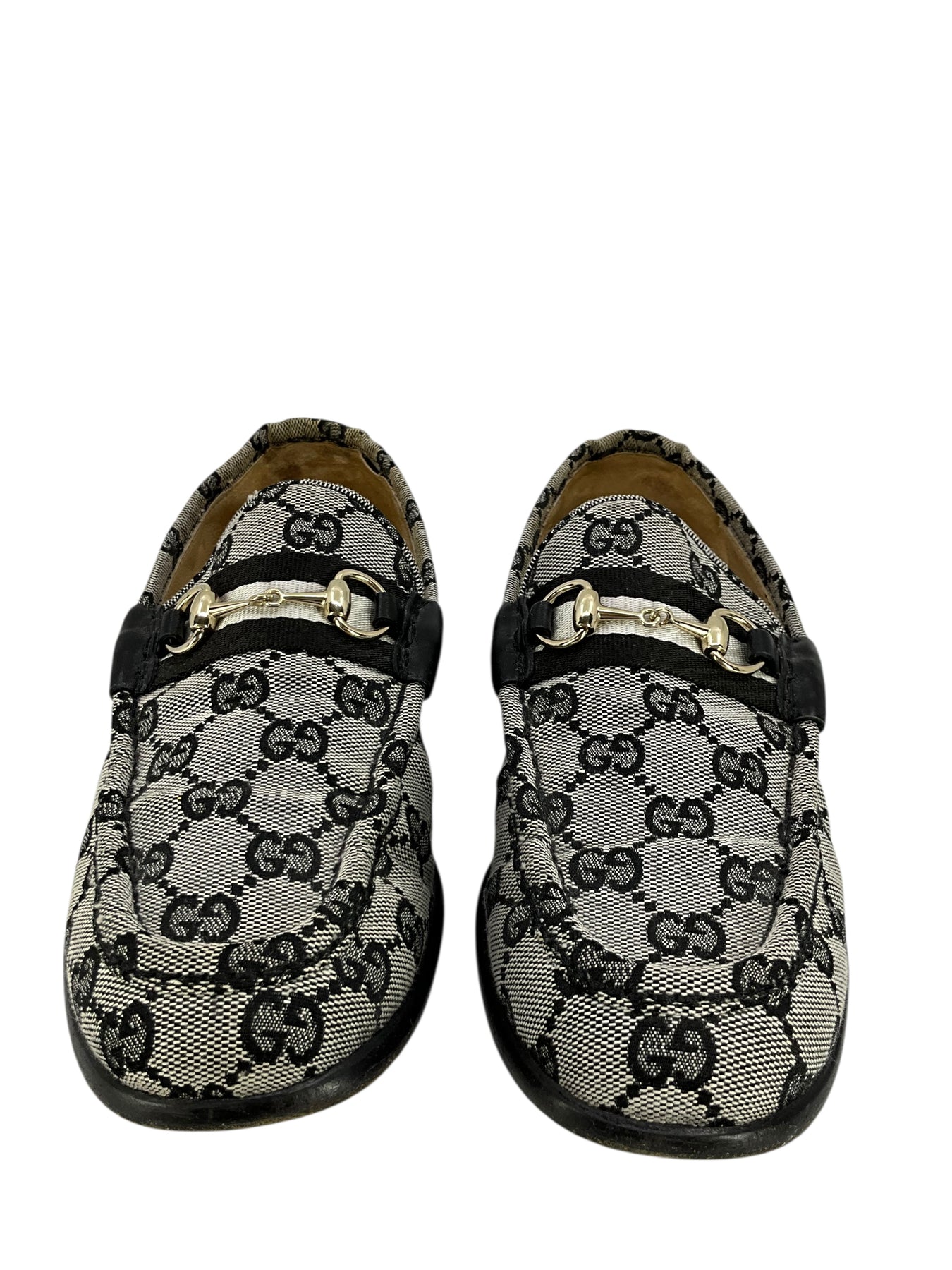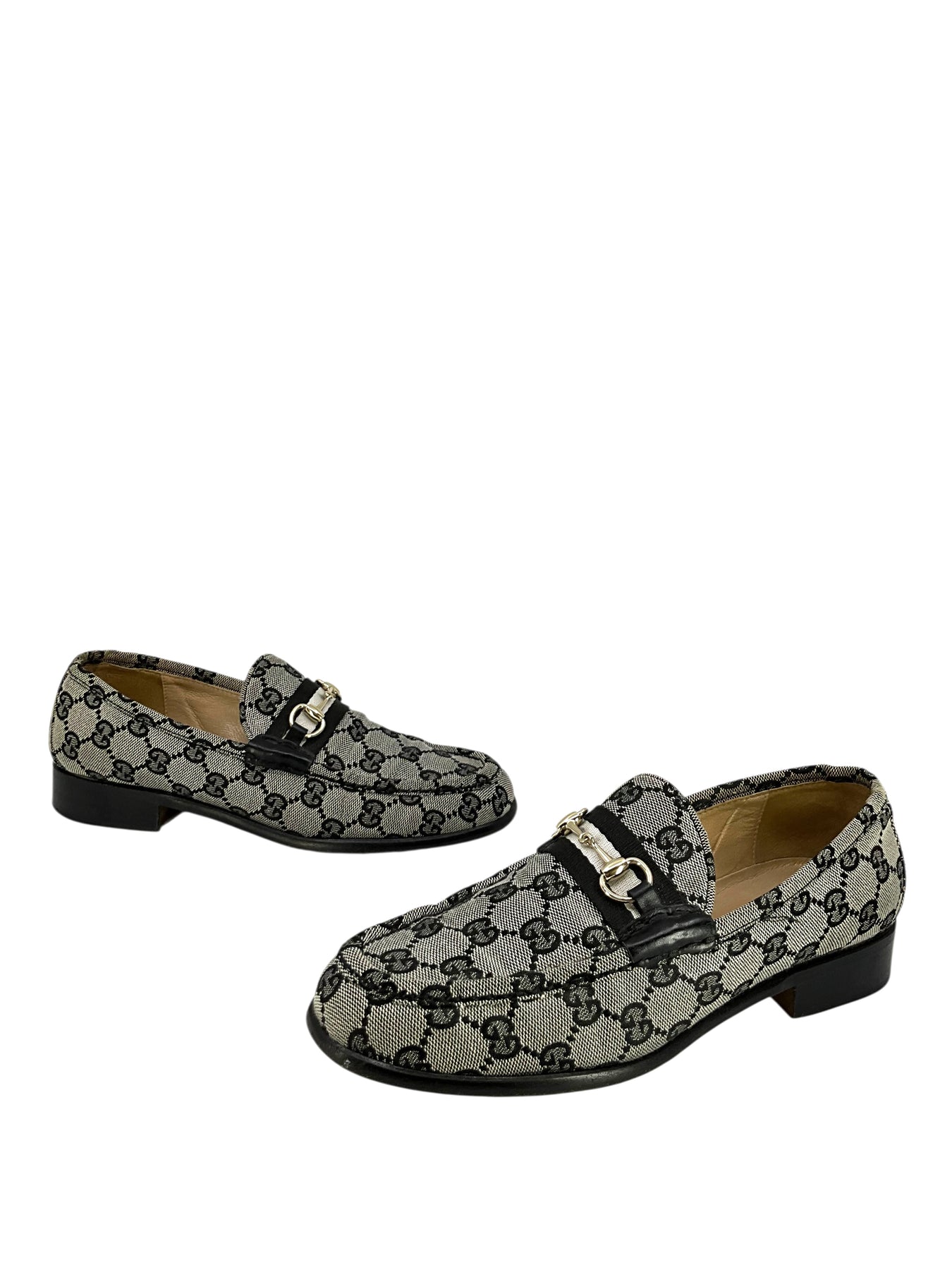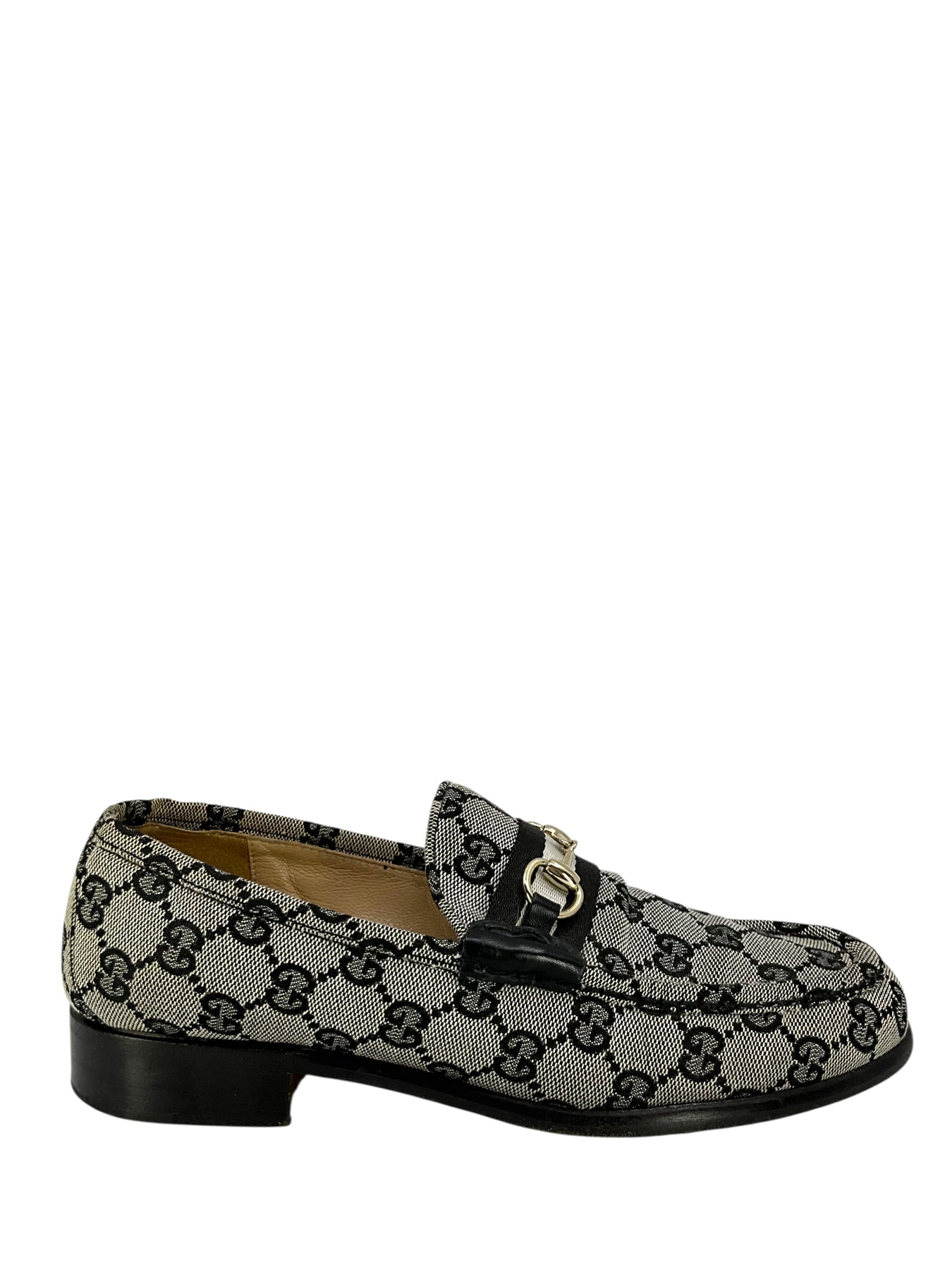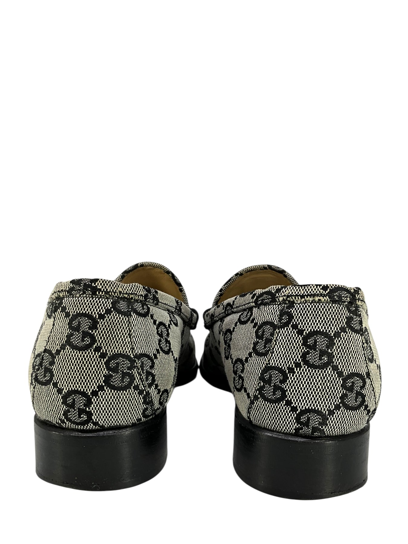 Add to your collection this authentic pair of Gucci GG Canvas Horsebit Loafers Size 8 crafted from signature black monogram 'GG' canvas. Featuring a silver-tone horsebit on the vamp and a chunky wooden heel.
