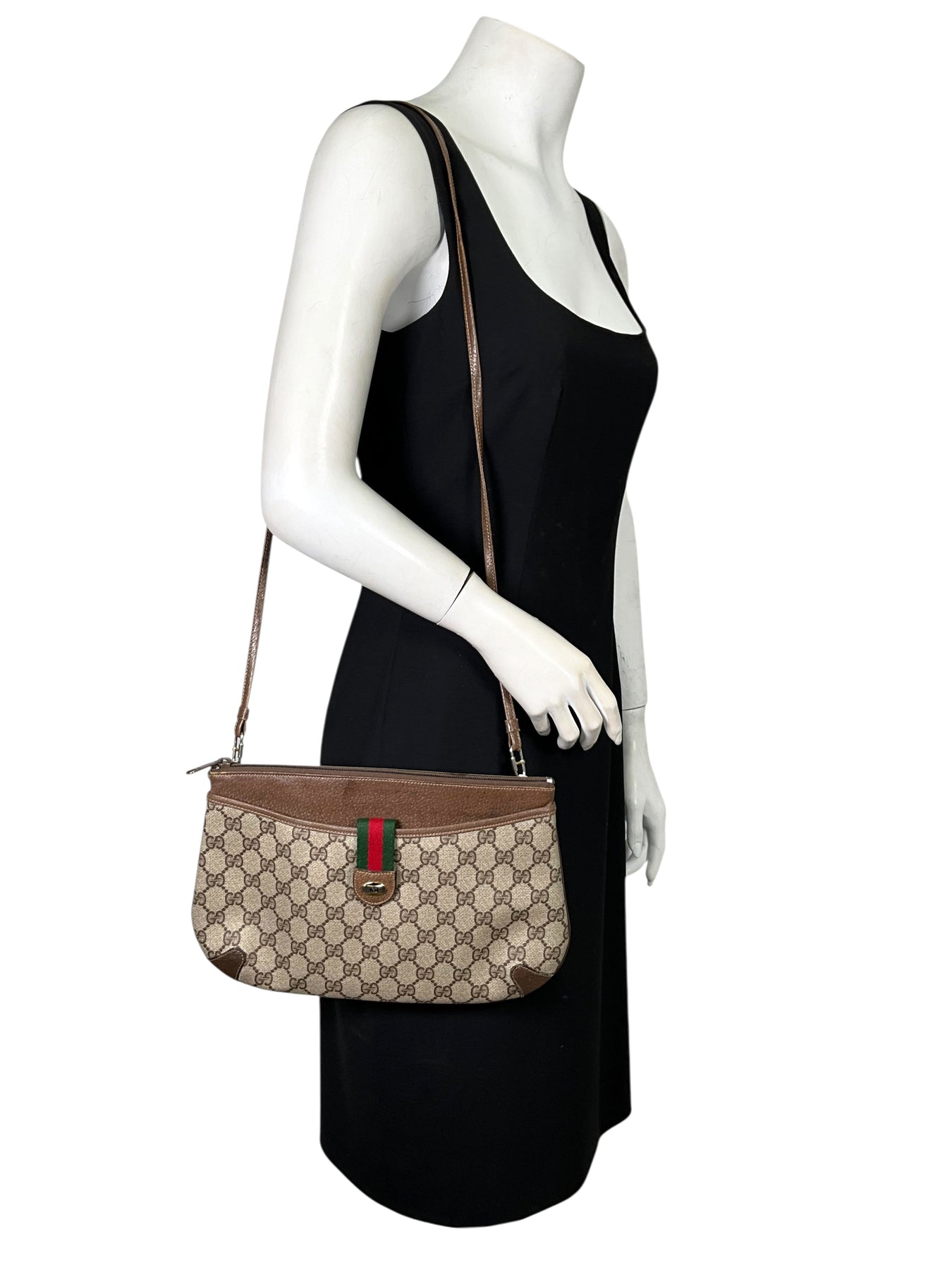 We guarantee the authenticity of this classic Gucci Vintage GG Canvas Sherry Line Shoulder Bag featuring a brown leather trim and gold-tone hardware. This signature bag has a removable thin leather shoulder strap that can be removed and carried as a clutch and logo-engraved detailing on the hardware.