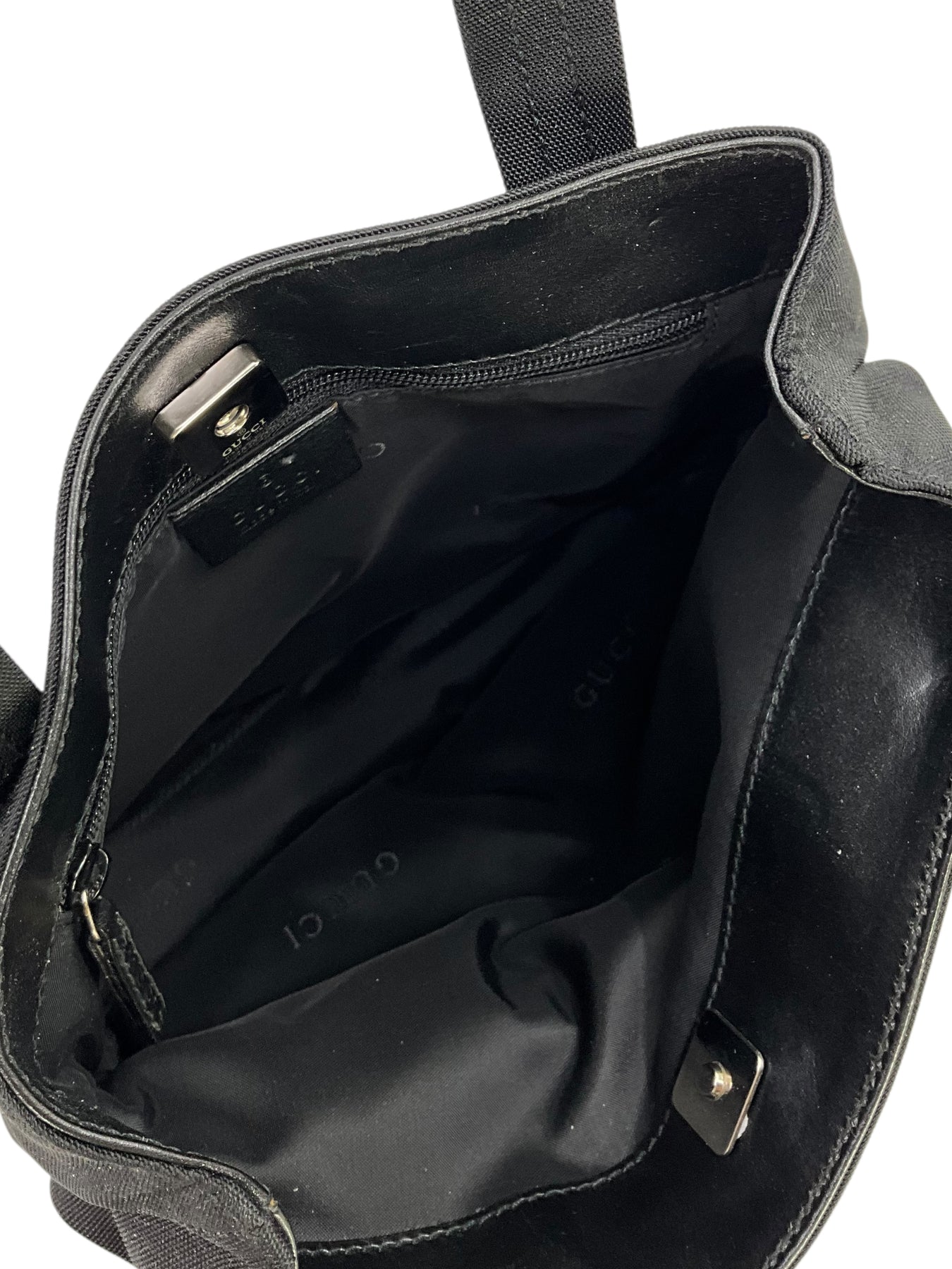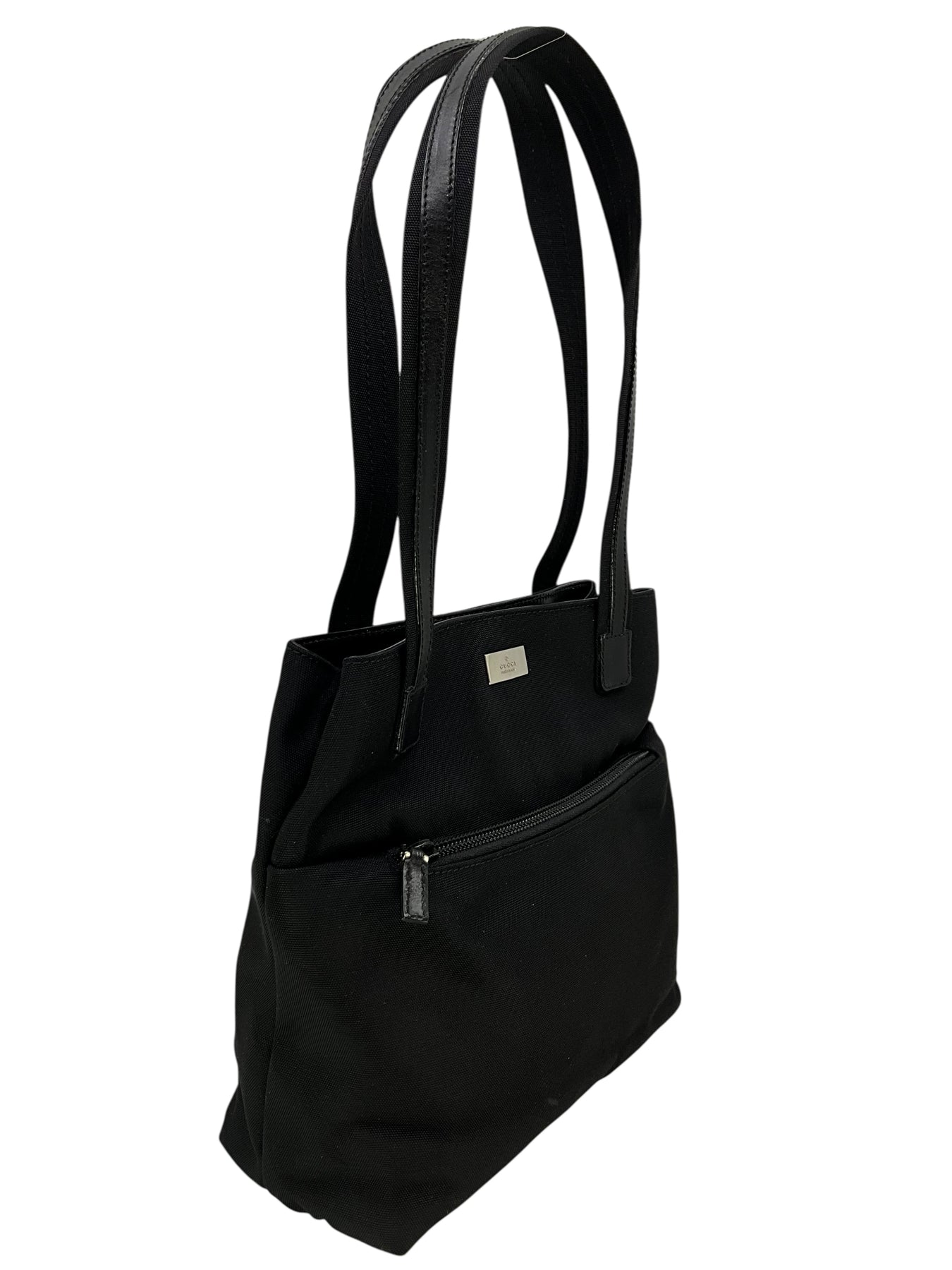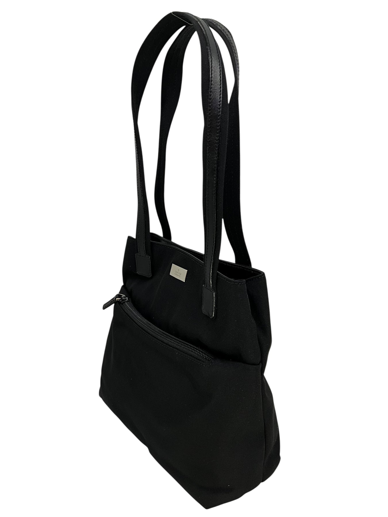Add to your collection this signature authentic Gucci Vintage Nylon Mini Tote crafted in textured black nylon with a black leather trim. This classic tote features dual top handles, a single exterior front zip compartment and a signature silver-tone logo plate at front.