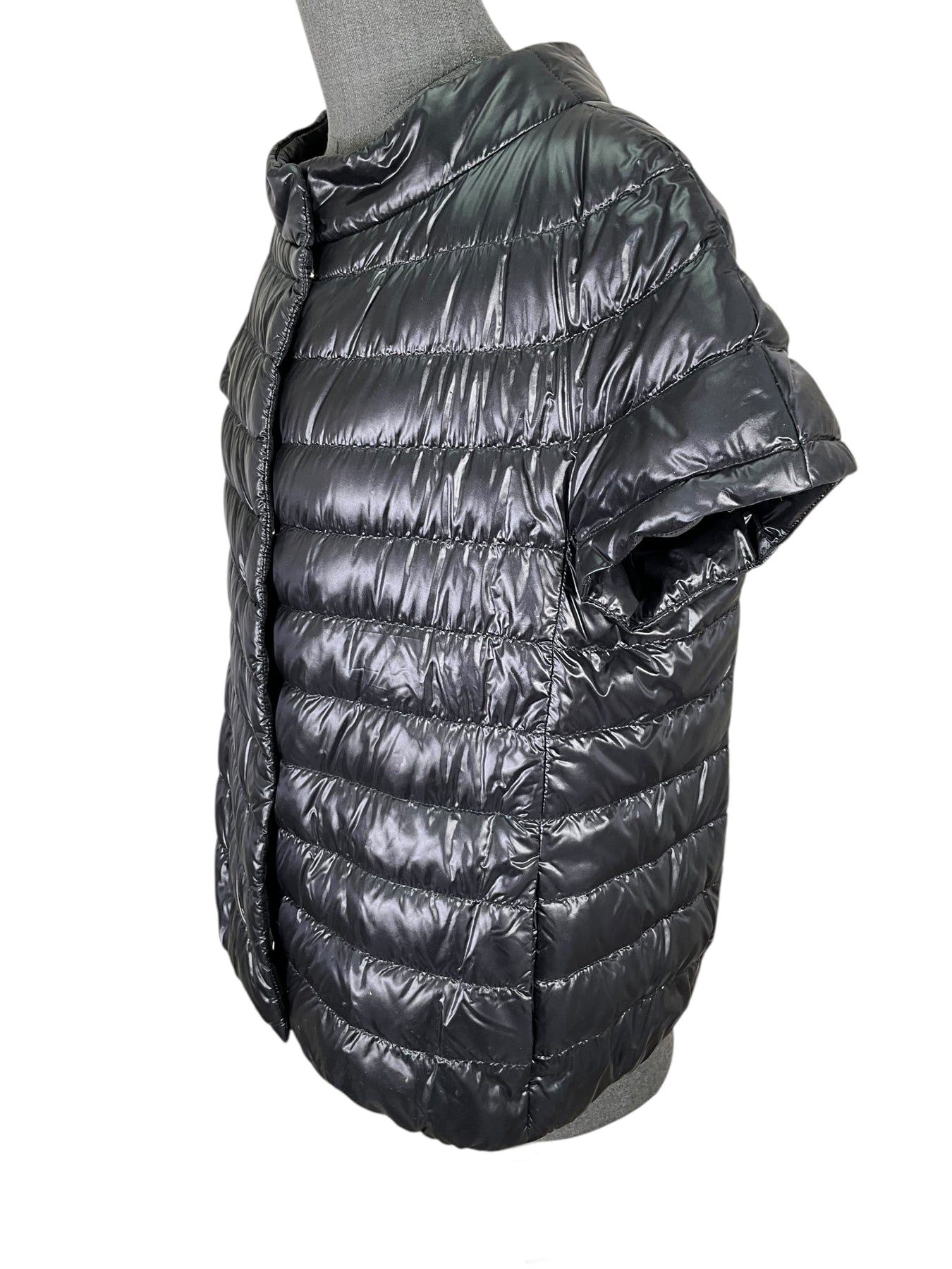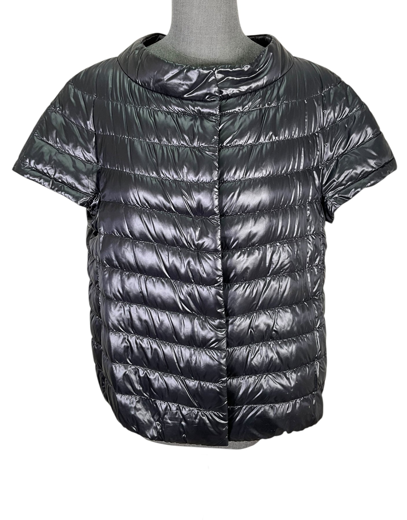 Guaranteed Authentic! Timeless classic Herno Emelia Cap Sleeve Puffer Jacket Size XXL (50) crafted in beautiful puffy quilted lightweight black nylon and goose down. Featuring two on-seam pockets and front snap closures.