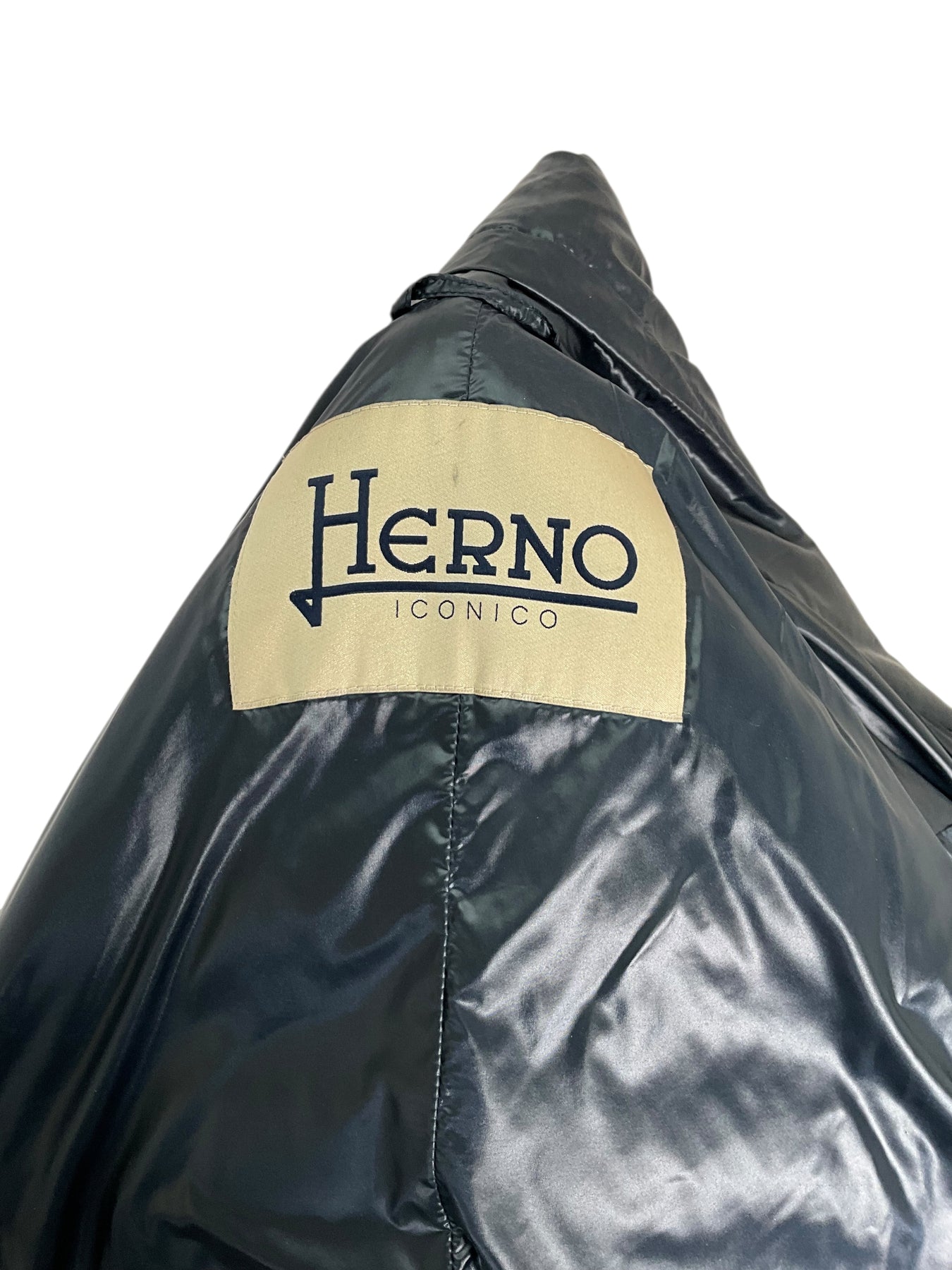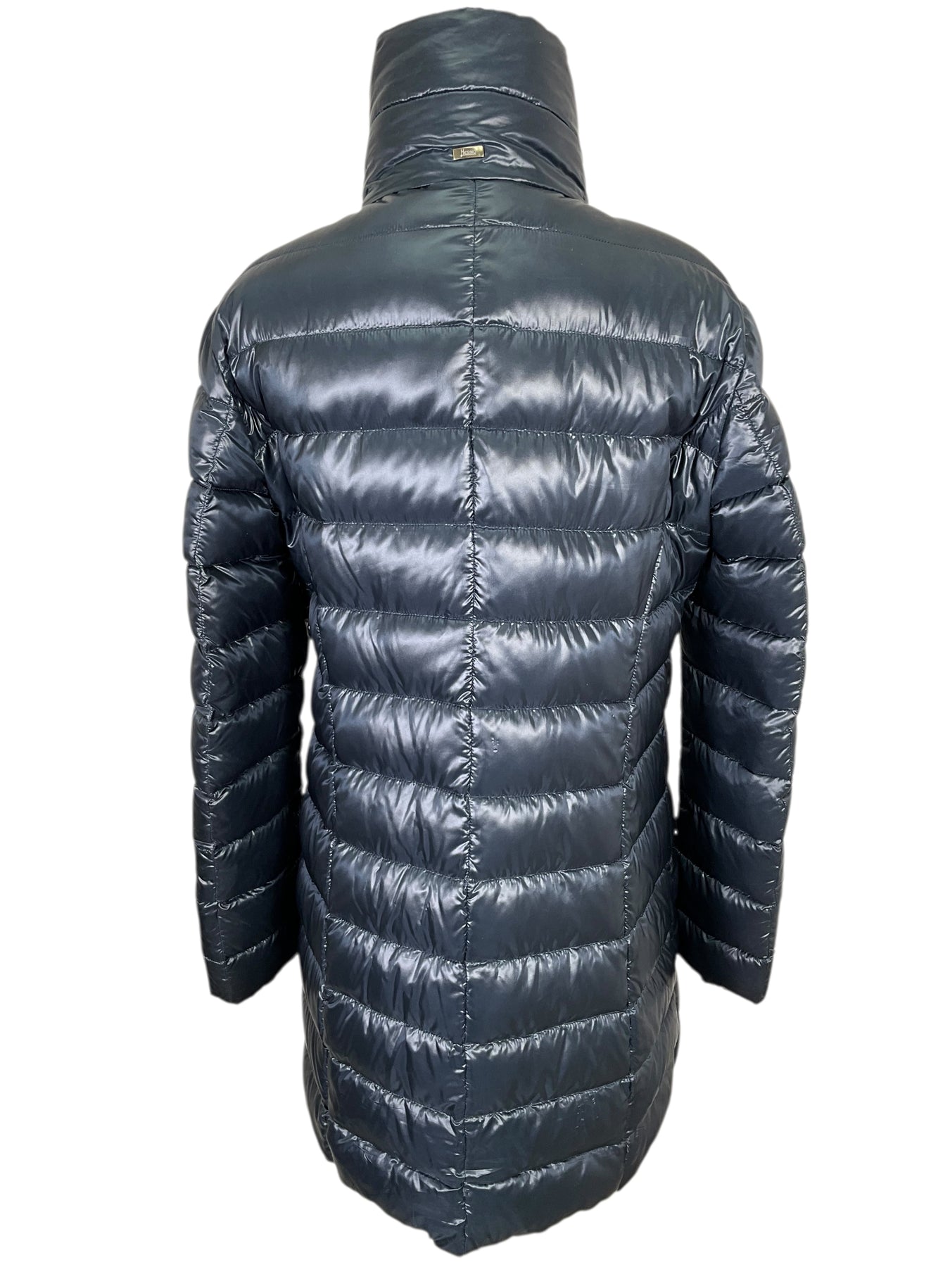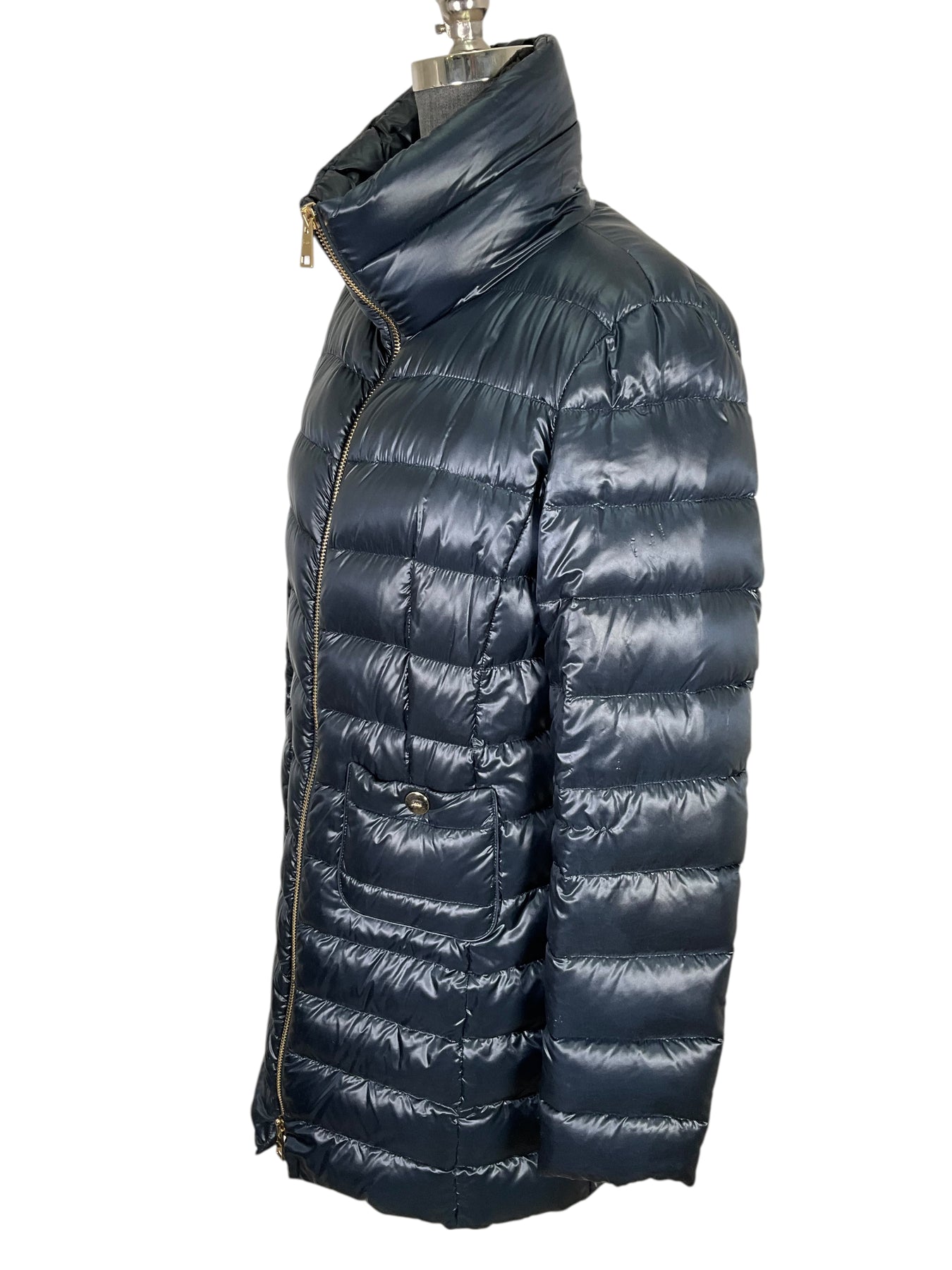 Guaranteed Authentic! Herno Quilted Down Puffer Maria Jacket Size L (IT 46) crafted in beautiful puffy quilted lightweight navy blue polyester and goose down. Featuring two snap pockets and front zip closures.