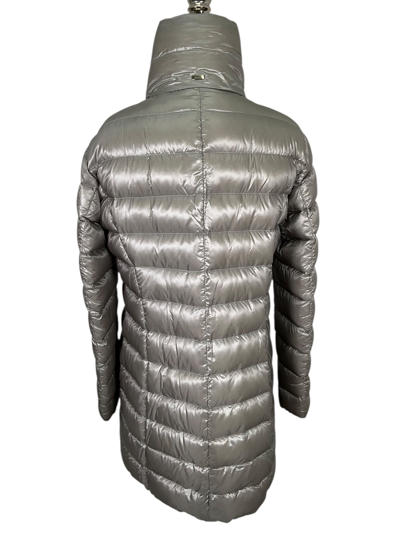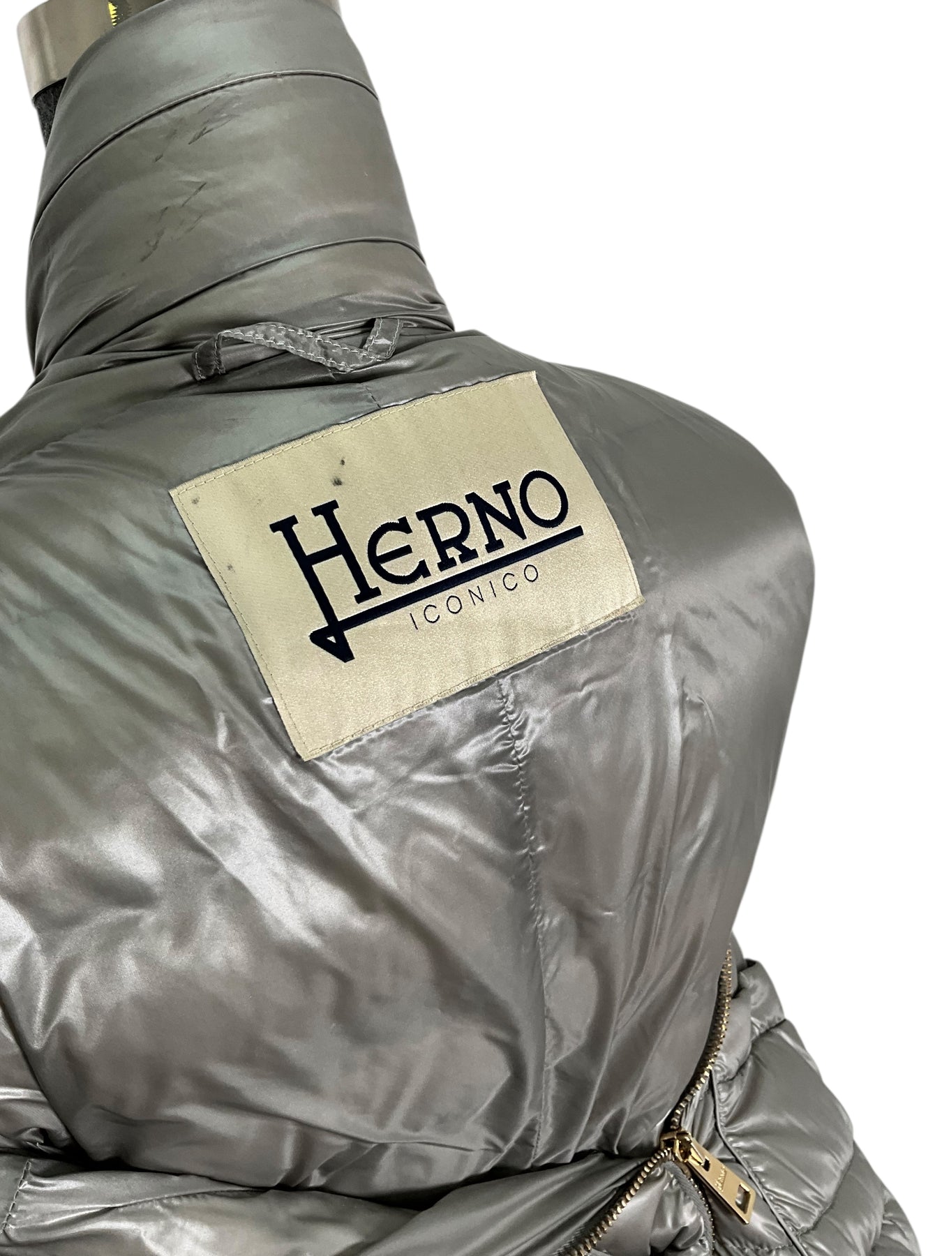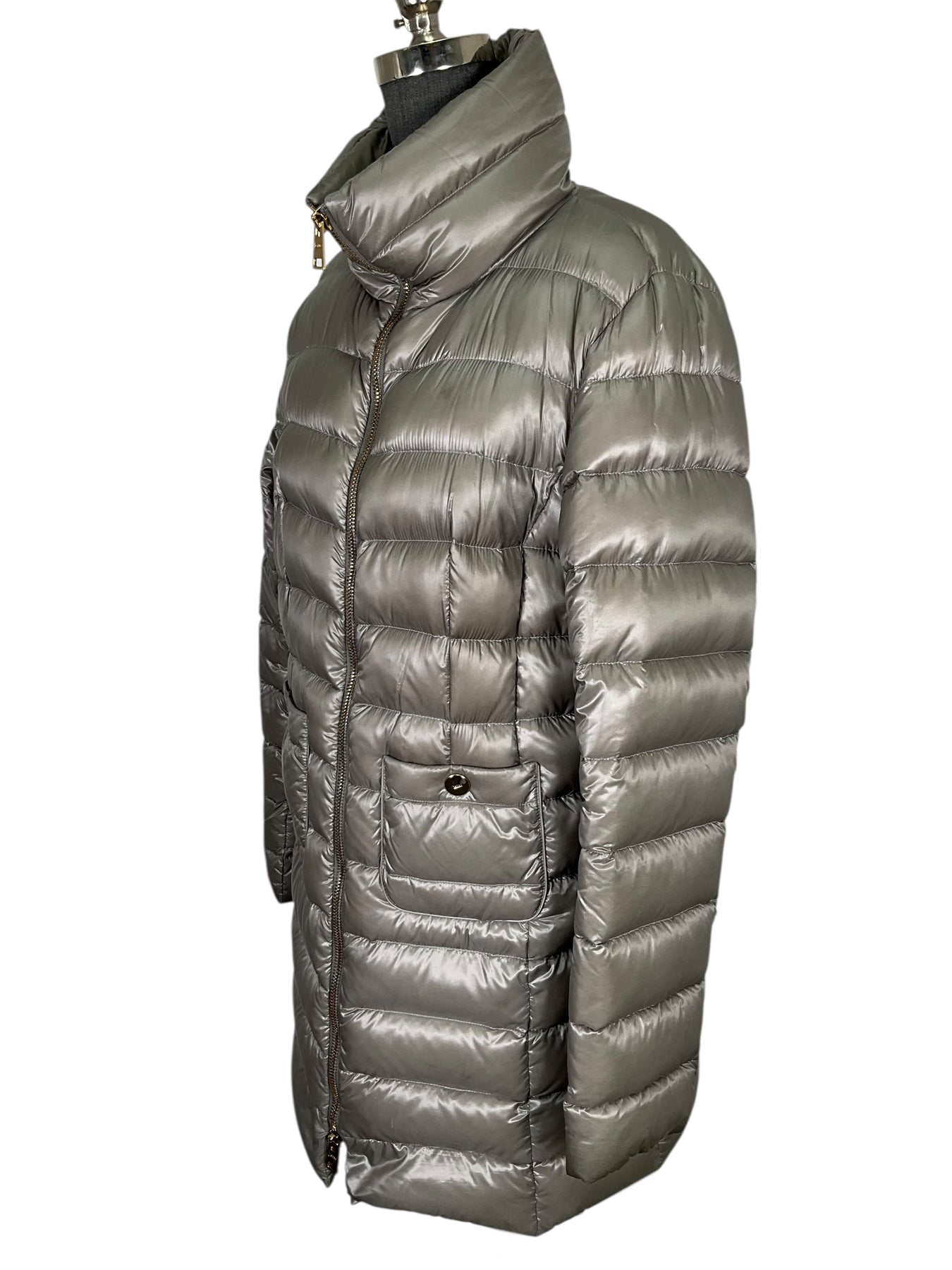 Guaranteed Authentic! Herno Quilted Down Puffer Maria Jacket Size L (IT 48) crafted in beautiful puffy quilted lightweight gray polyester and goose down. Featuring two snap pockets and front zip closures.