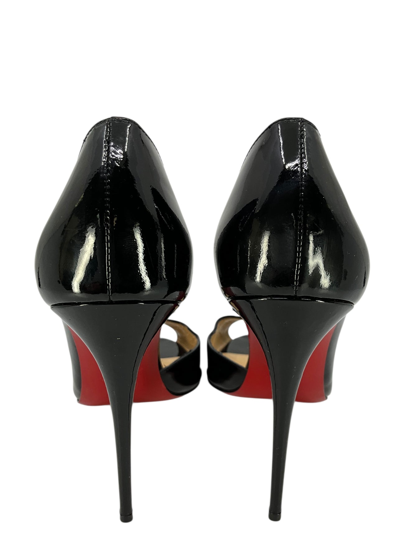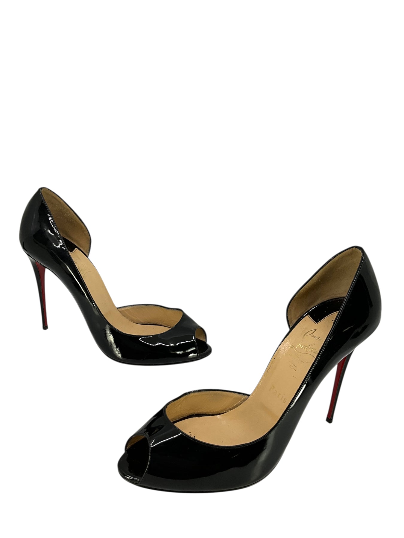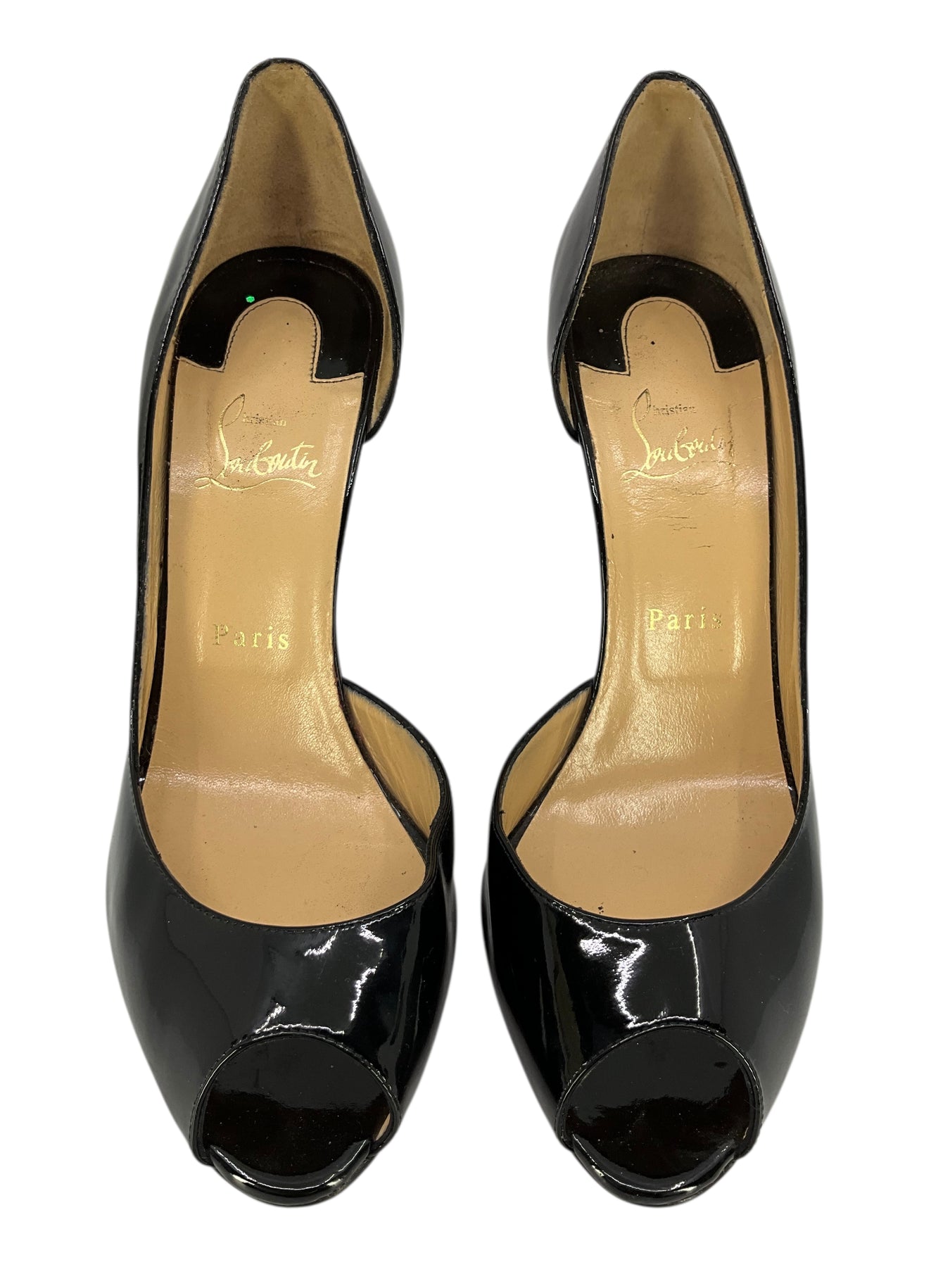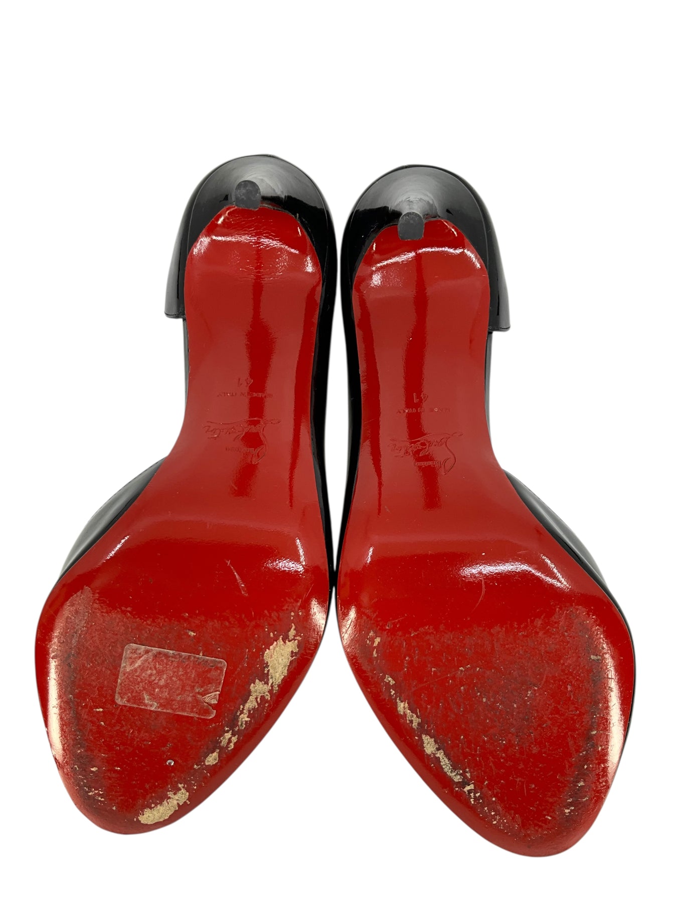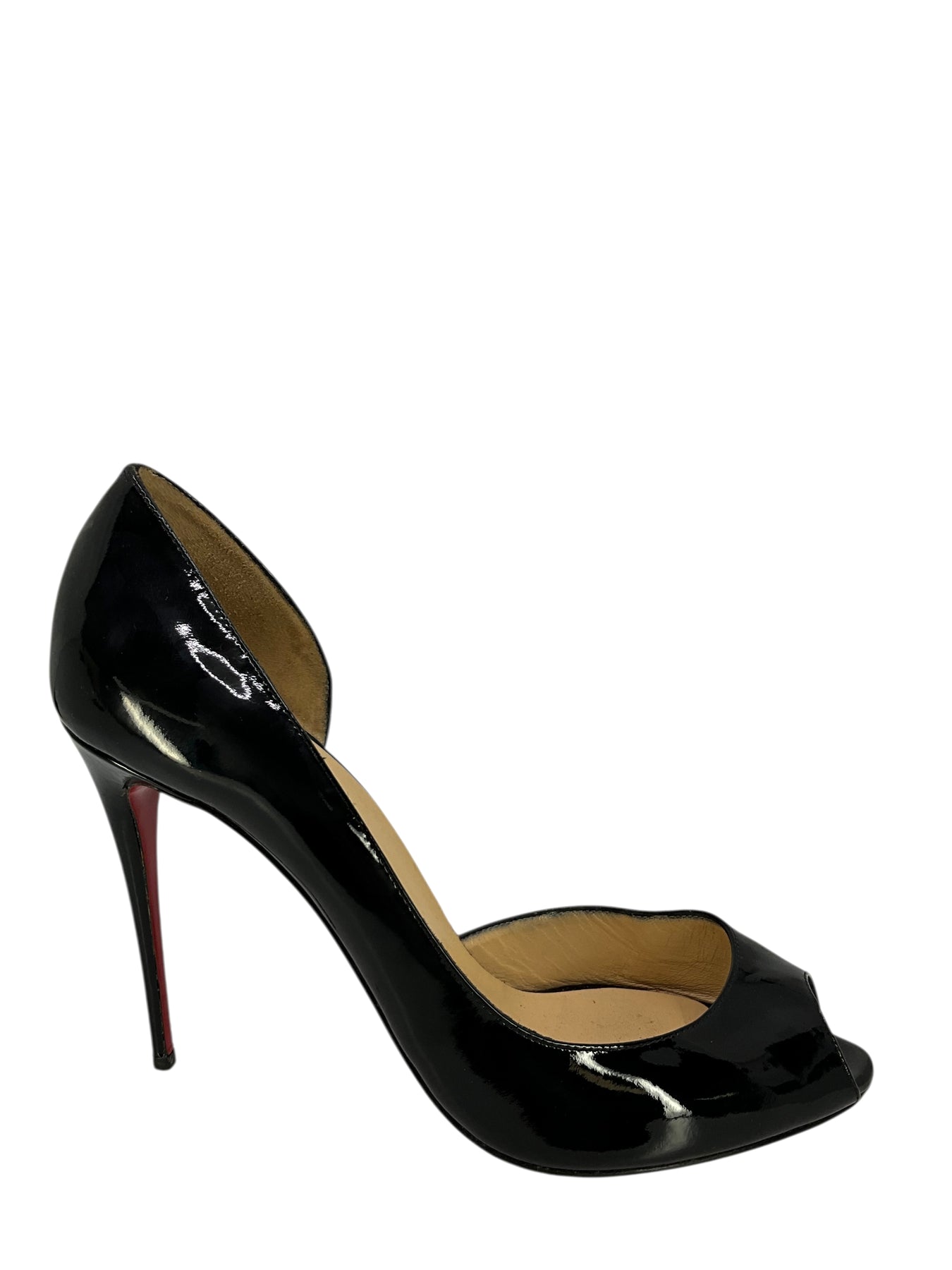 Prepare to turn heads with this authentic pair of Christian Louboutin Patent Leather Half D'Orsay Pumps Size 11 crafted from glossy black patent leather with a peep-toe. Featuring an ultra-feminine silhouette with a tall slender stiletto heel.