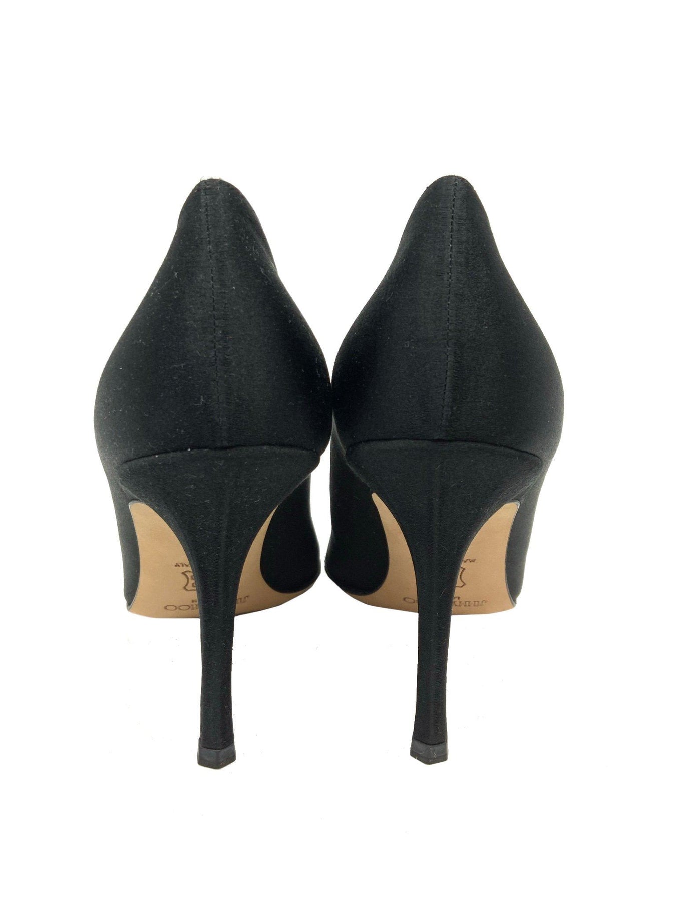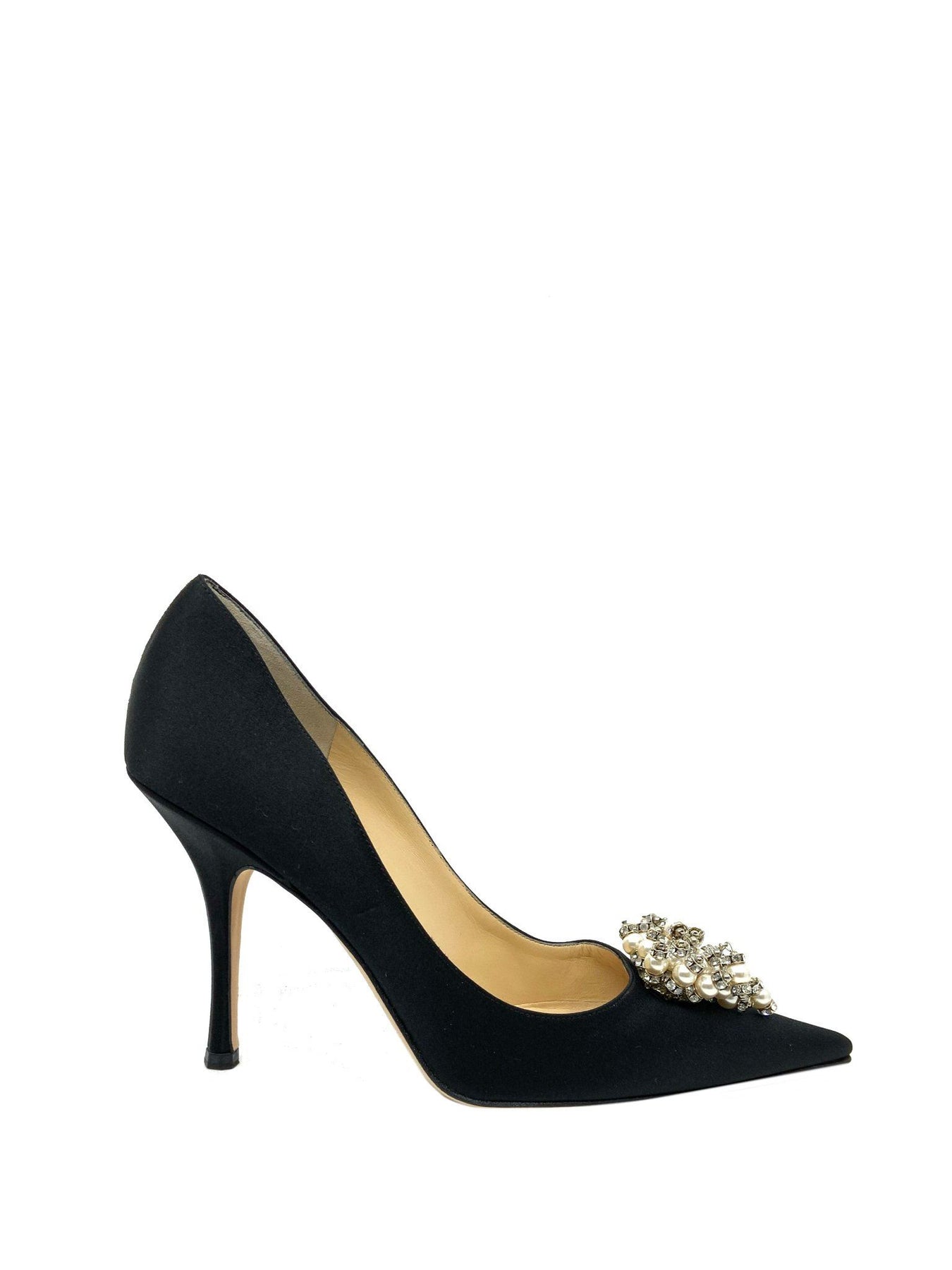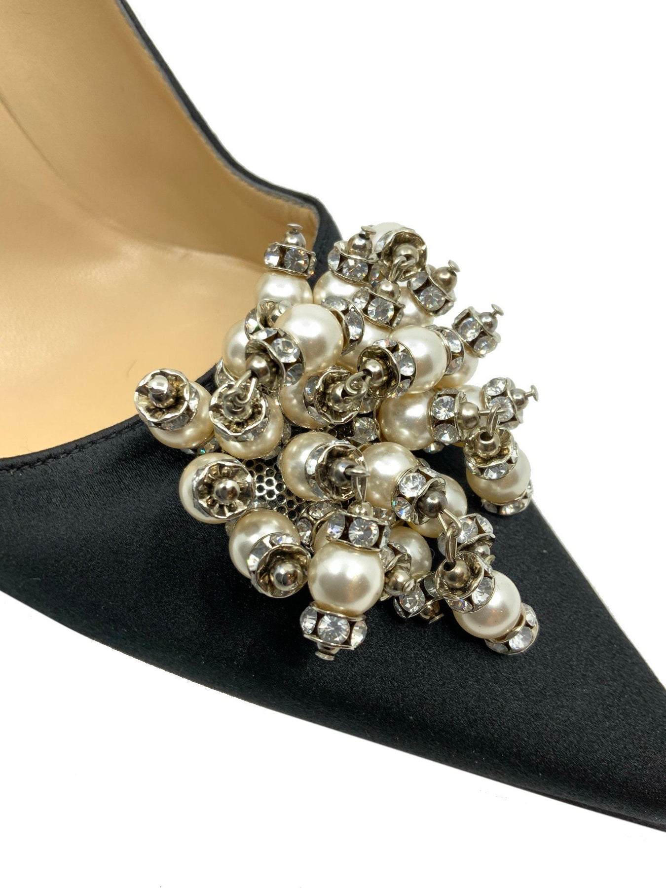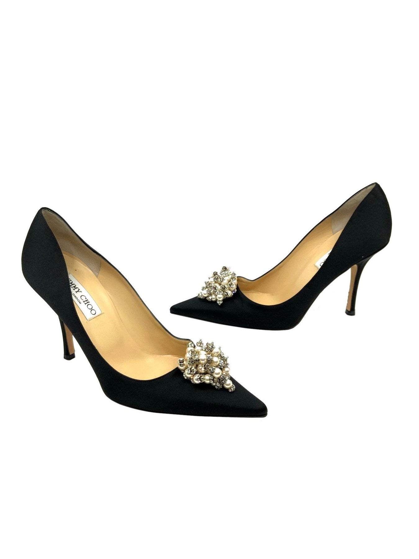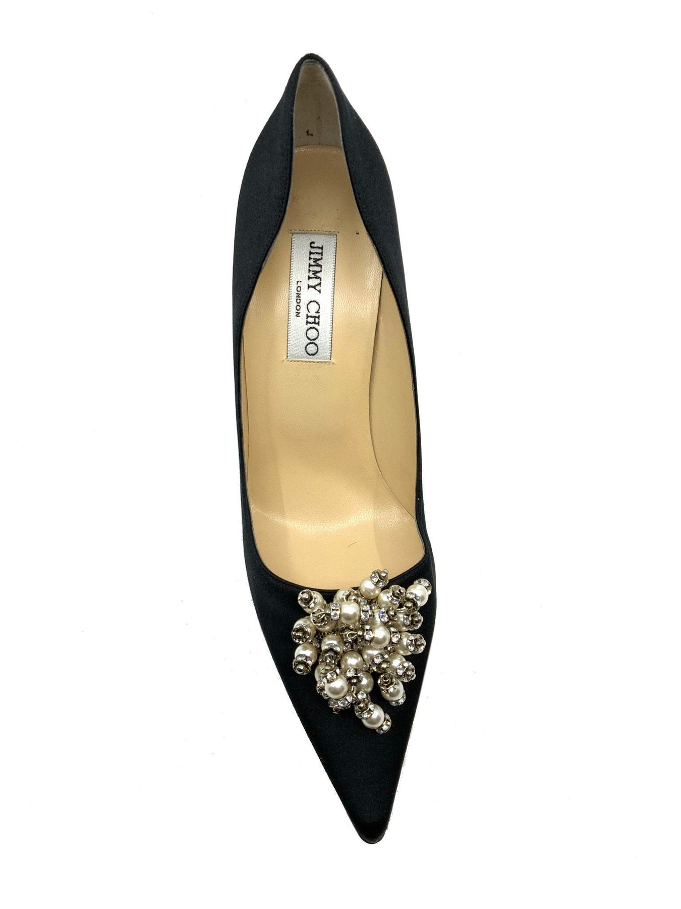 We guarantee the authenticity of these Jimmy Choo Satin Point Toe Crystal Pearl Embellished Pumps Size 9 | 39 crafted in Italy with the utmost precision detailed Pearl and crystal embellishment on the toe from black satin. Featuring a fine-pointed toe and a creamy leather lining with a slightly padded insole.