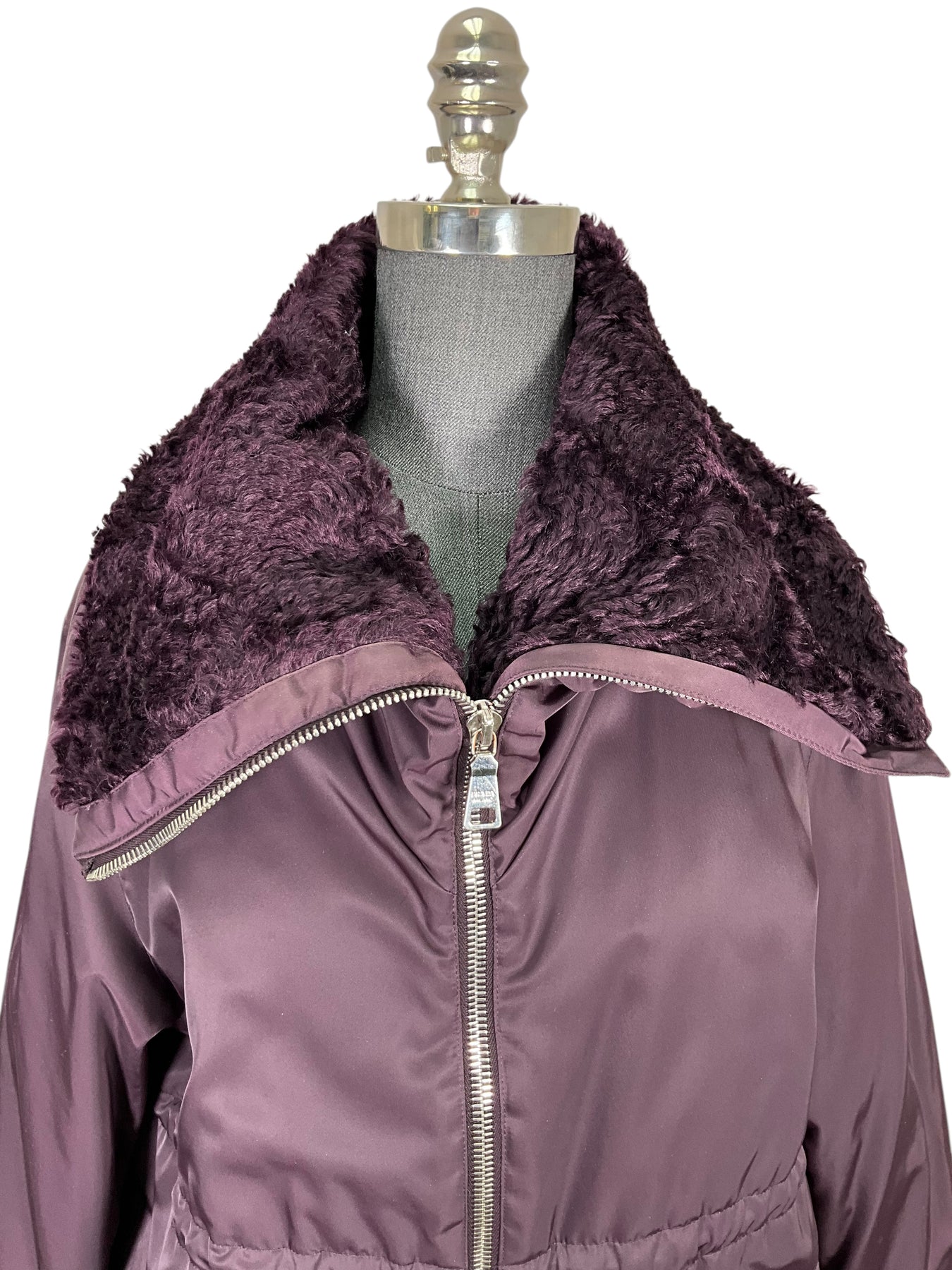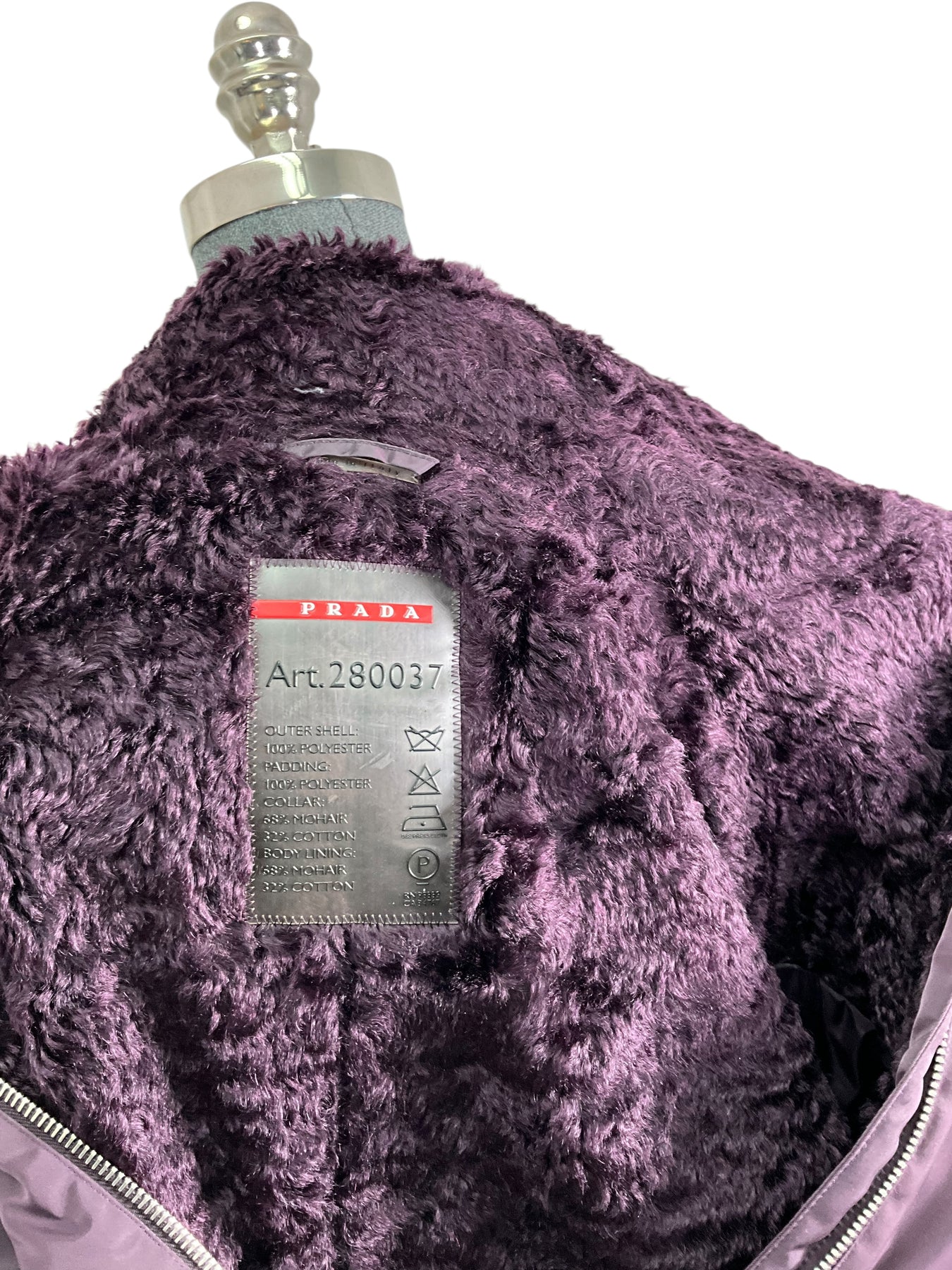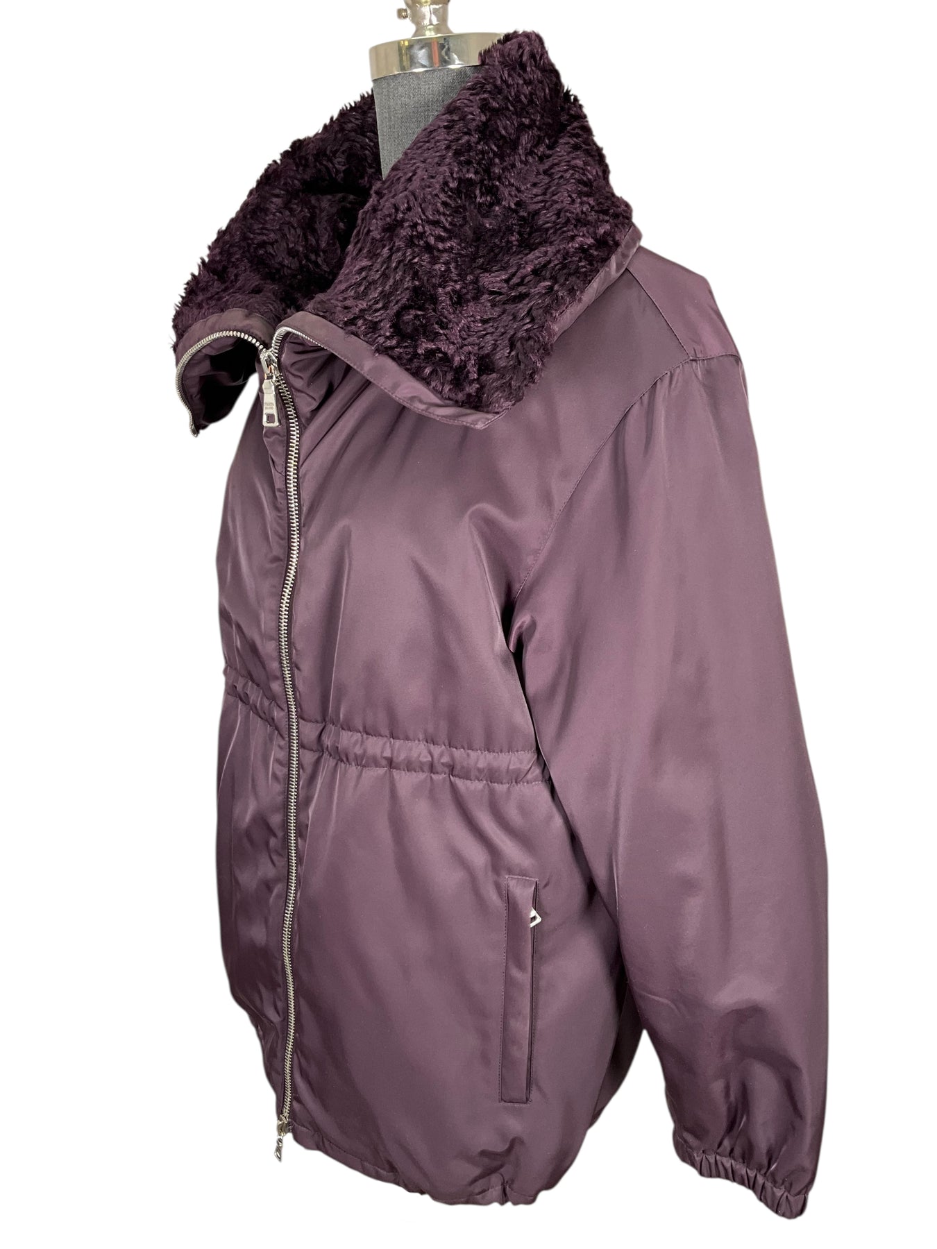 Add to your collection this gorgeous authentic Prada Polyester Mohair Lined Bomber Jacket Size S (IT 40) in purple featuring an adjustable waist, zip pockets and front zip closures.