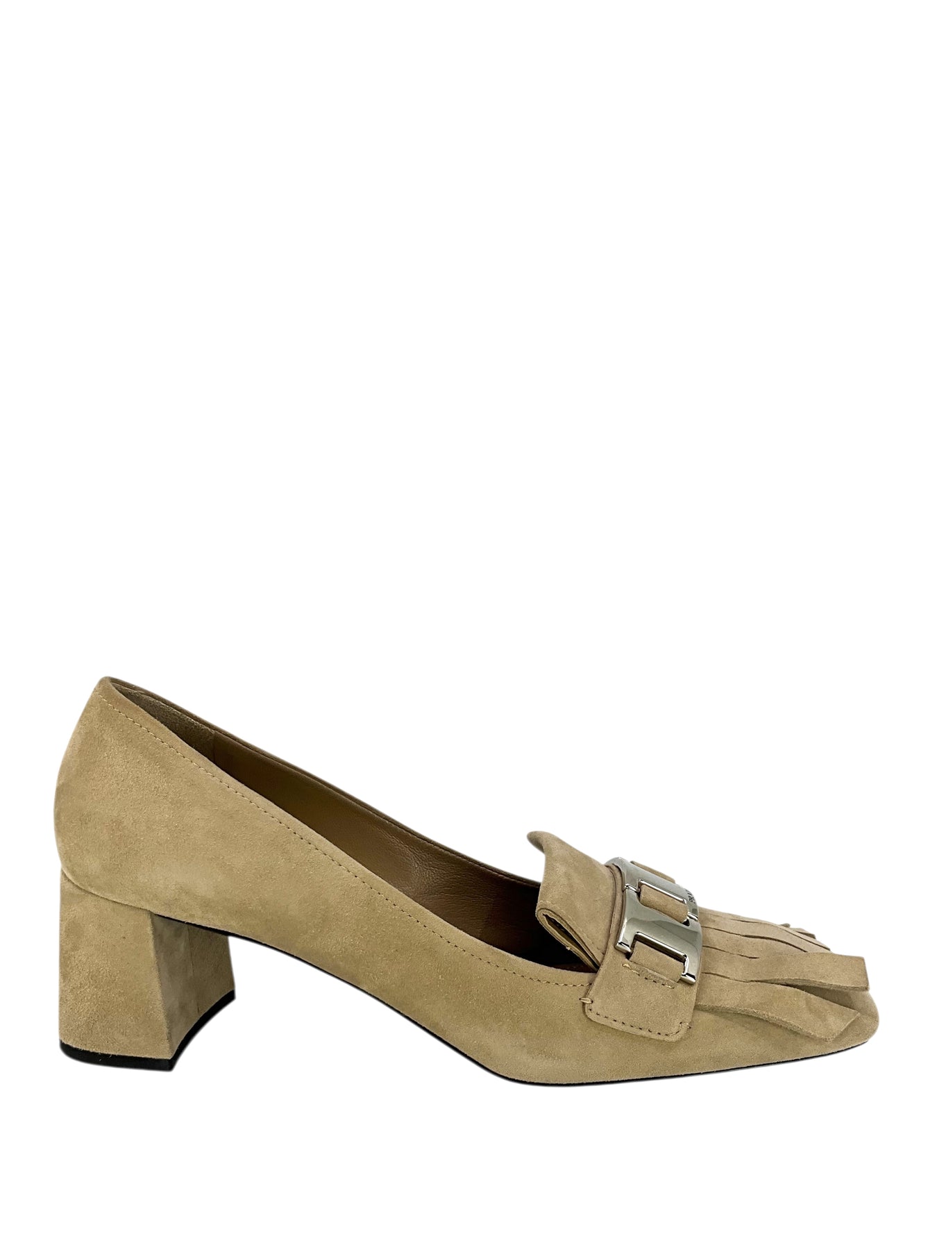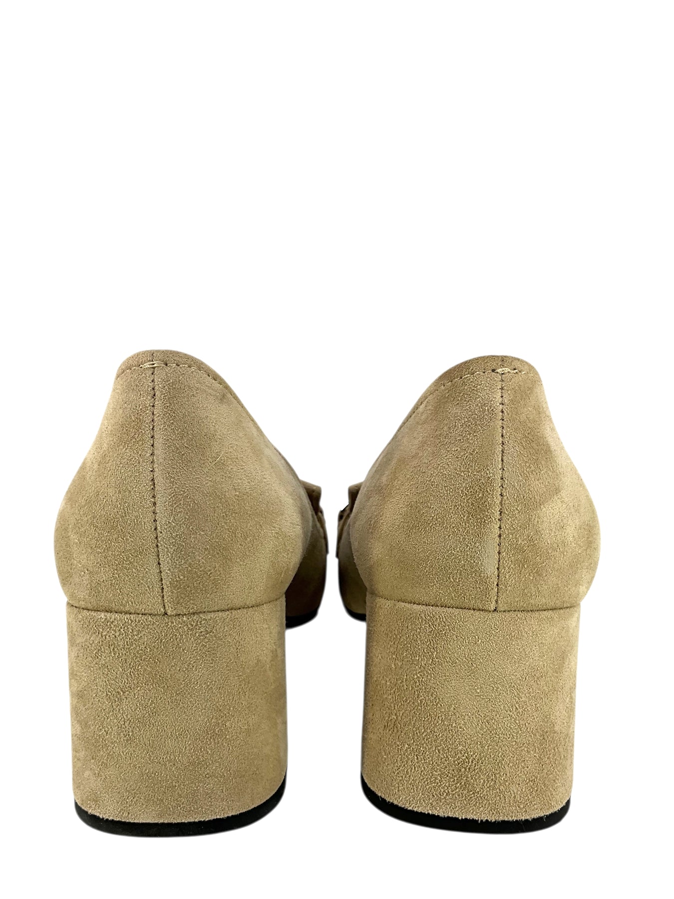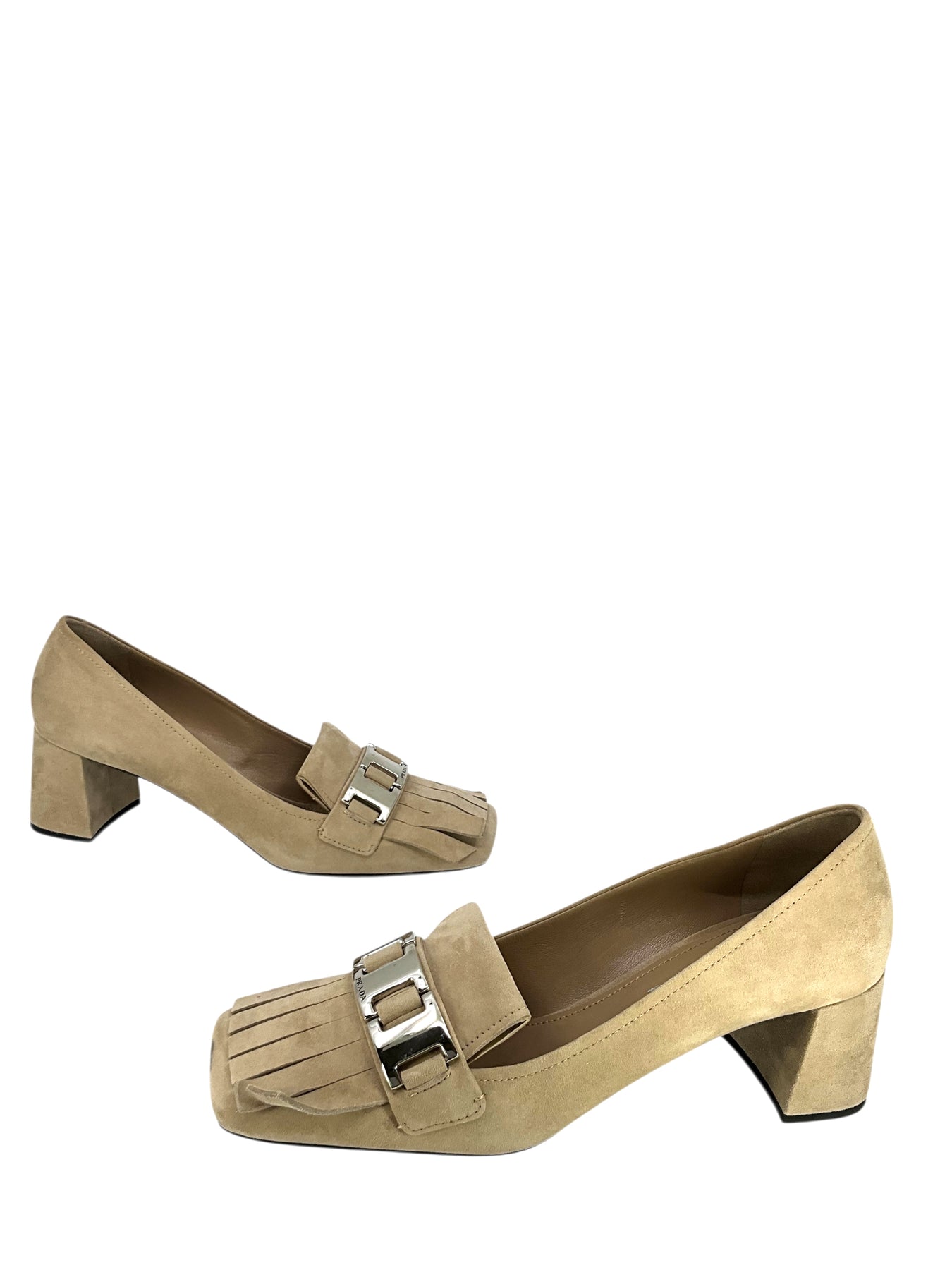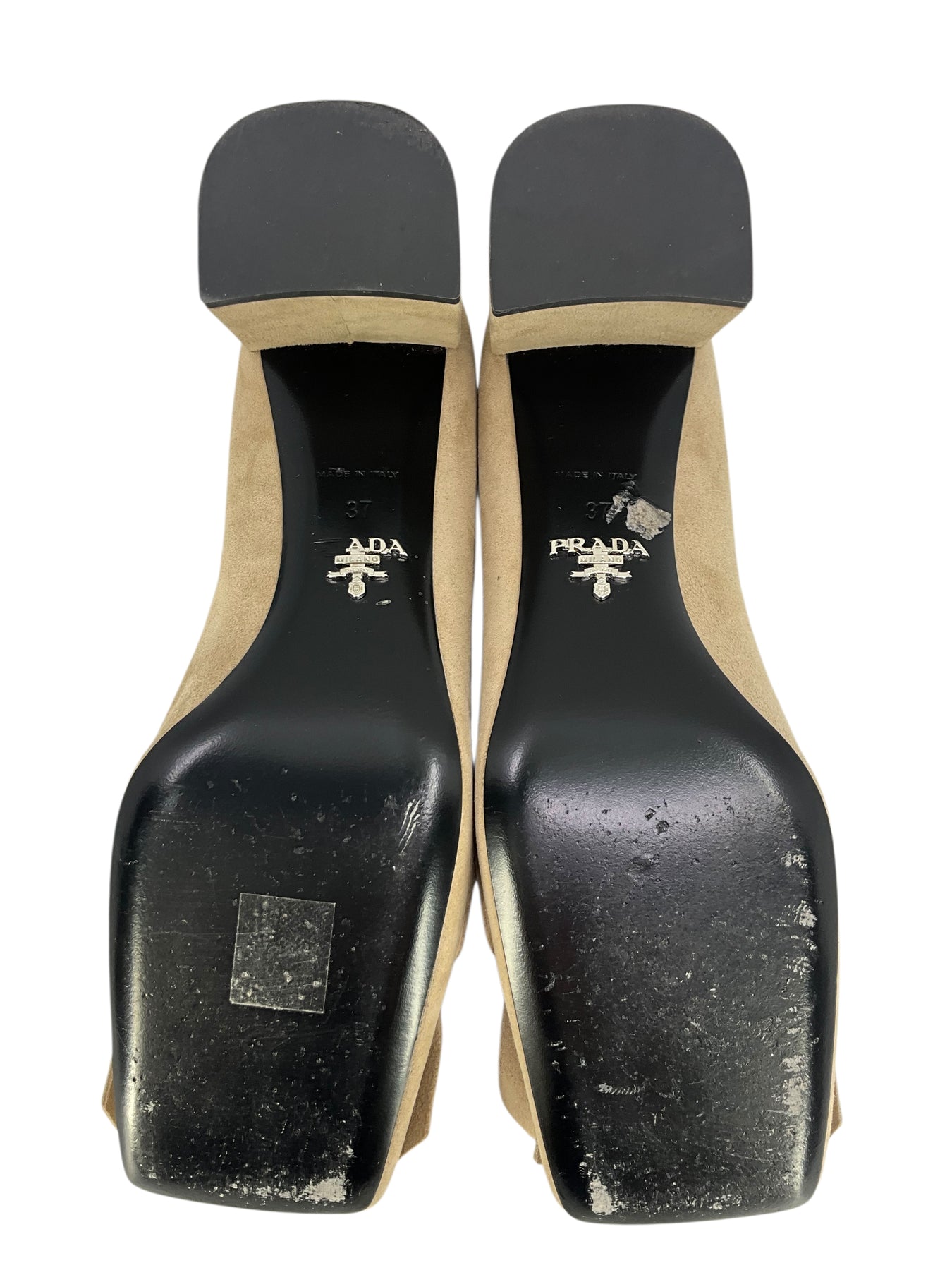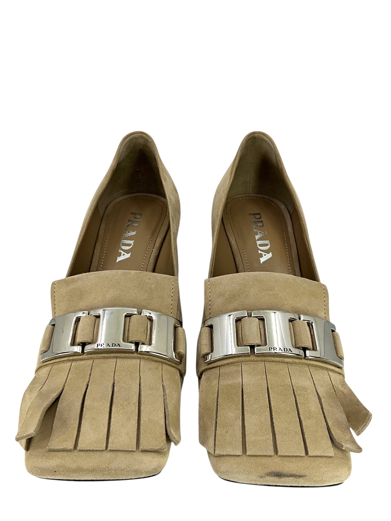 Guaranteed authentic Prada Suede Logo Buckle Square Toe Tassel Pumps Size 7 (IT 37) crafted from smooth beige suede with a squared toe and fringe detail. Featuring a palladium logo-engraved buckle and a chunky block heel.