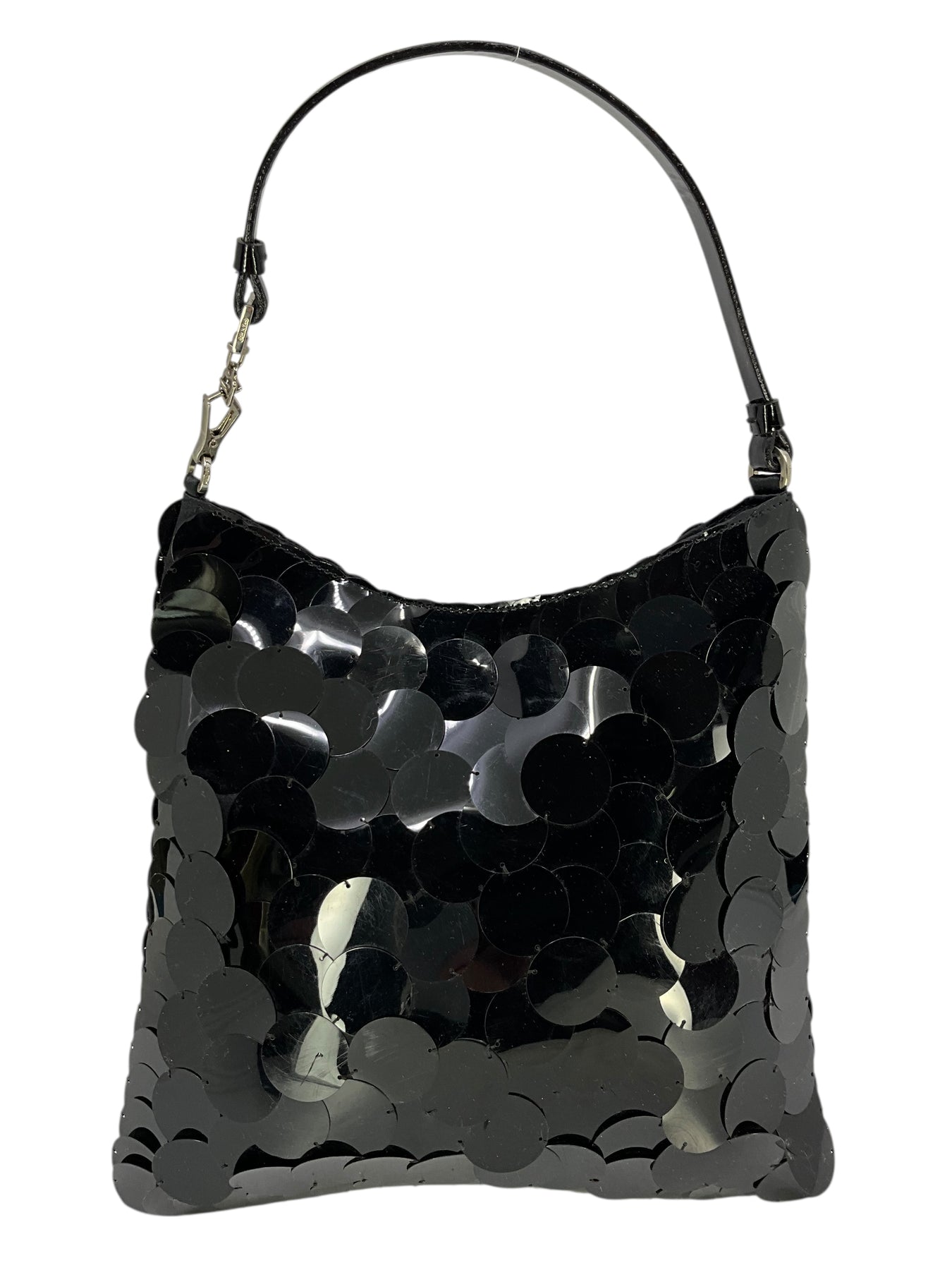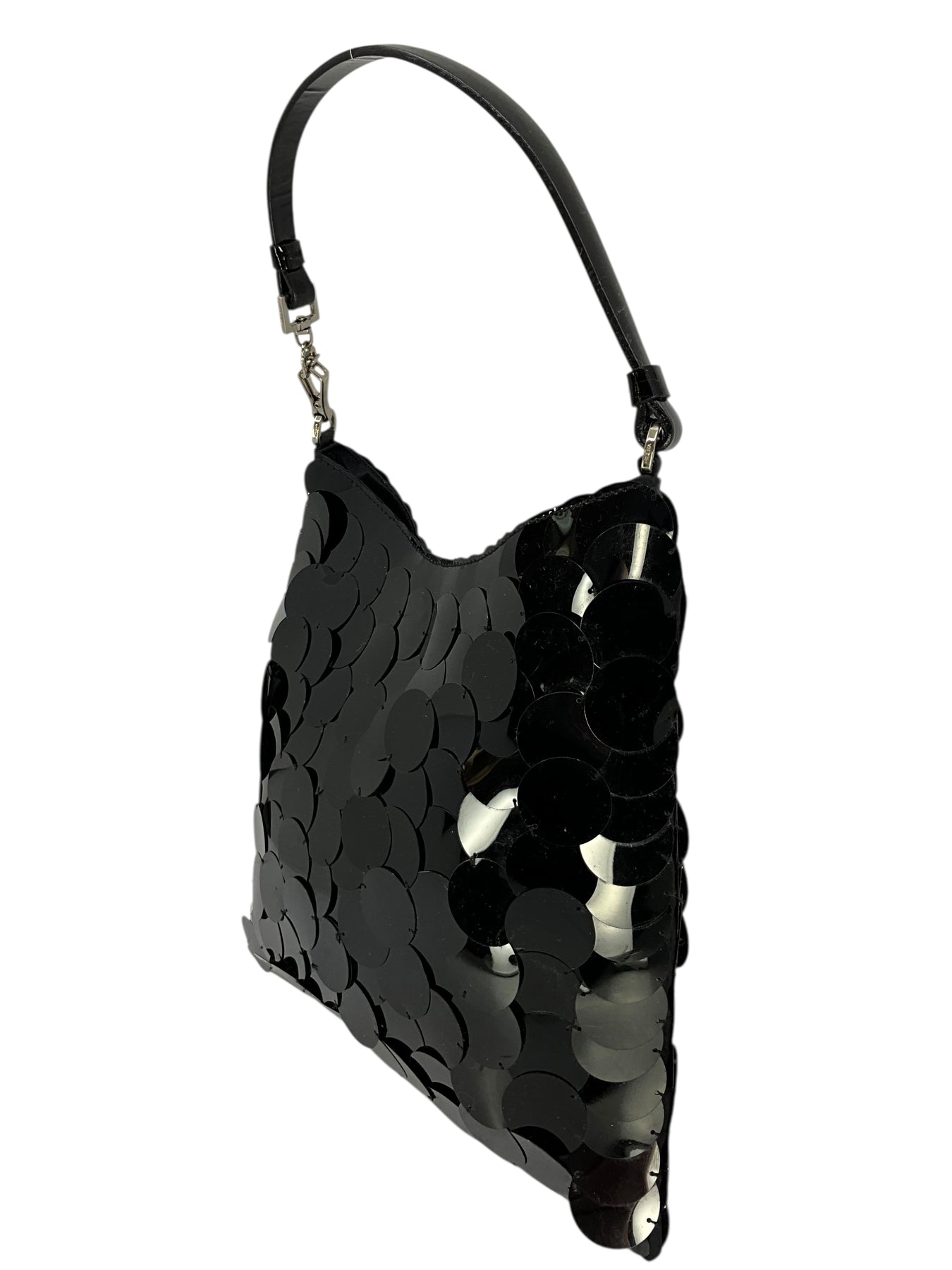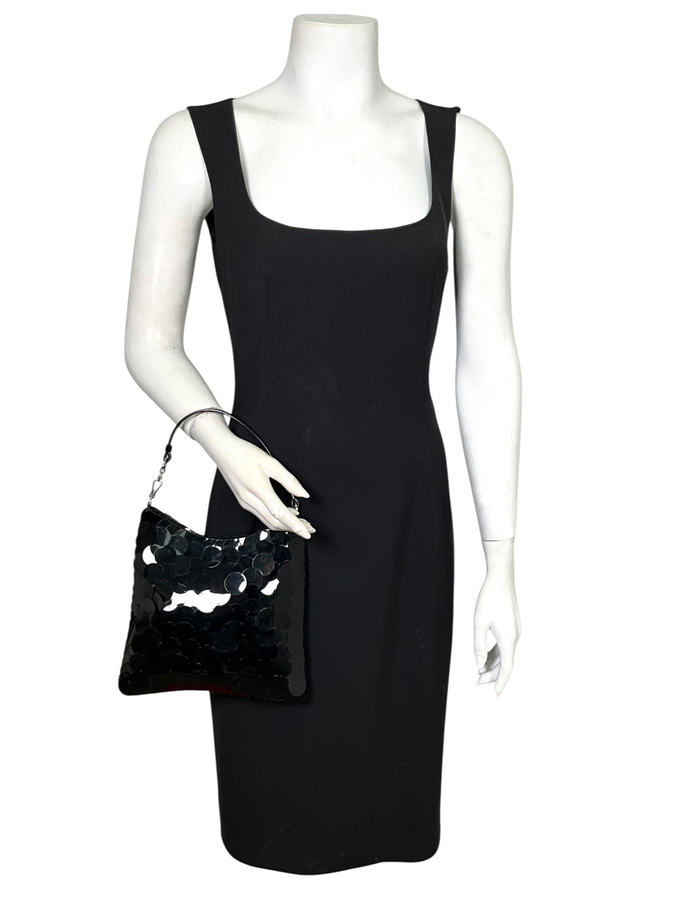 We guarantee the authenticity of this Prada Vintage Sequin Disks Small Top Handle Bag crafted in black sequins and silver-tone hardware. It features a tonal black patent leather top handle.
