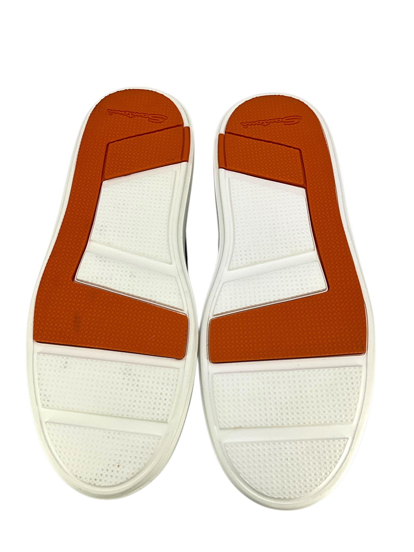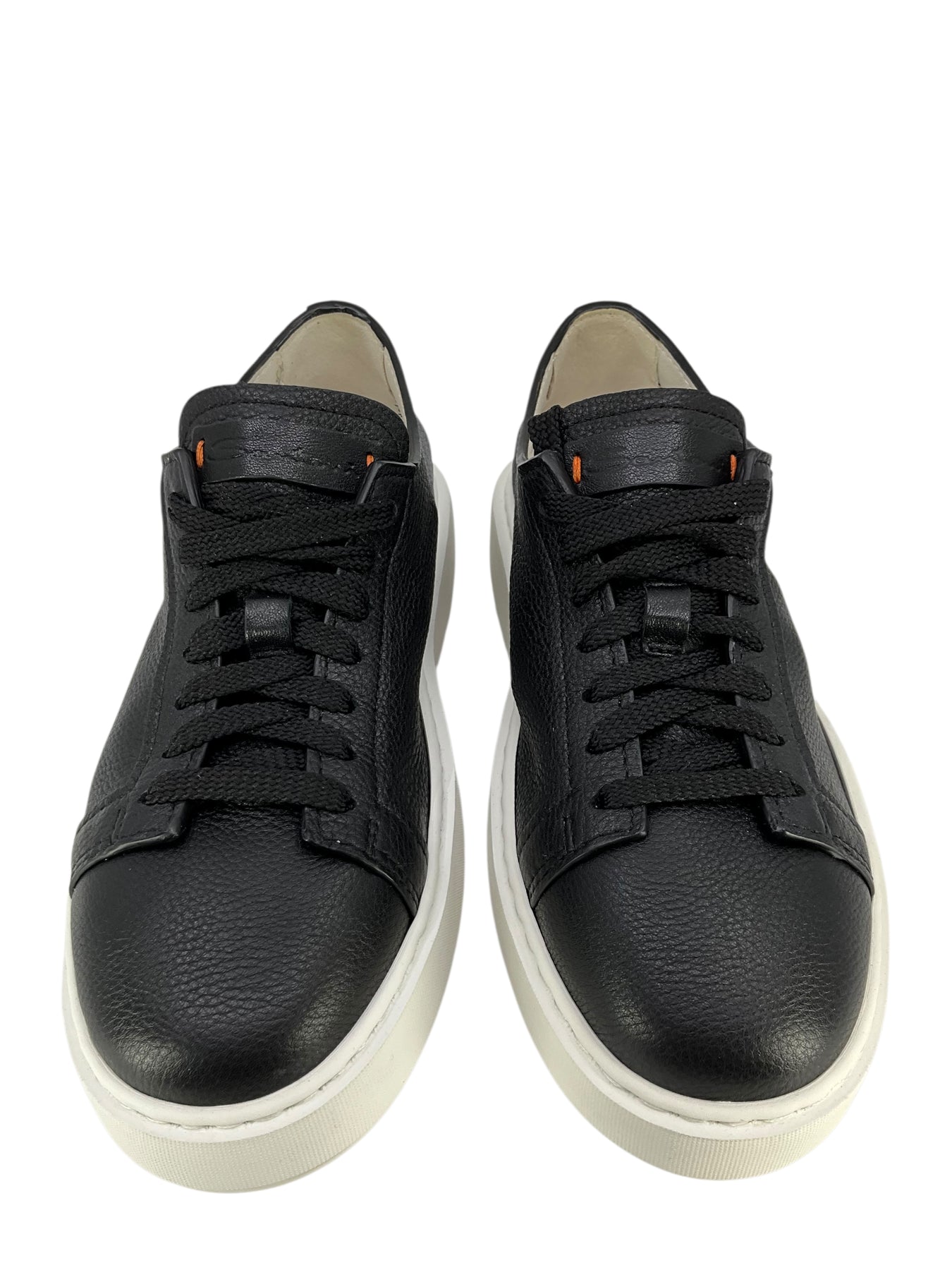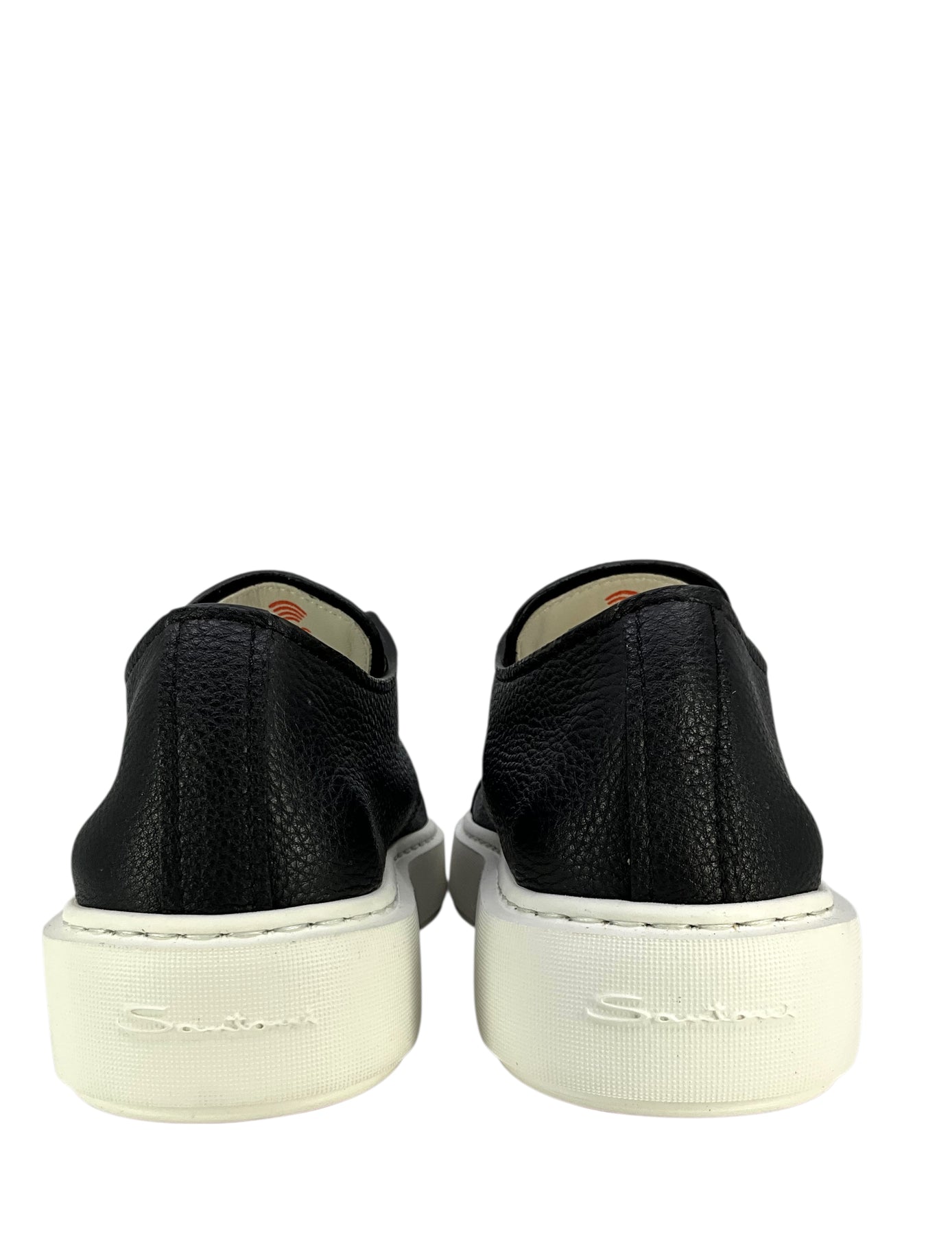 We guarantee authenticity of these never before used SANTONI Leather Lace Up Sneaker Size 6.5 in grained black leather. These drivers feature white soles and tonal black self-toe laces.