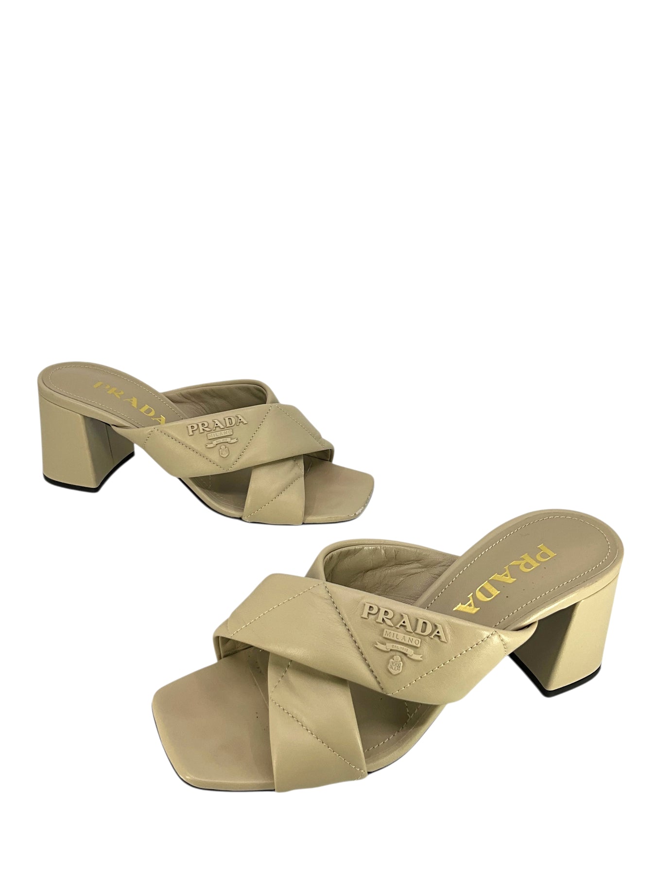 Add these Prada Baltico Quilted Leather Strap Mule Size 5 (IT 35) to your collection! Crafted in a buttery soft beige leather and a chunky block heel. Featuring a signature logo accent and a square open toe.