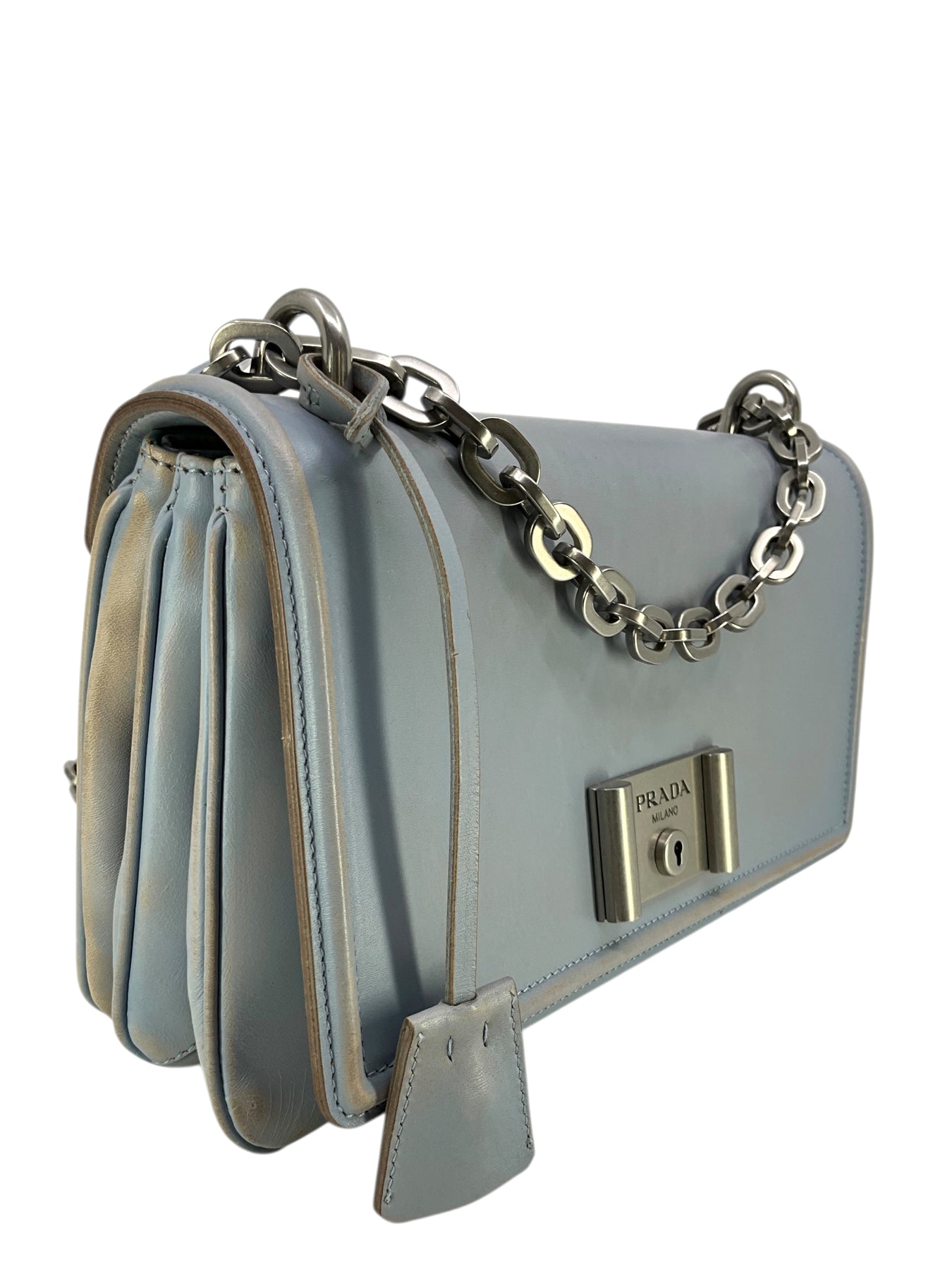 Add to your collection this authentic Prada Distressed Chain Lock Flap Crossbody Bag. This bag is beautifully crafted from blue leather with a distressed trim. Featuring a chain link strap with a leather shoulder pad that can be worn long or doubled.
