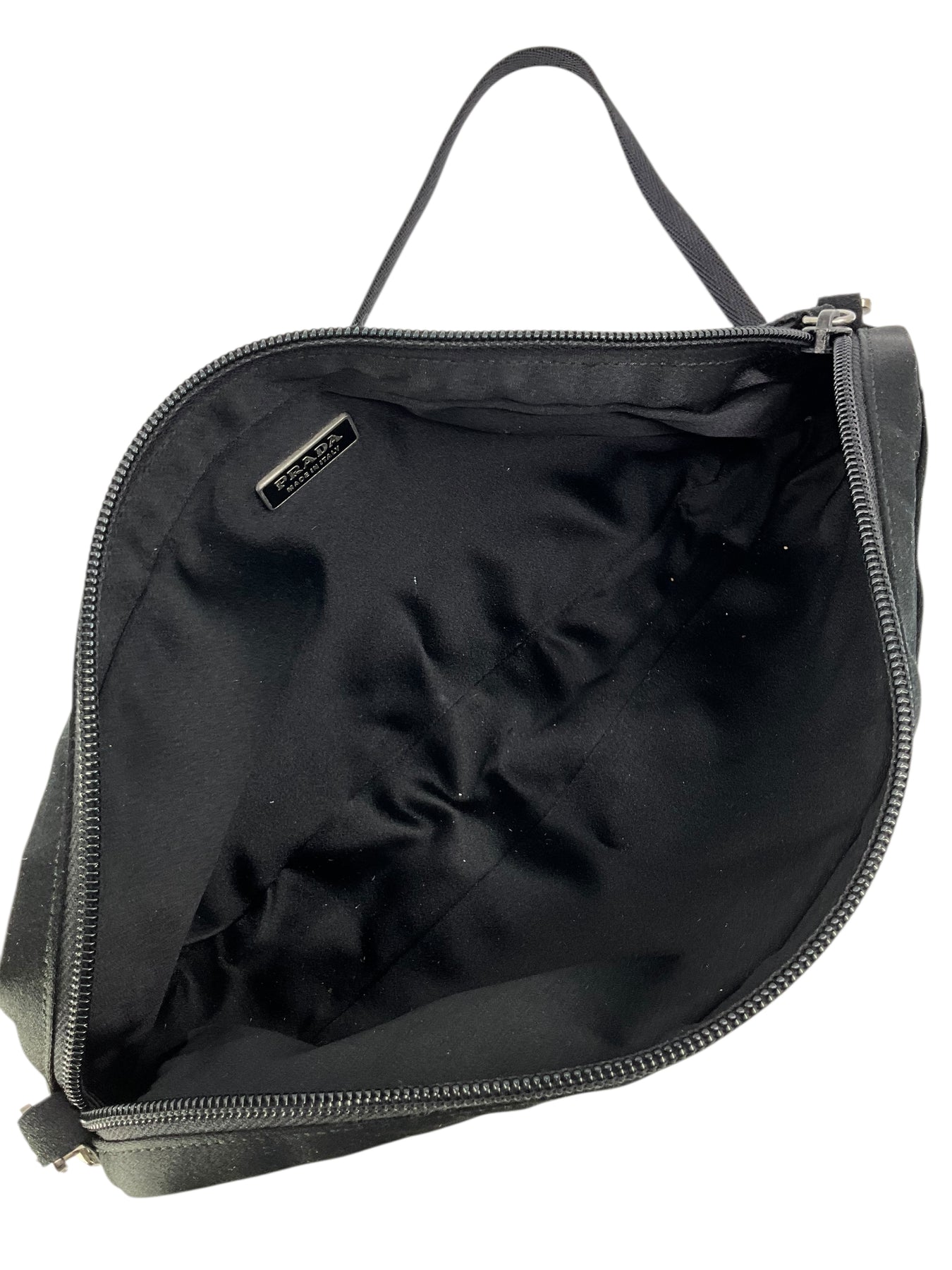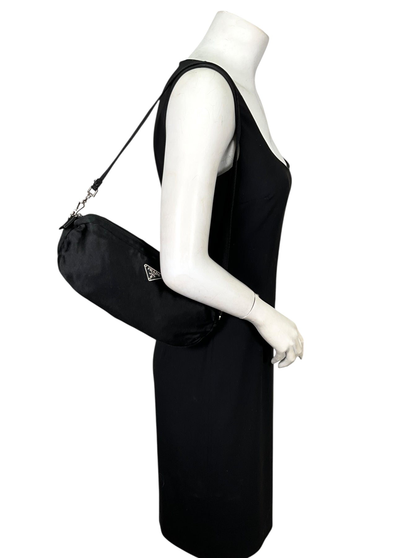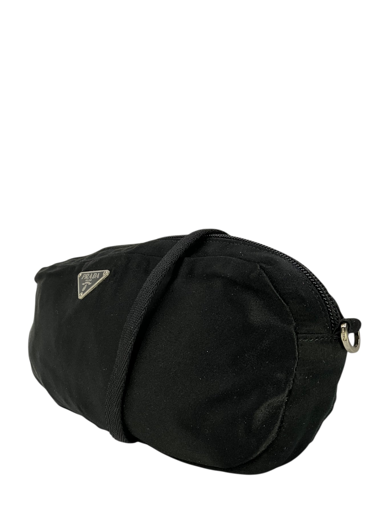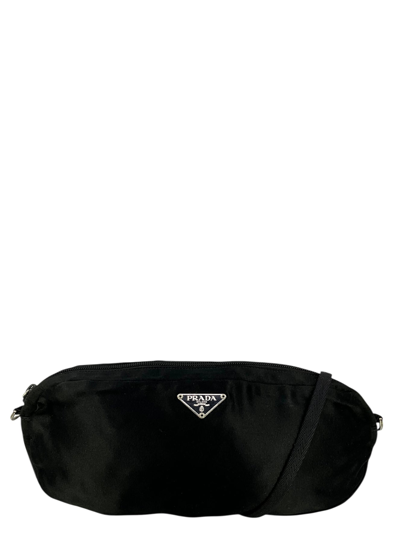 Add to your collection this guaranteed authentic Prada Satin Shoulder Bag in black. This chic bag features a removable shoulder strap, a signature triangle logo at front with a secure single zip closure.