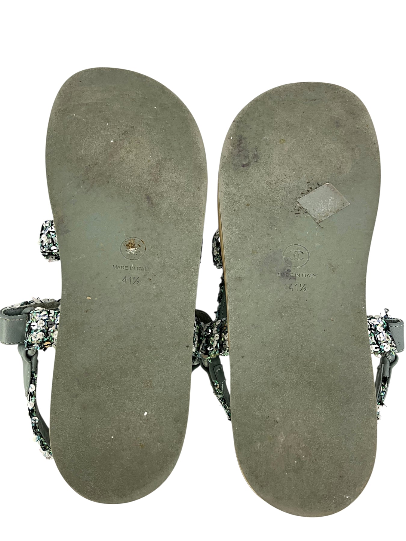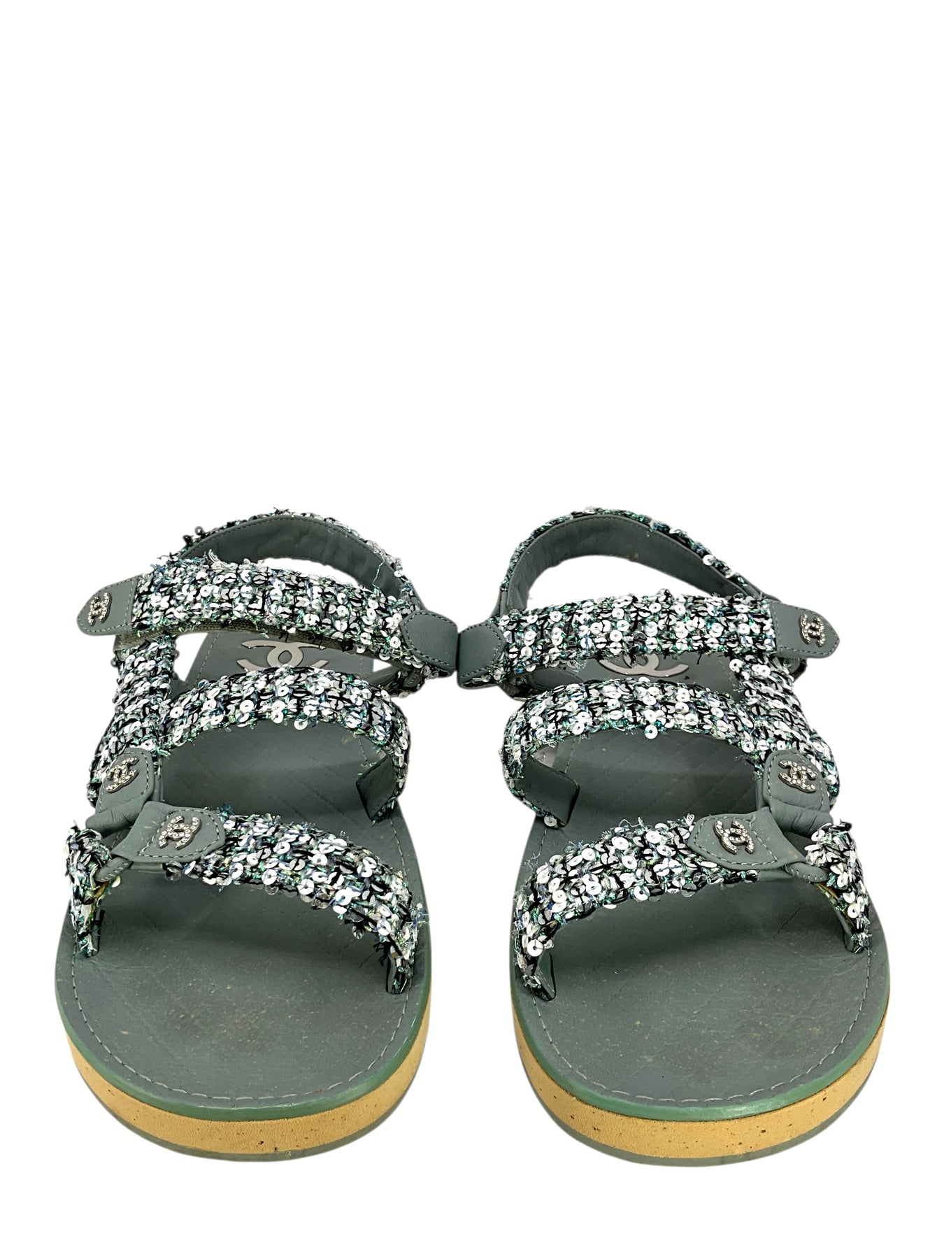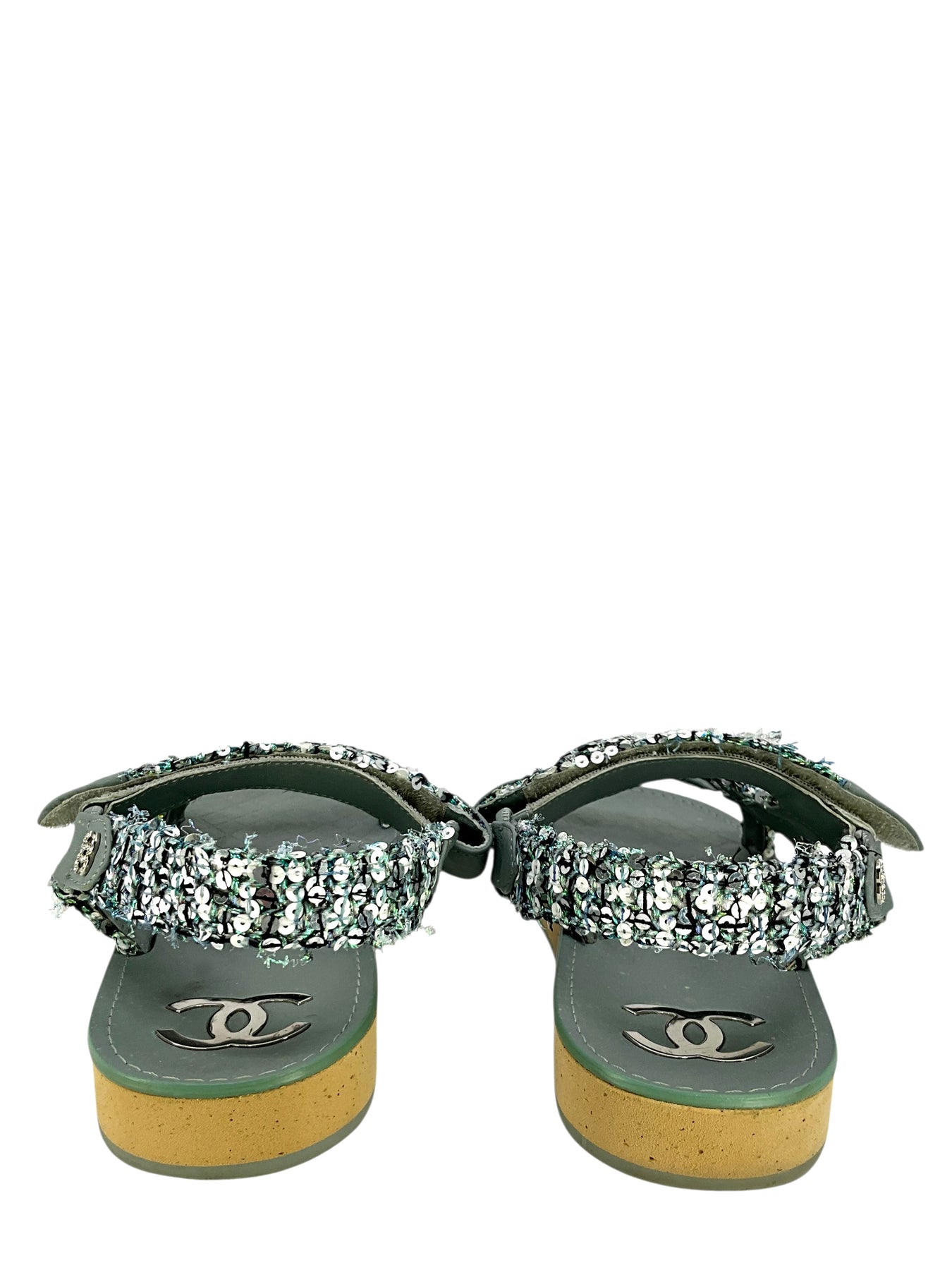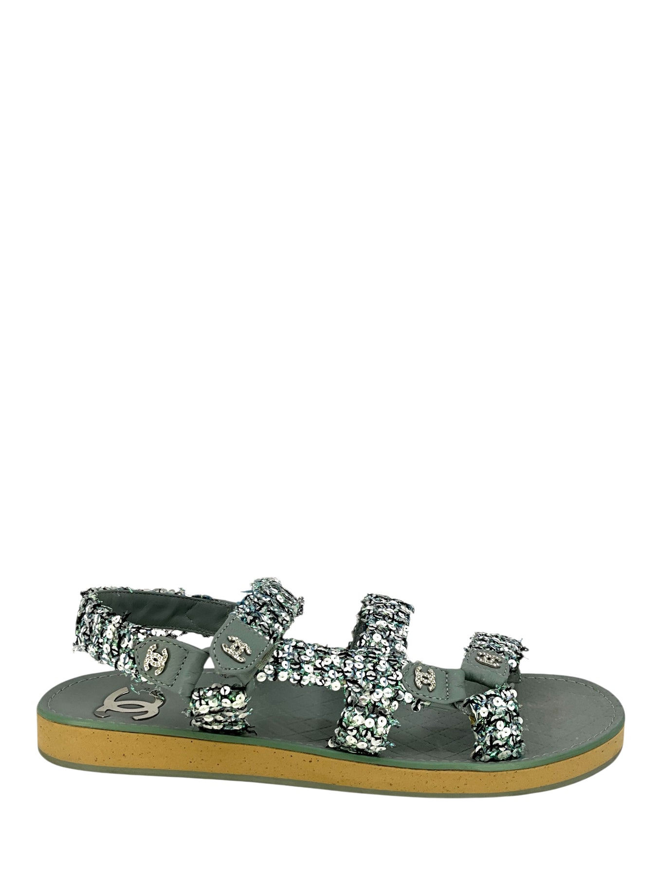 Step out in style with this authentic pair of CHANEL Tweed Sequin Crystal CC Sandals Size 11.5 | 41.5 crafted in mint green. These sandals feature adjustable ankle straps with silver-tone CC logo's throughout.