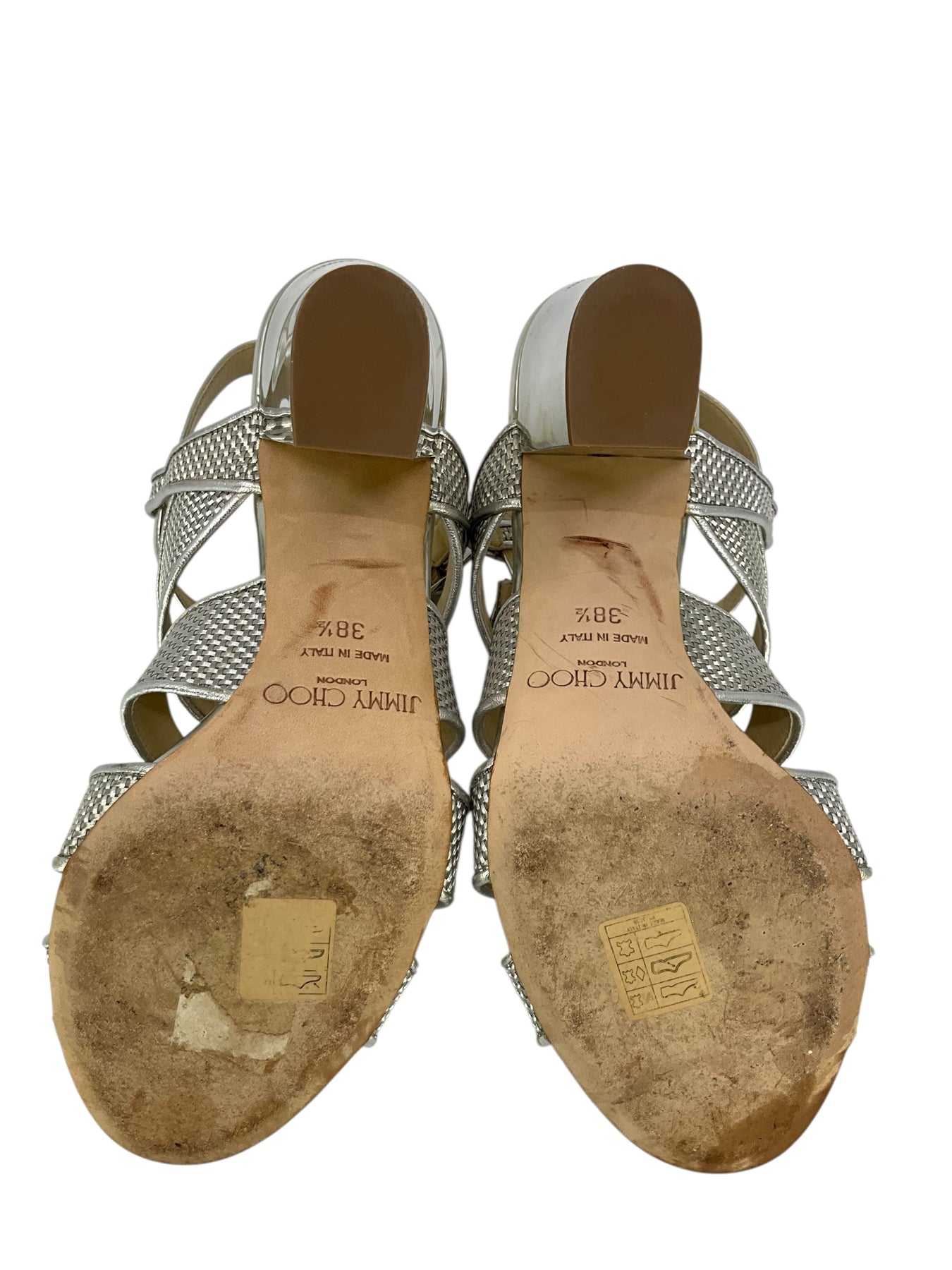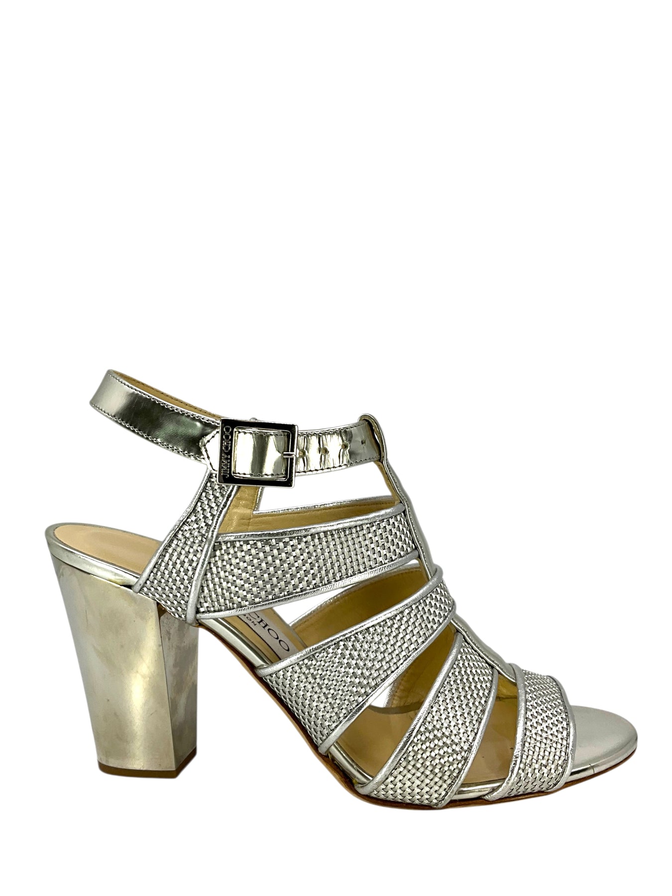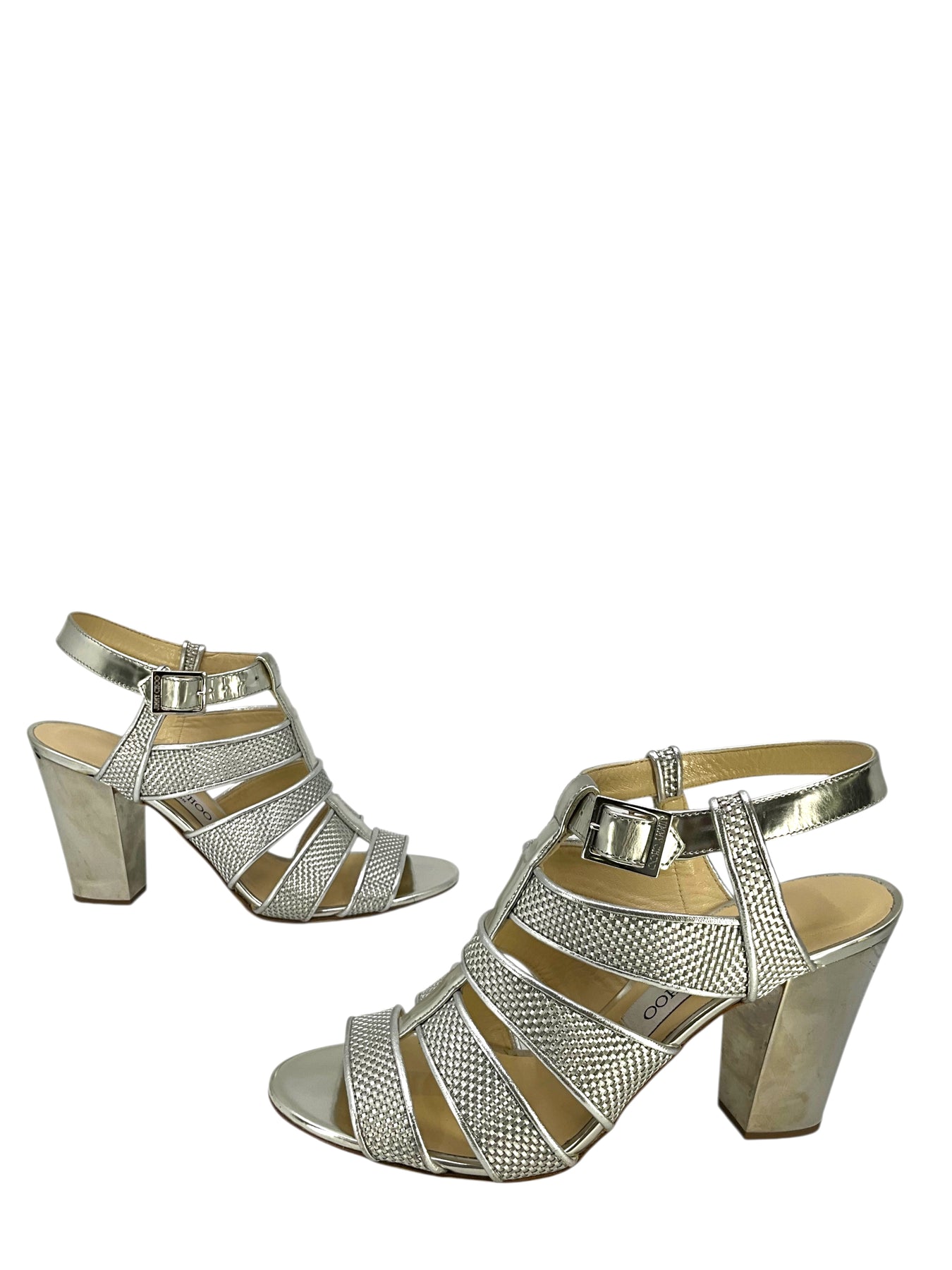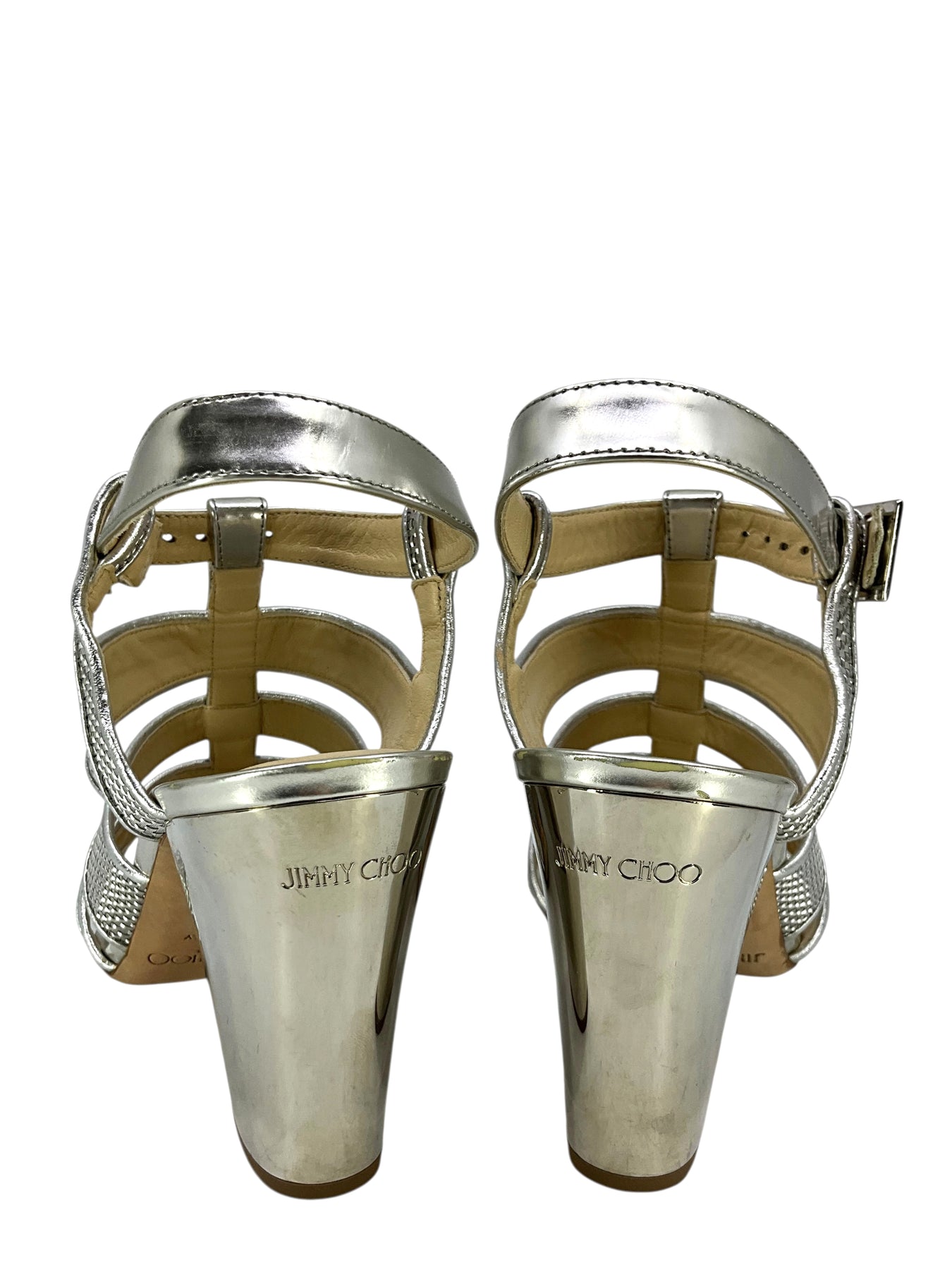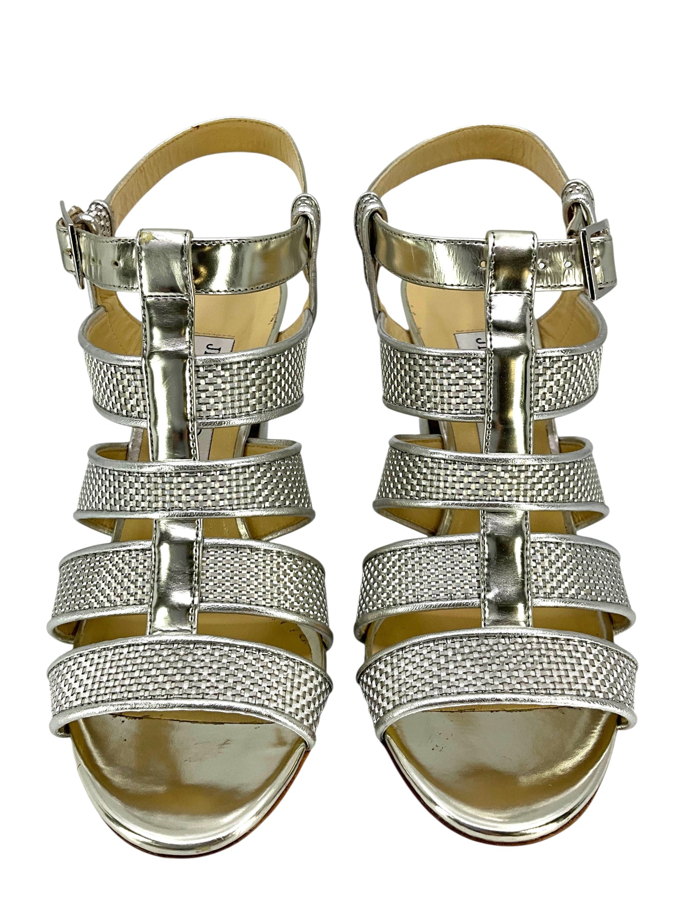 Step out in style with this authentic, never before used pair of JIMMY CHOO Metallic Strappy Caged Sandals Size 8.5. They’re finely crafted in Italy from metallic silver leather to an open cage construction and set on a chunky metallic metal logo-engraved heel.