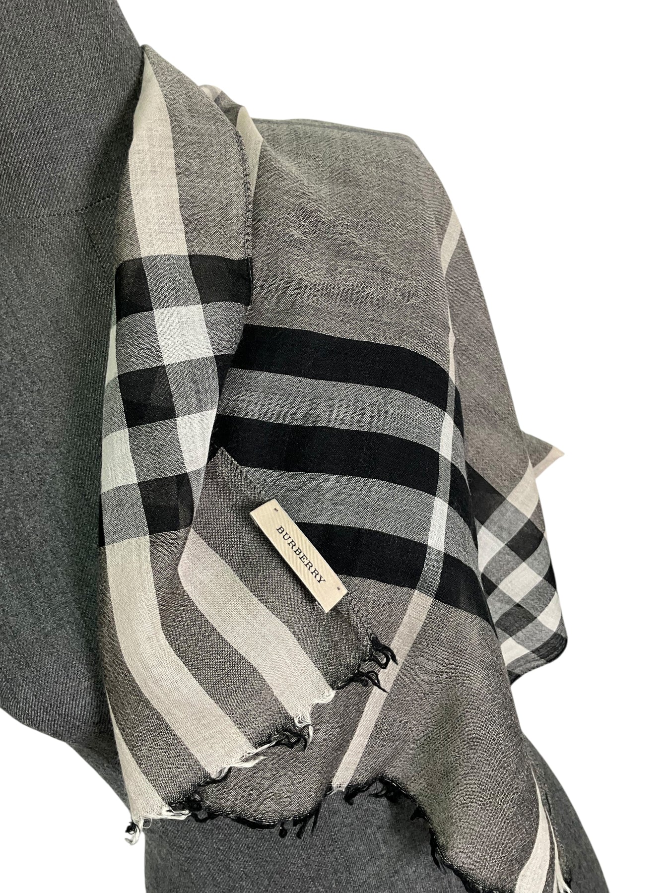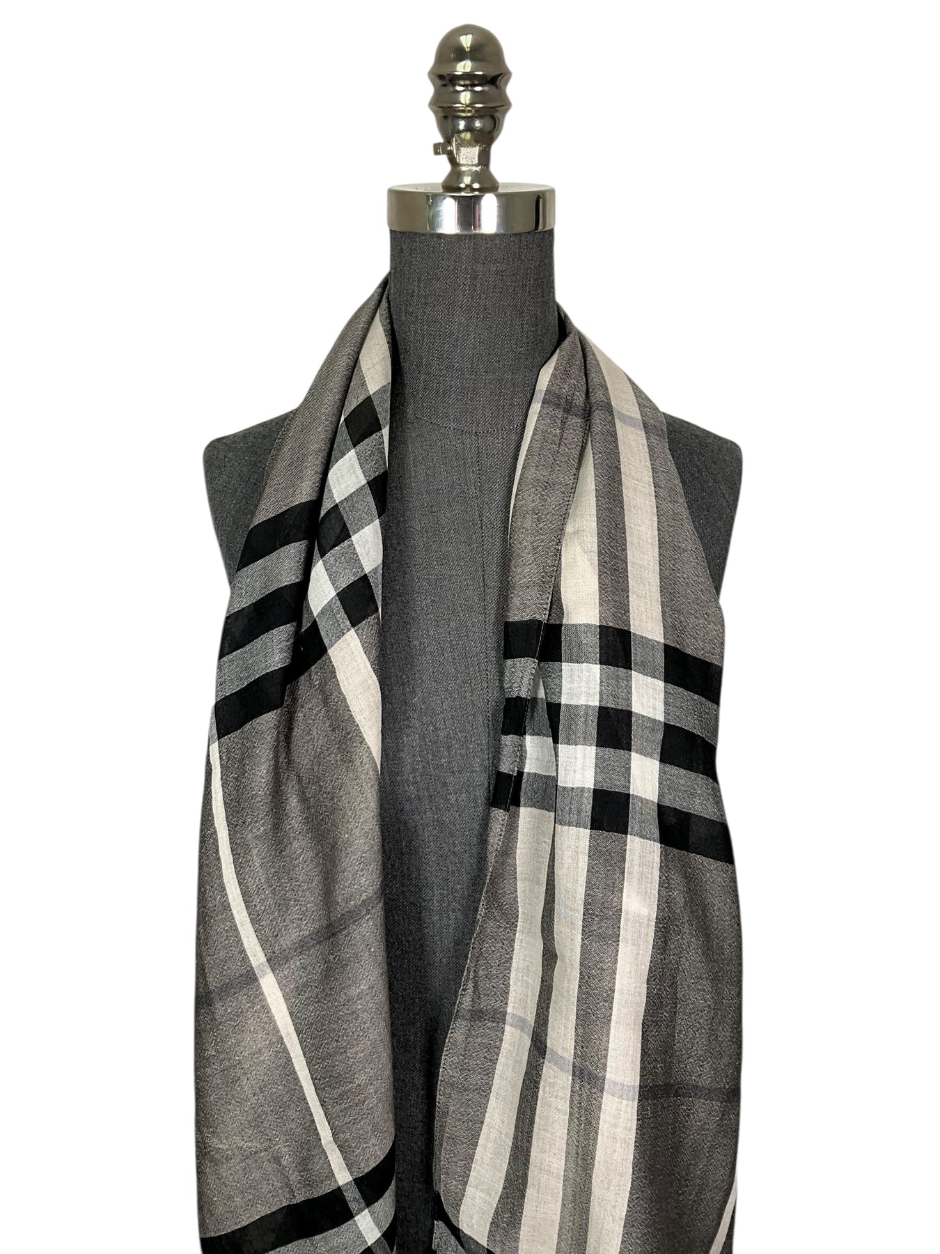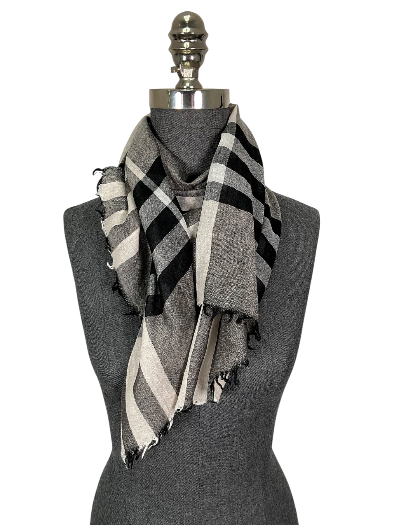 Add this beautiful classic Burberry Wool Silk Gauze Giant Check Scarf to your collection. This scarf features the iconic check in gray and black with a fringed trim.