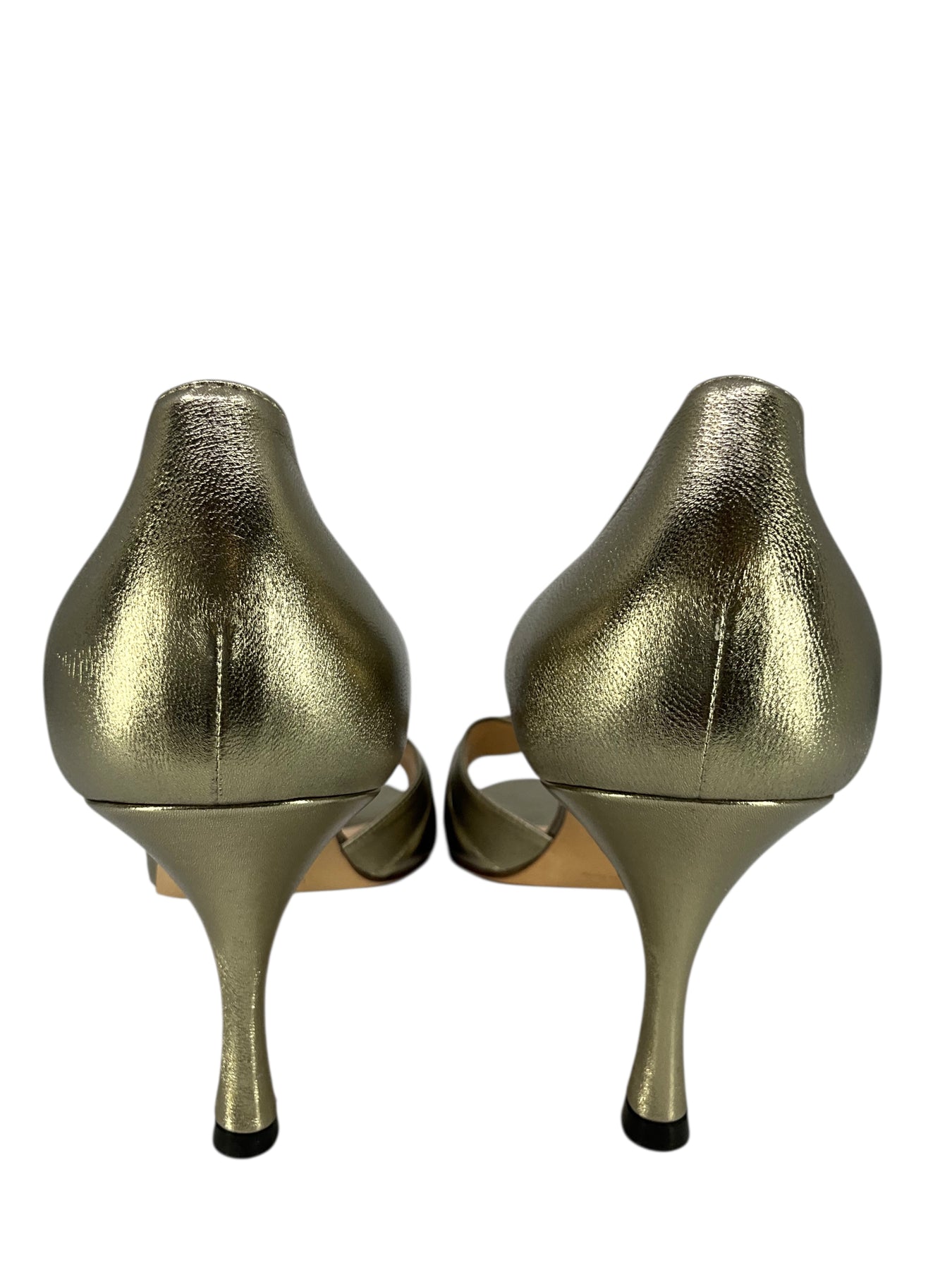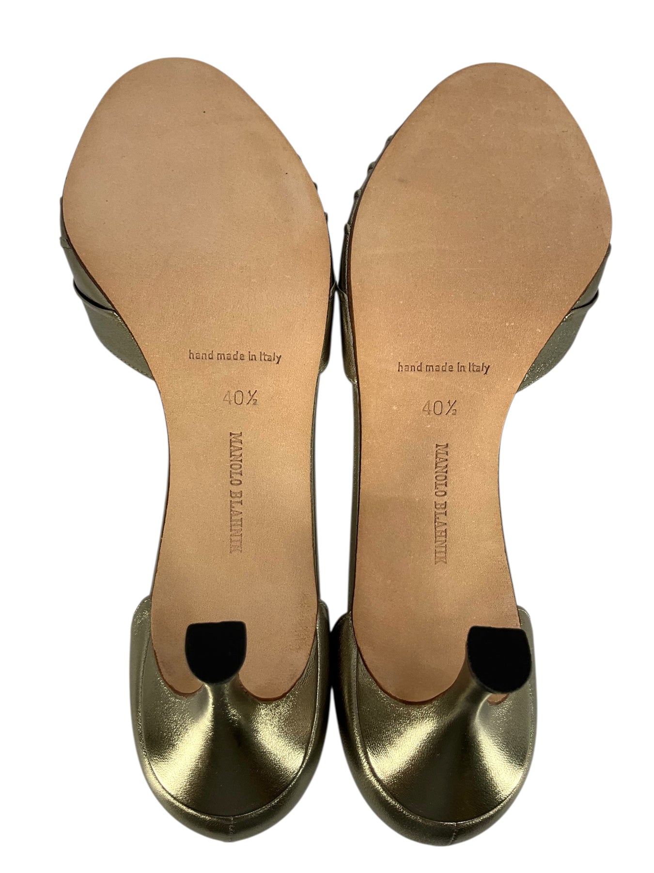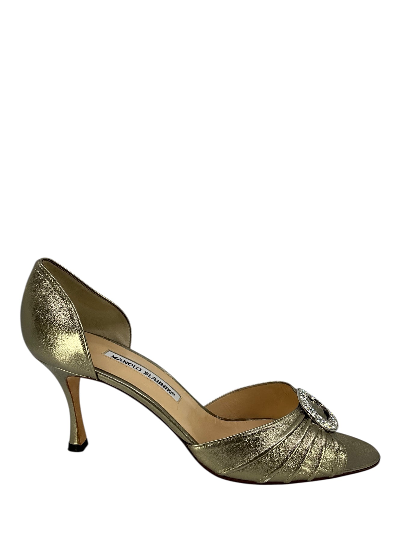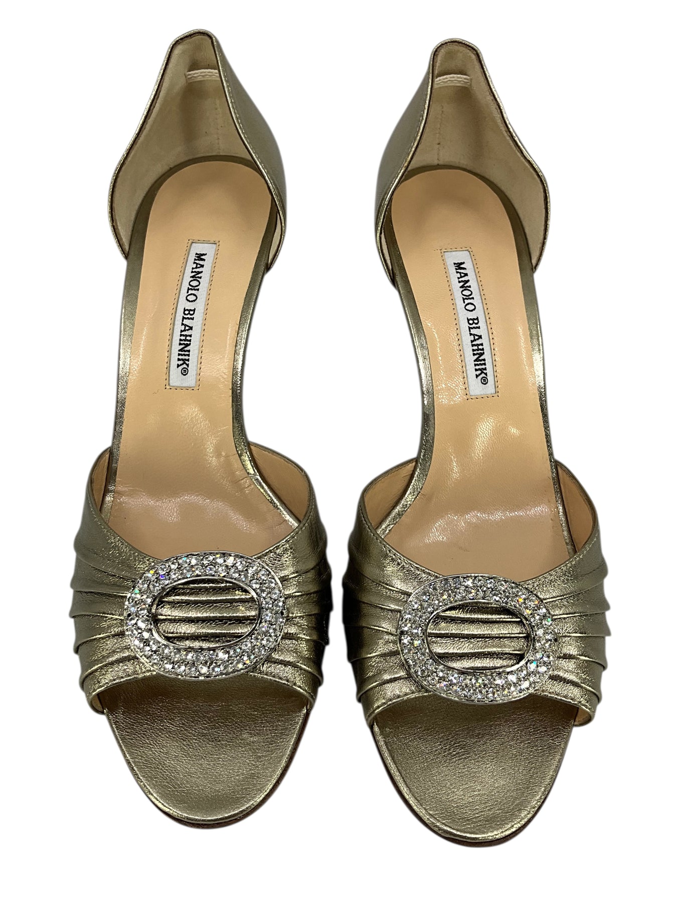 Add to your collection these classic, guaranteed authentic Manolo Blahnik Sedaraby Embellished Satin d'Orsay Pumps Size 10.5 (IT 40.5) crafted from beautiful metallic gold leather with an open toe. Featuring pleat detail with a crystal-embellishment on the vamp, a stieltto heel and creamy leather insoles.