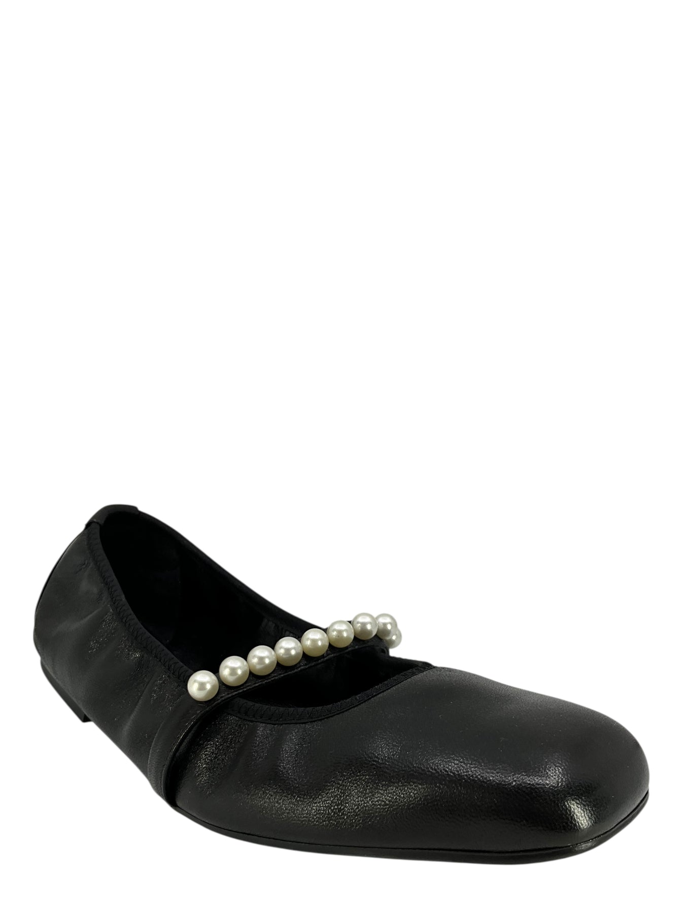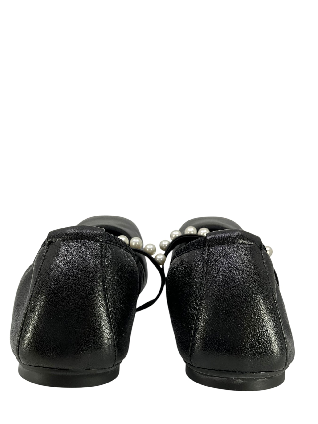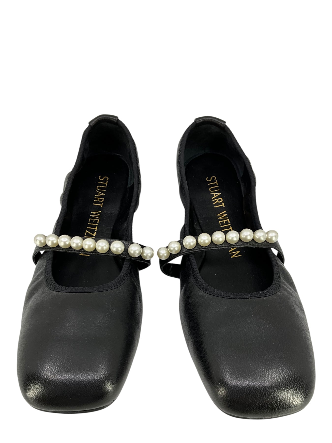 Guaranteed authentic STUART WEITZMAN Goldie Pearl Leather Ballet Flats Size 10 crafted from black leather with a slightly-squared toe. Featuring a pearl-adorned elastic strap.