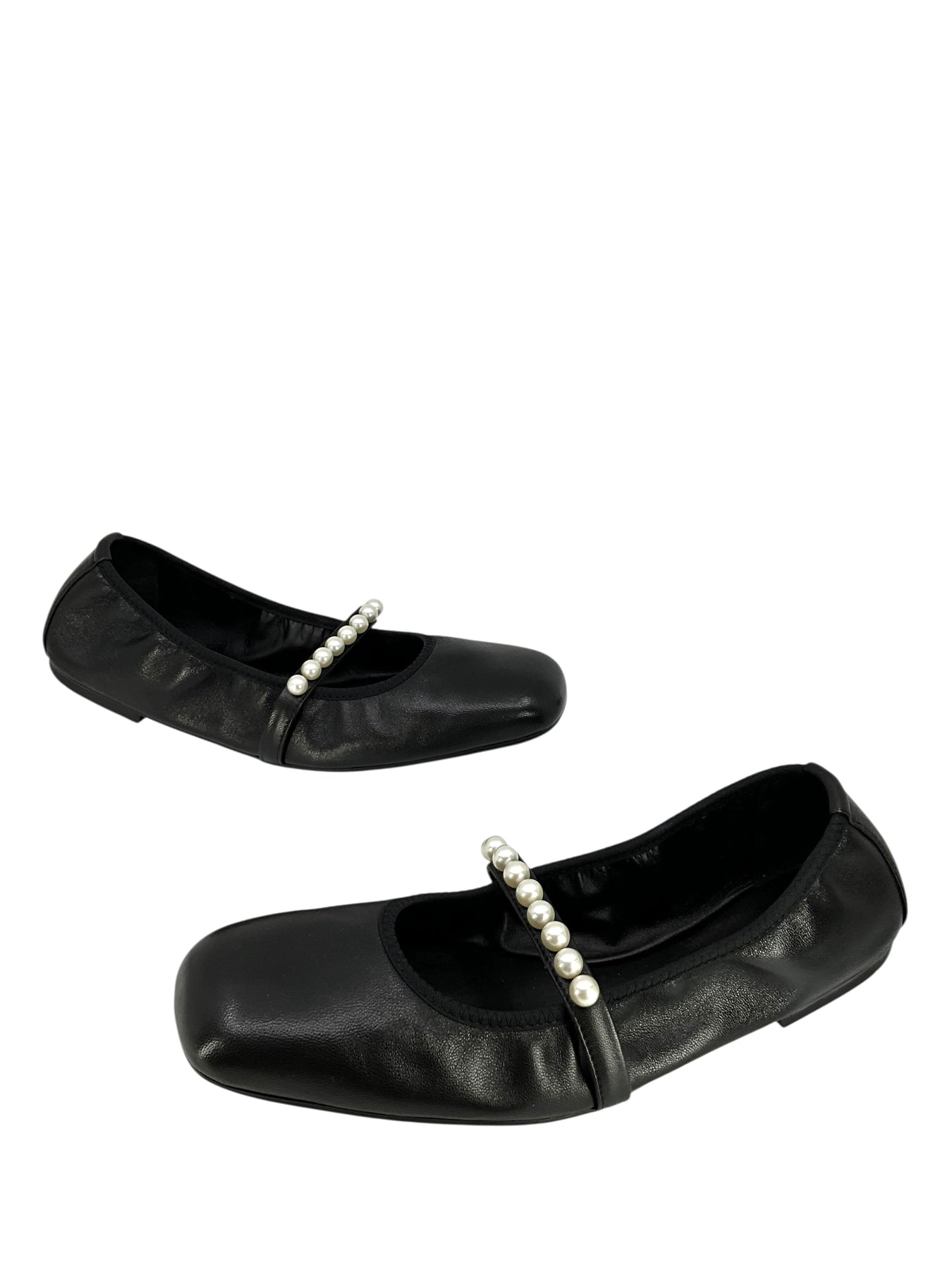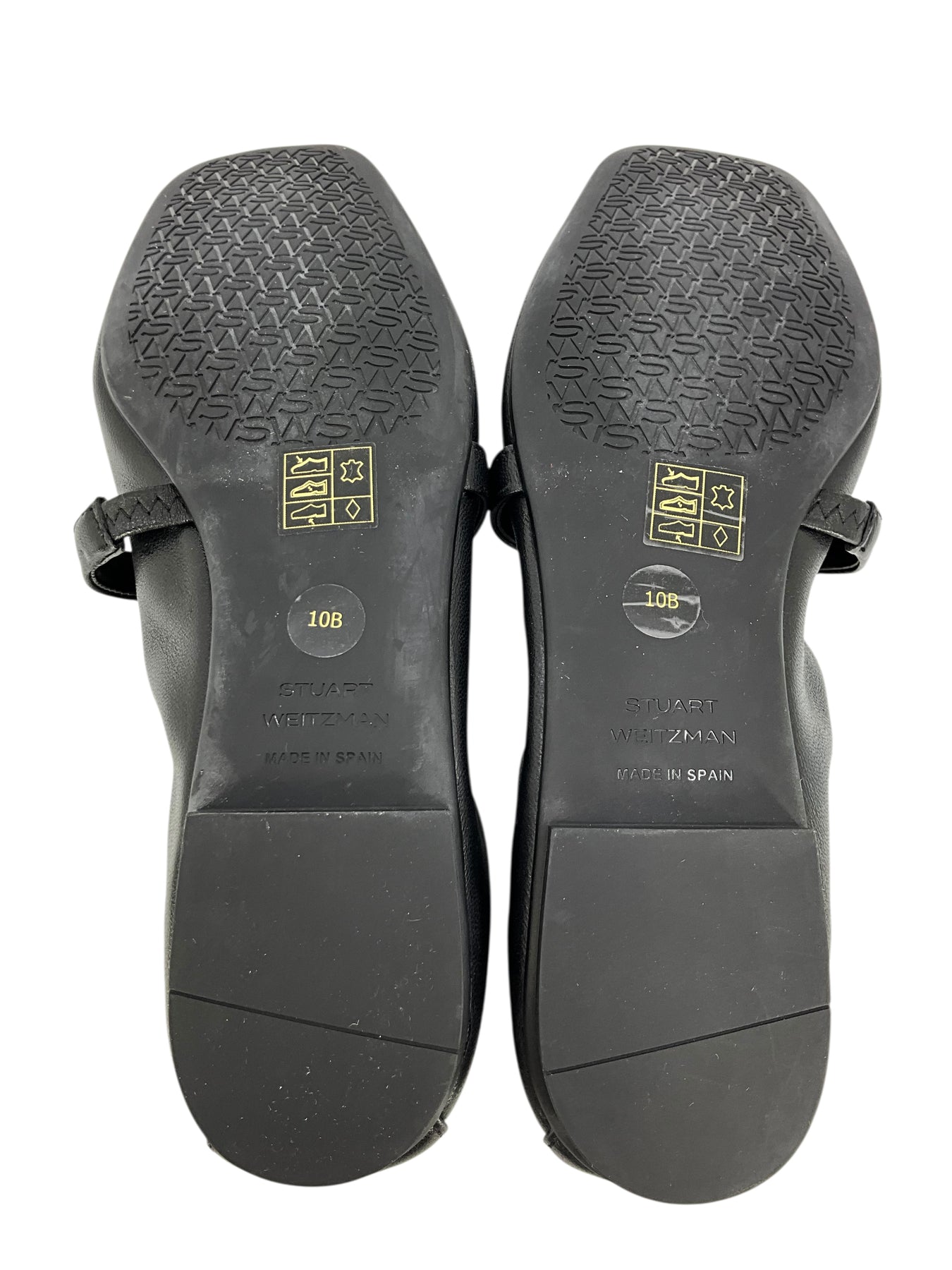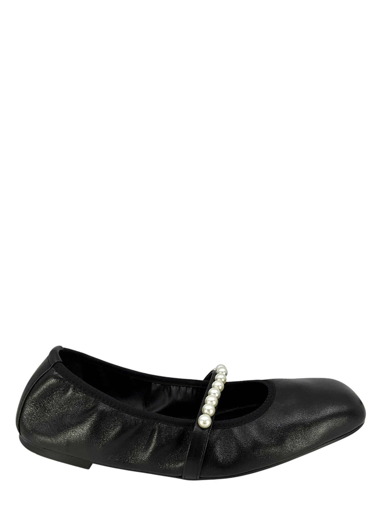 Guaranteed authentic STUART WEITZMAN Goldie Pearl Leather Ballet Flats Size 10 crafted from black leather with a slightly-squared toe. Featuring a pearl-adorned elastic strap.
