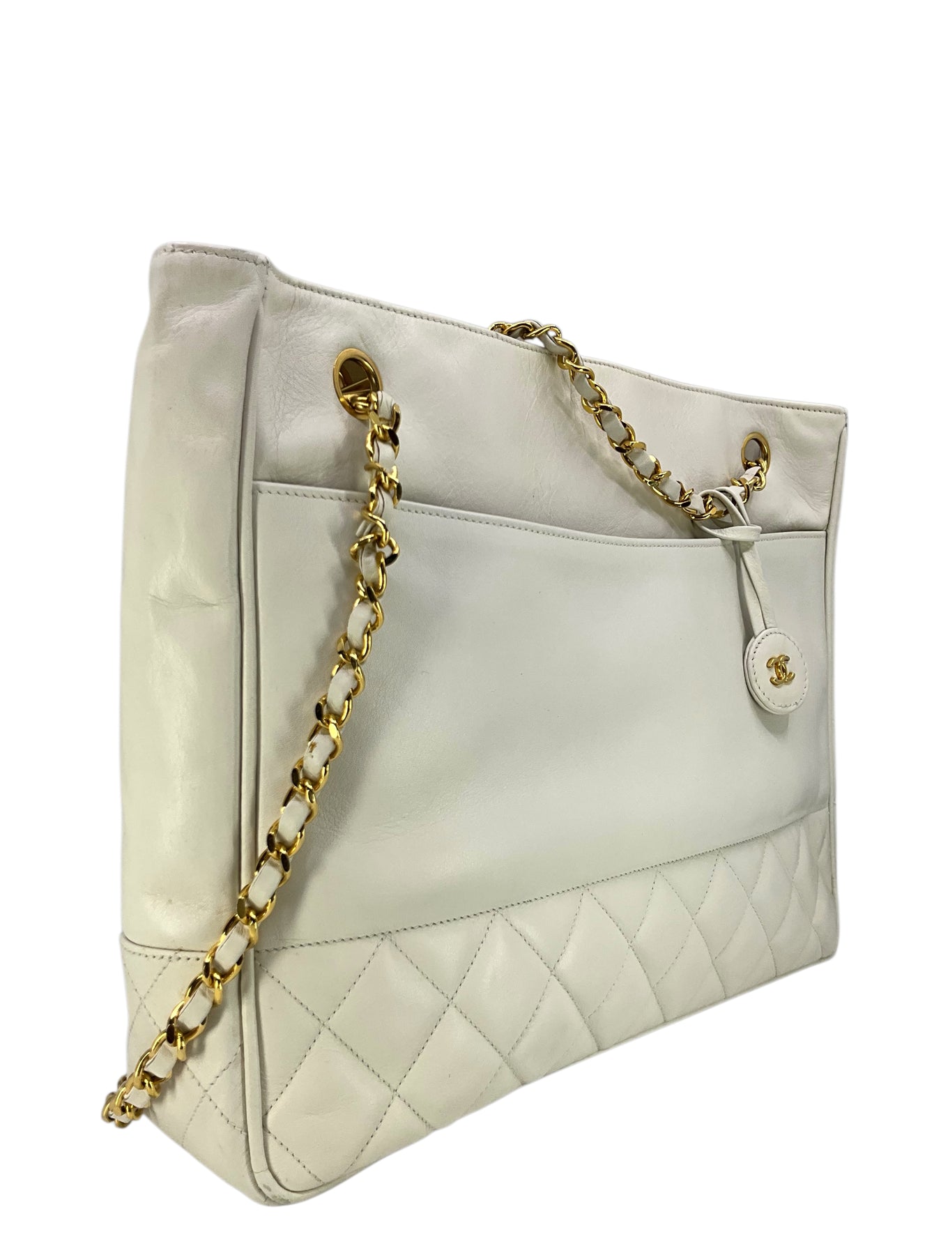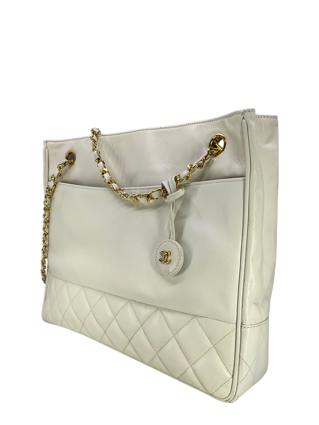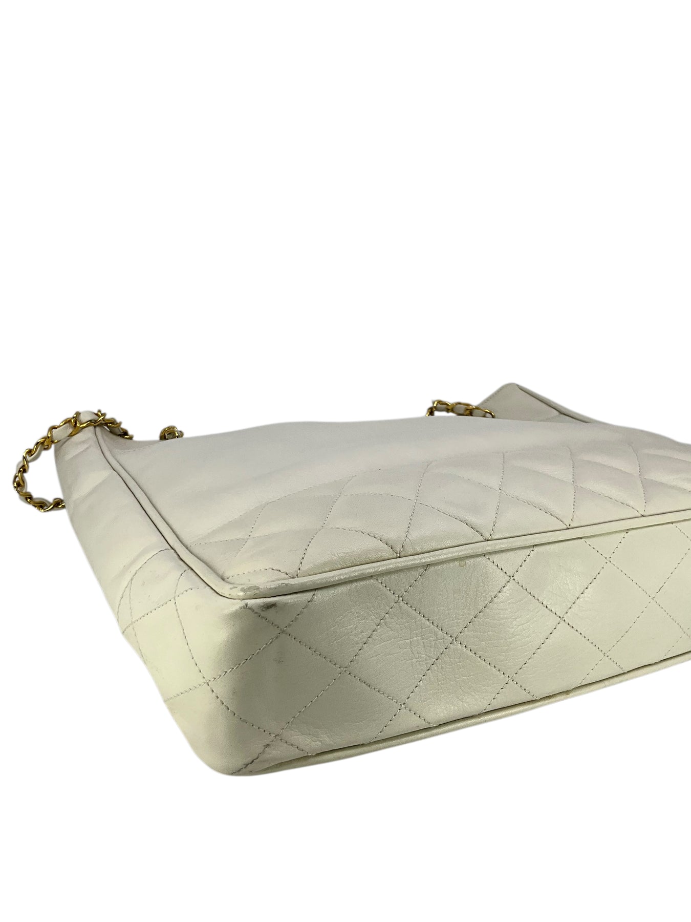 We guarantee the authenticity of this gorgeous Chanel Vintage Lambskin Quilted Shoulder Bag crafted from signature white diamond quilted lambskin leather and beautiful gold-tone hardware. This chic and functional bag features dual chain link shoulder straps threaded with tonal leather, a hanging 'CC' logo charm, an exterior front compartment and secure dual snap closures.