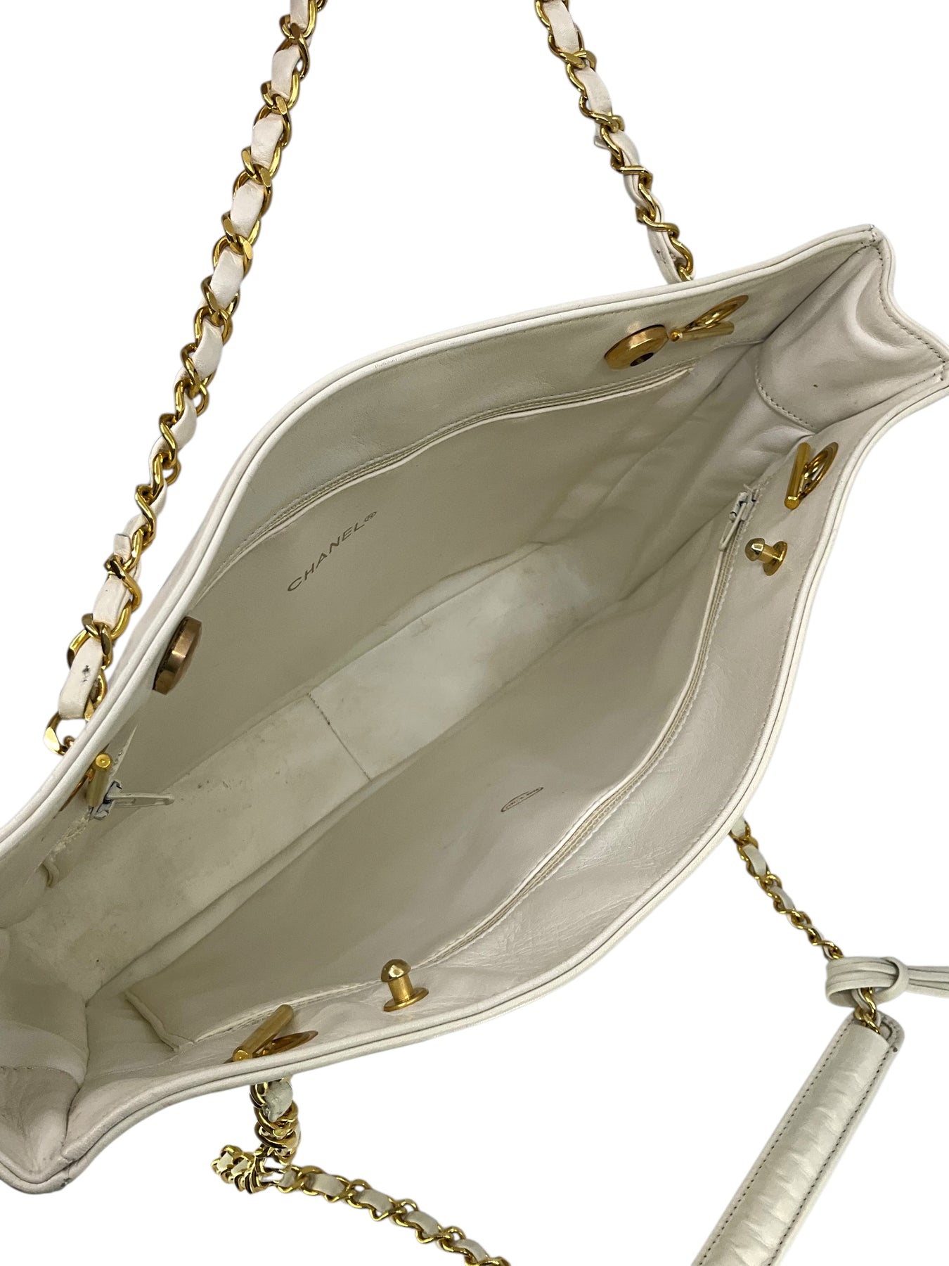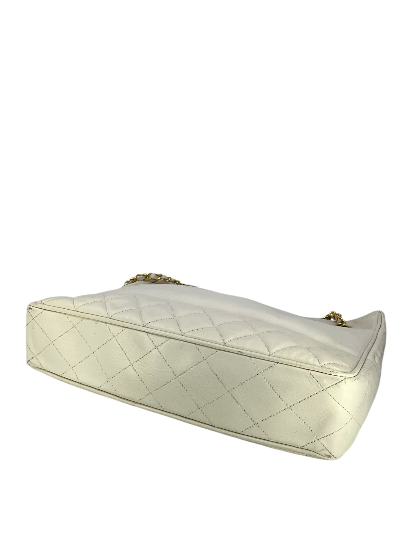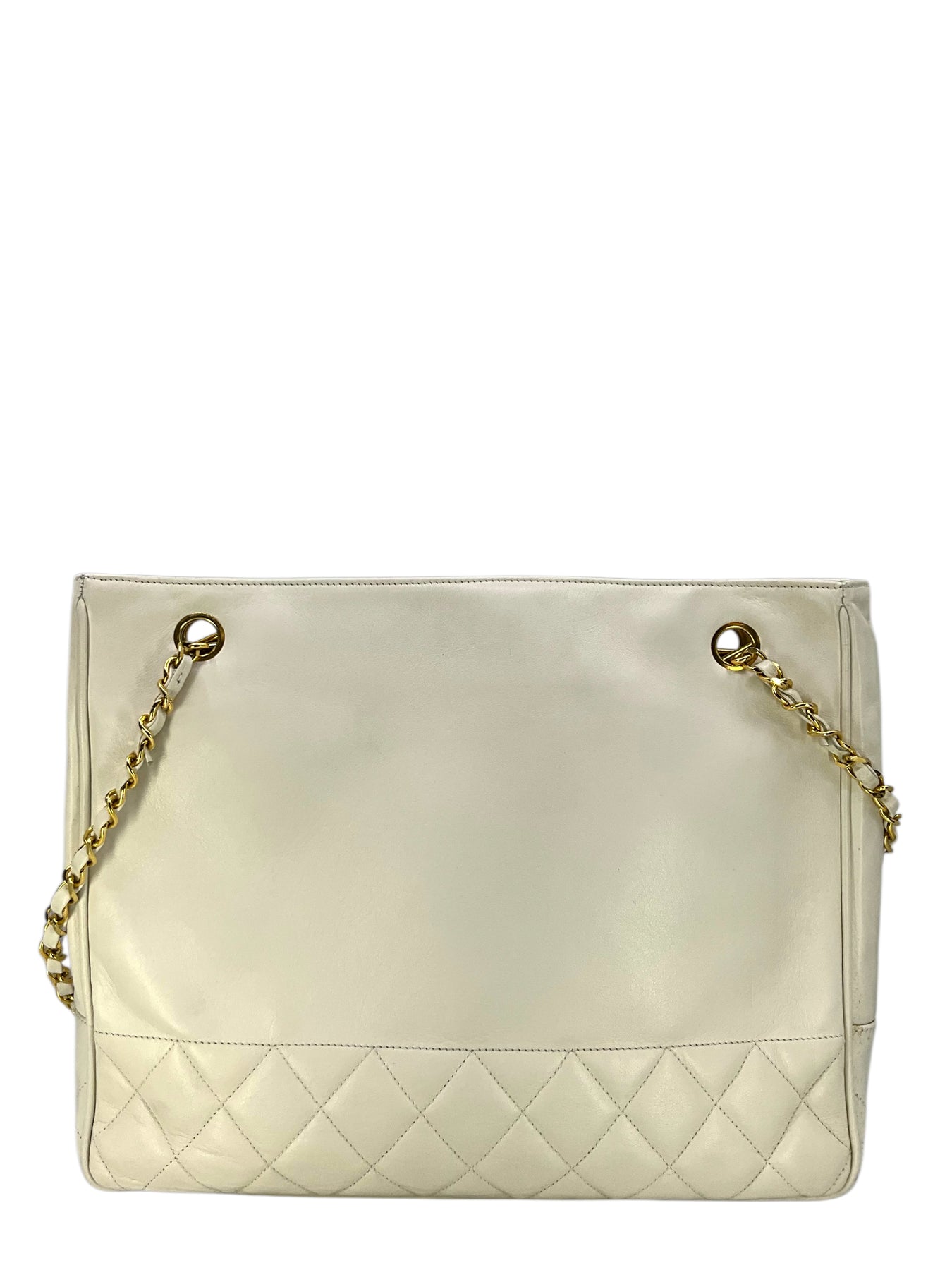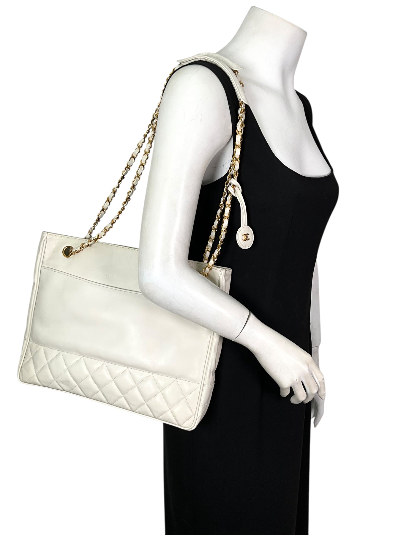 We guarantee the authenticity of this gorgeous Chanel Vintage Lambskin Quilted Shoulder Bag crafted from signature white diamond quilted lambskin leather and beautiful gold-tone hardware. This chic and functional bag features dual chain link shoulder straps threaded with tonal leather, a hanging 'CC' logo charm, an exterior front compartment and secure dual snap closures.