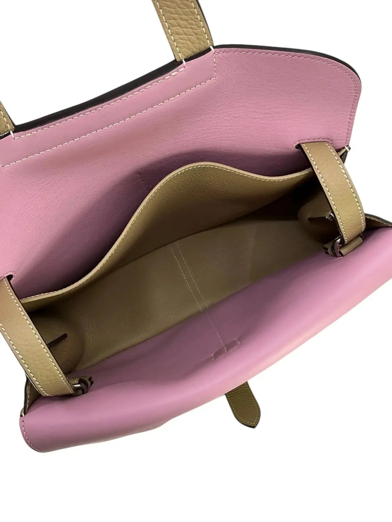 We guarantee authenticity of this Hermes Clemence Leather Halzan Verso 31 with Palladium hardware in the largest size. Expertly crafted in taupe pebbled leather with a smooth contrasting pink leather accent on the front flap. Featuring dual top handles, including an adjustable shoulder strap and a secure frontal flap with a buckle closure.