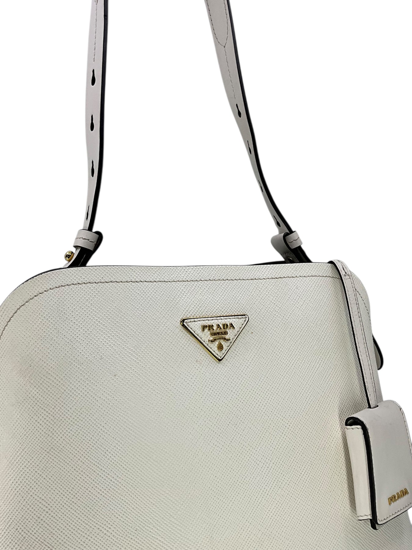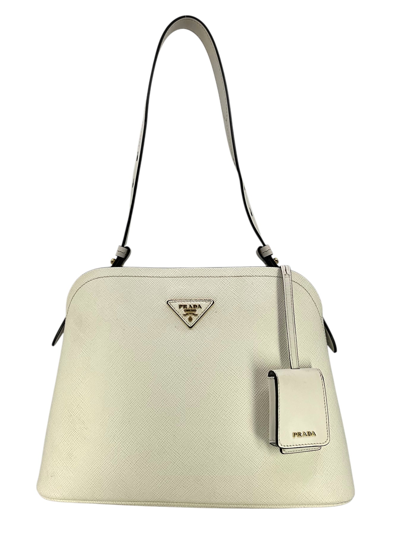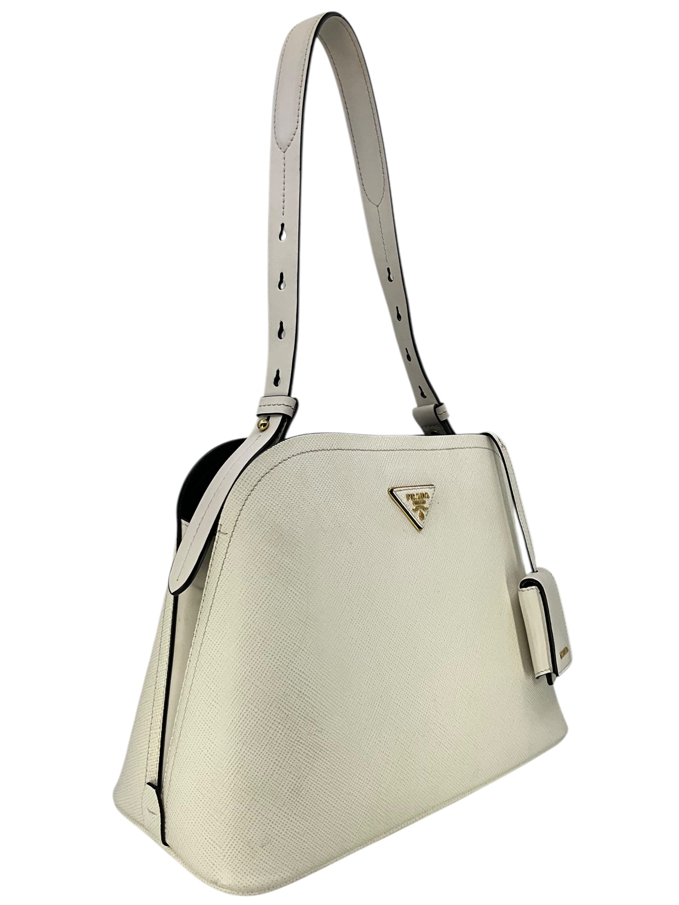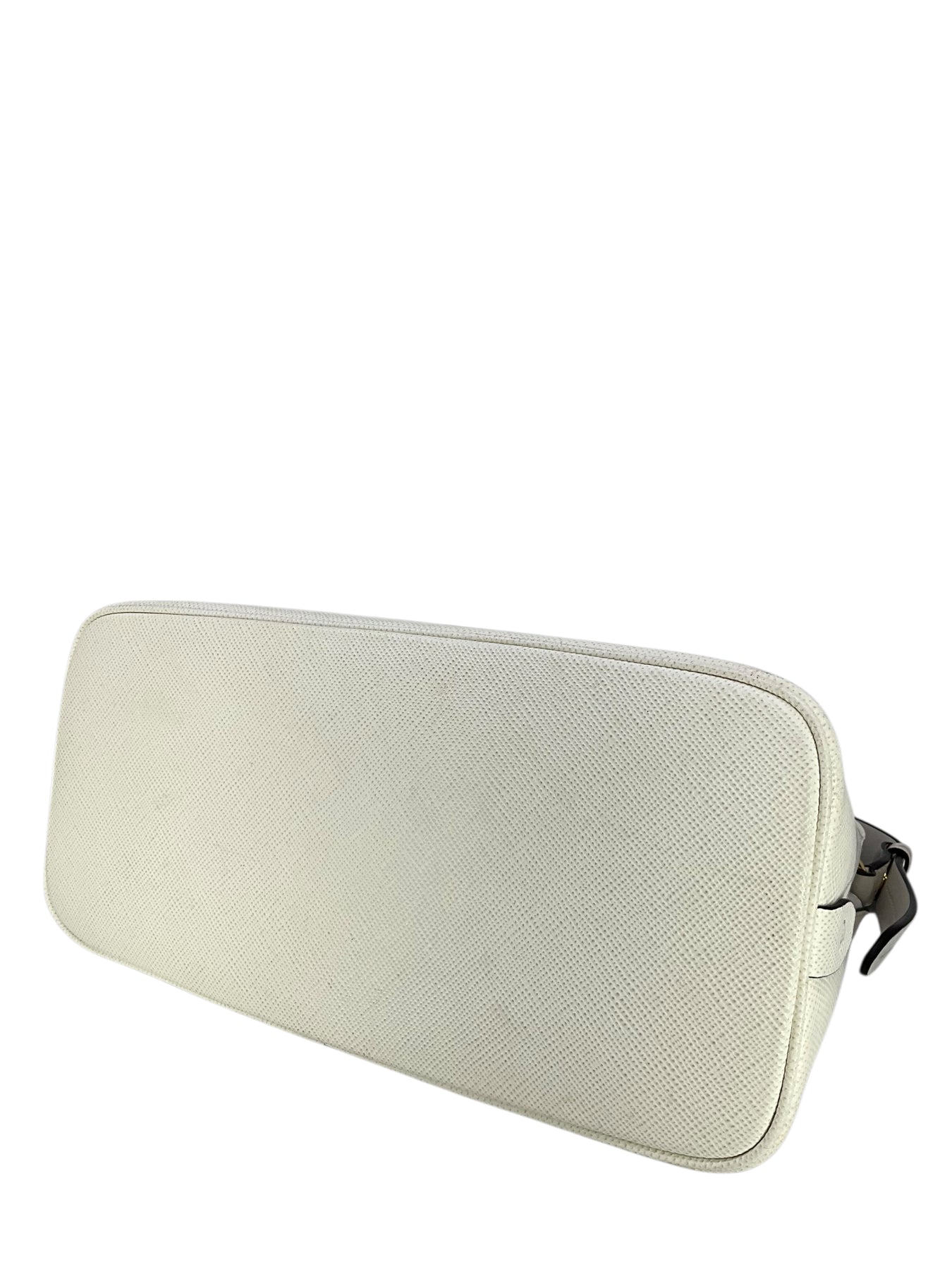 Add to your collection this authentic Prada Saffiano Cuir Medium Matinee Tote crafted from textured white Saffiano cross-grain leather and gold-tone hardware. It features an adjustable shoulder strap, a signature triangle logo at front and dual functional interior compartments with a center dividing zip compartment.