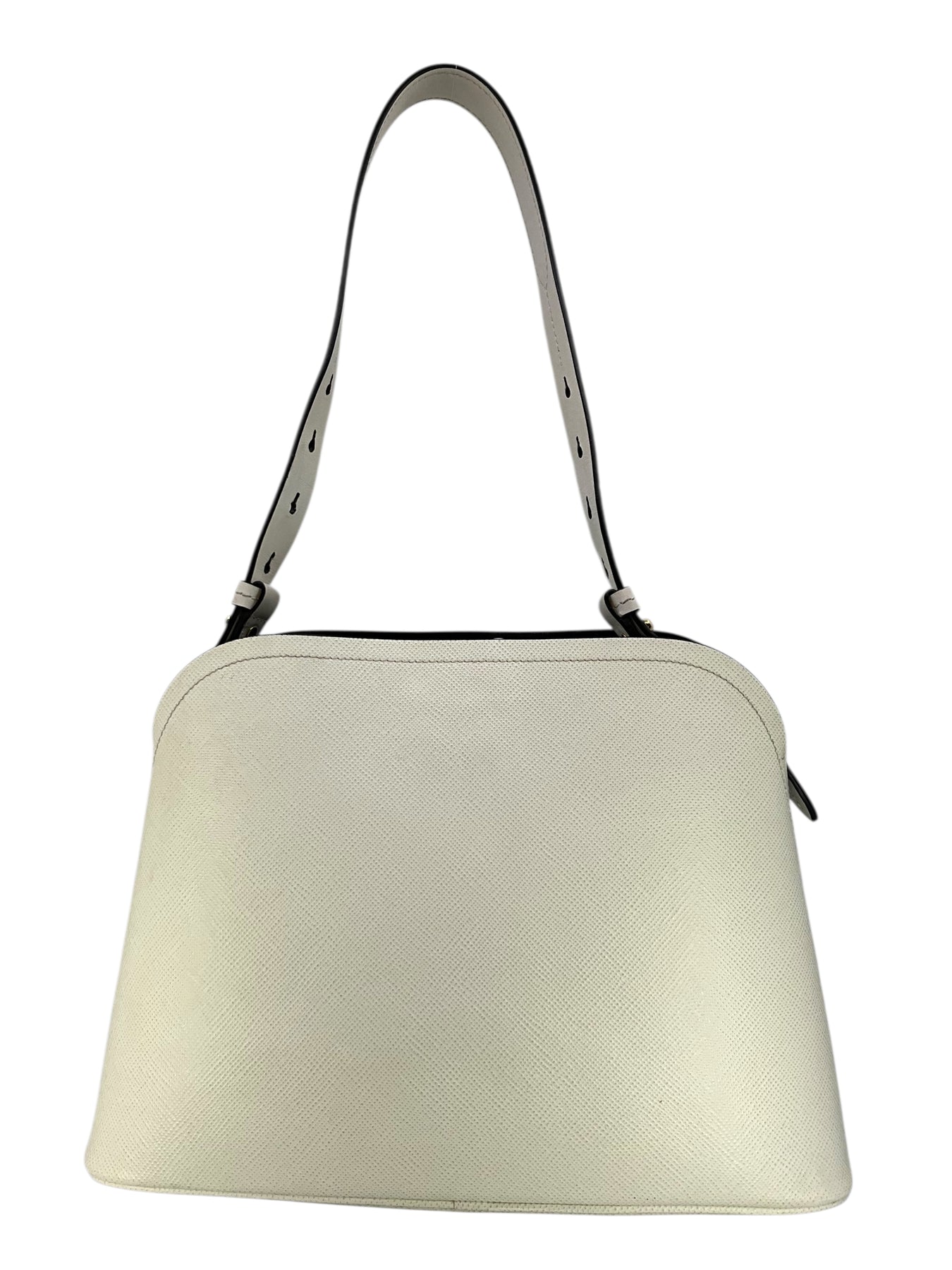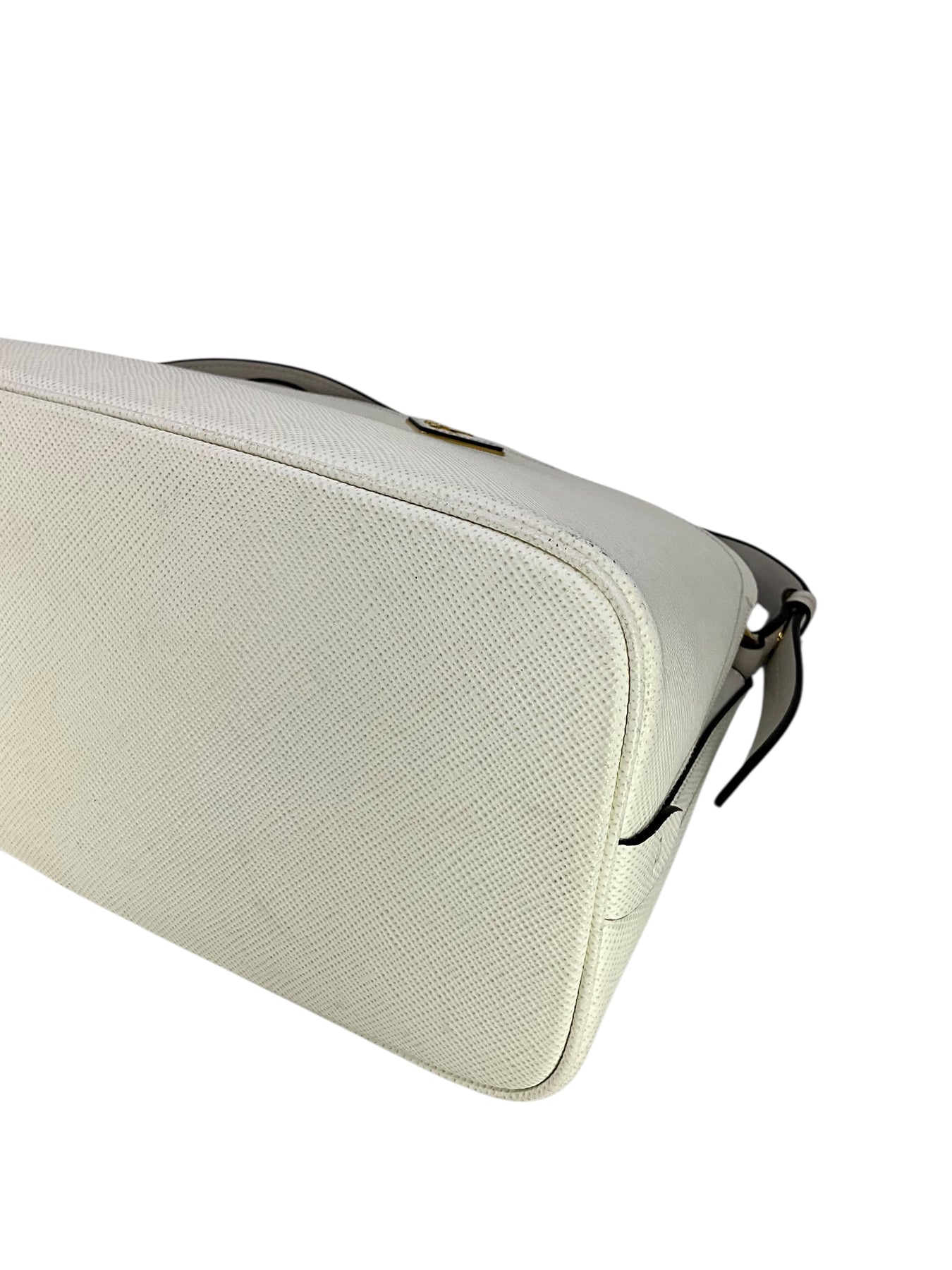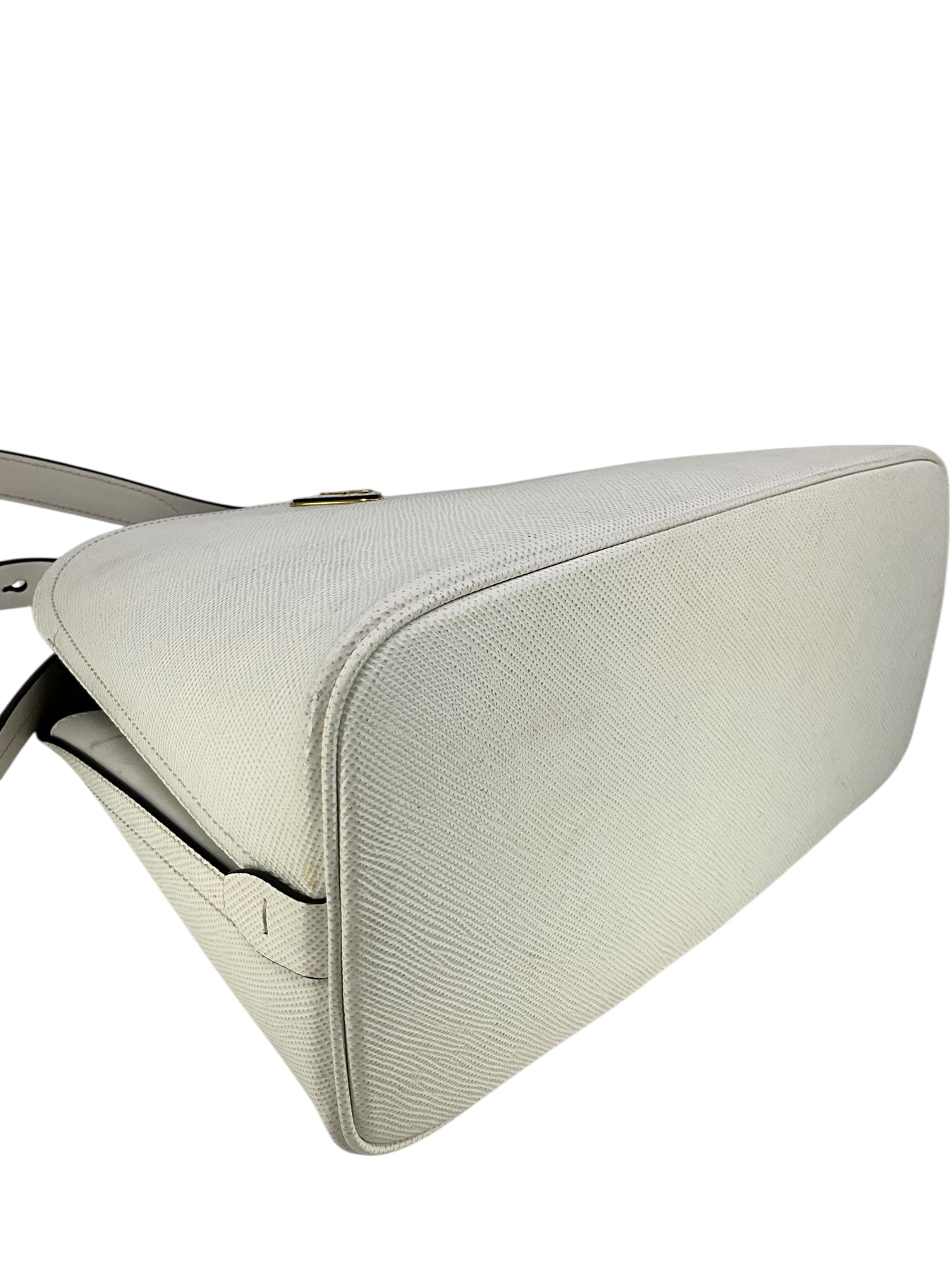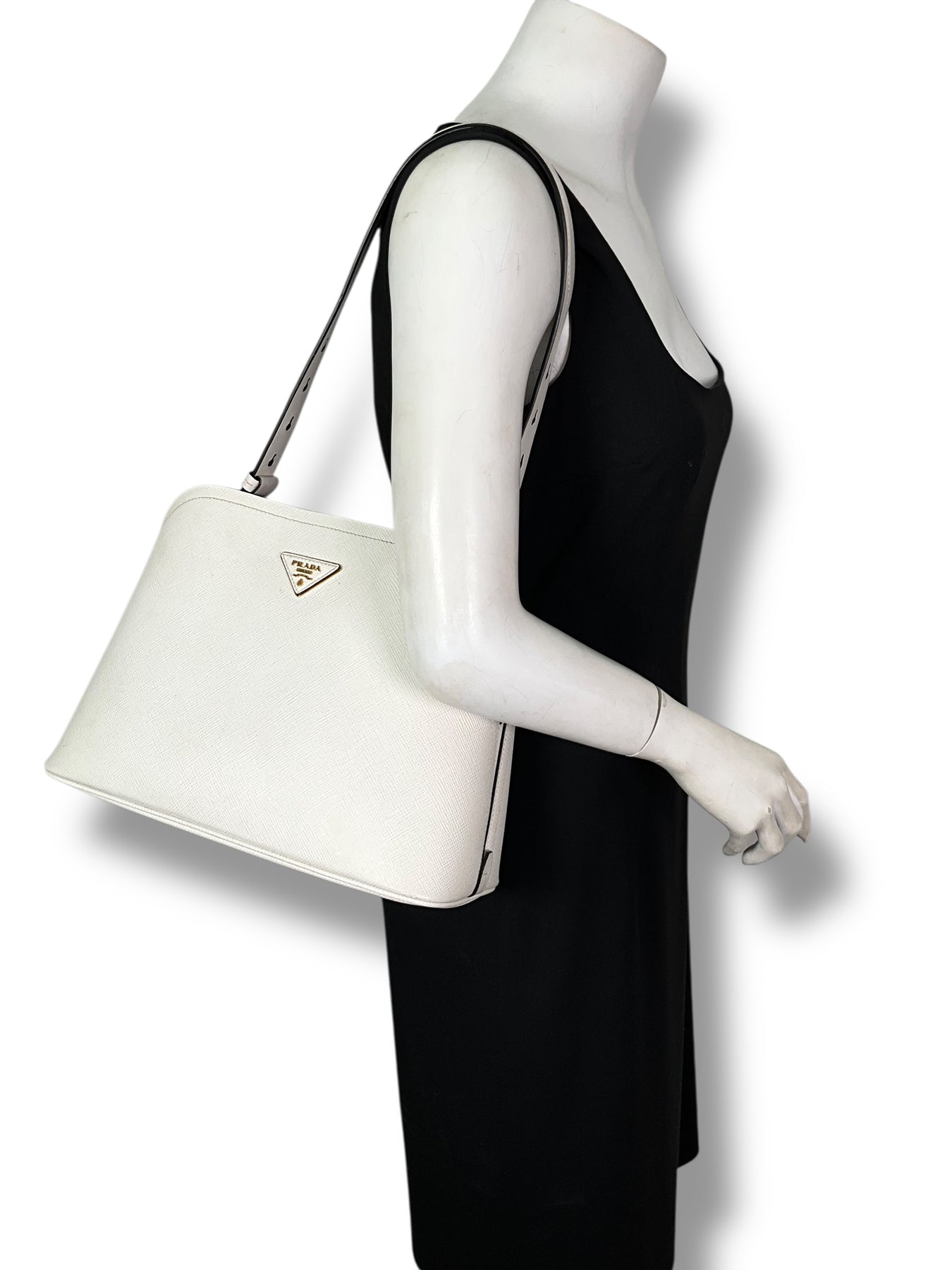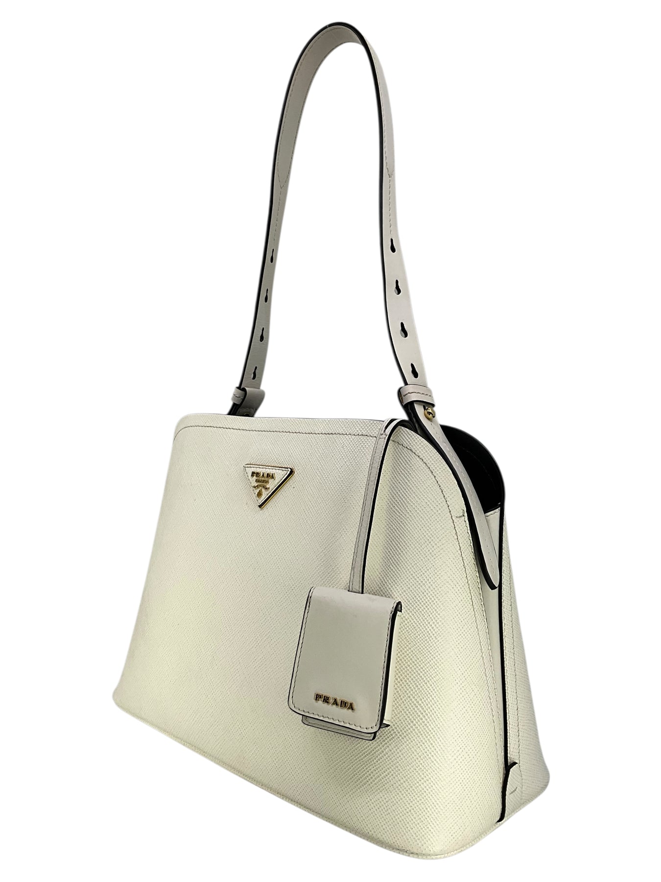 Add to your collection this authentic Prada Saffiano Cuir Medium Matinee Tote crafted from textured white Saffiano cross-grain leather and gold-tone hardware. It features an adjustable shoulder strap, a signature triangle logo at front and dual functional interior compartments with a center dividing zip compartment.