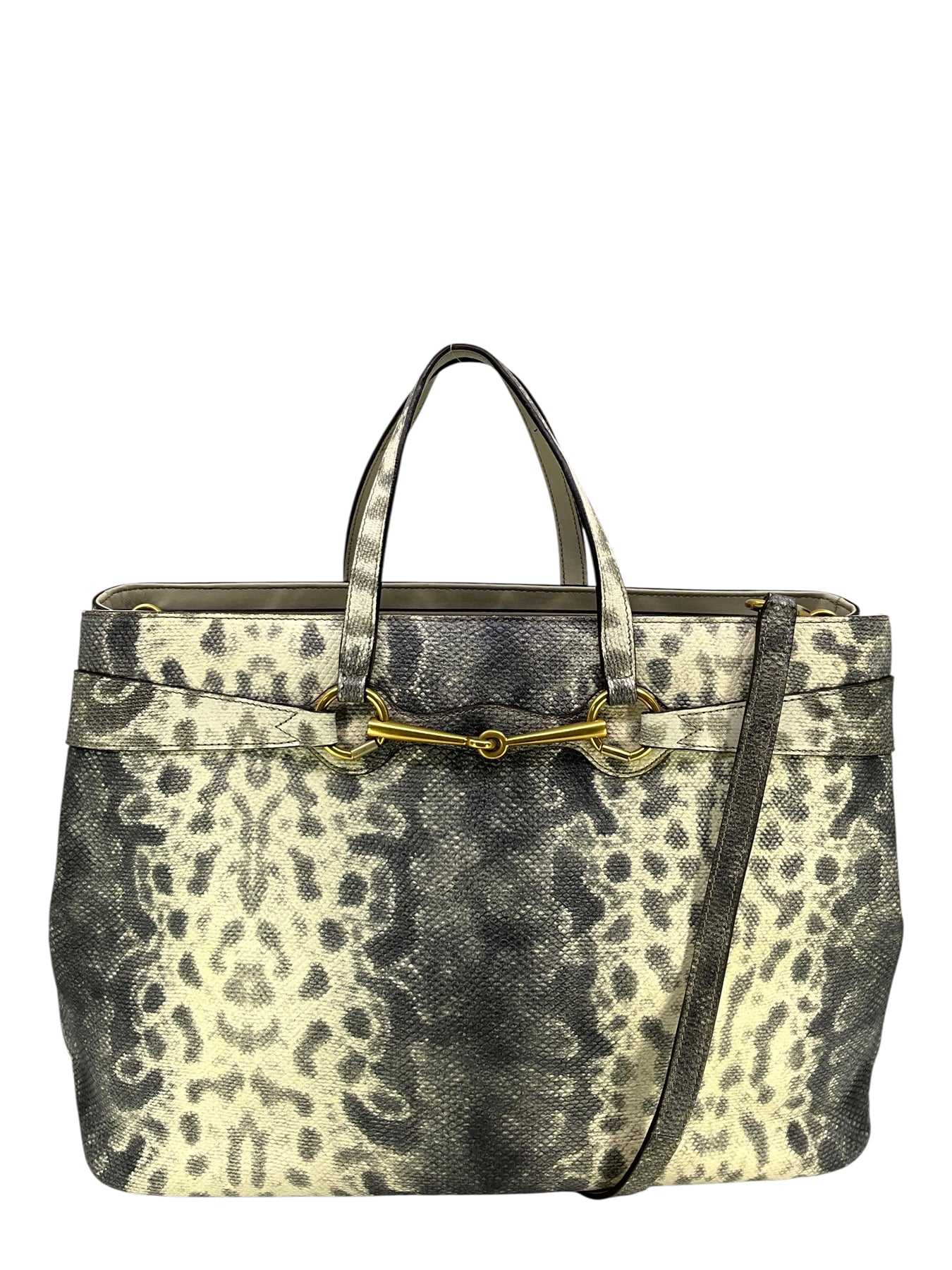 We guarantee the authenticity of this Gucci Bright Bit Animalier Lizard Print Large Tote originally designed in 1975 and finely crafted in gray lizard printed leather and gold-tone hardware. Featuring dual flat leather top handles and an optional removable shoulder strap. The bag is adorned with an oversized horsebit accent front and center.