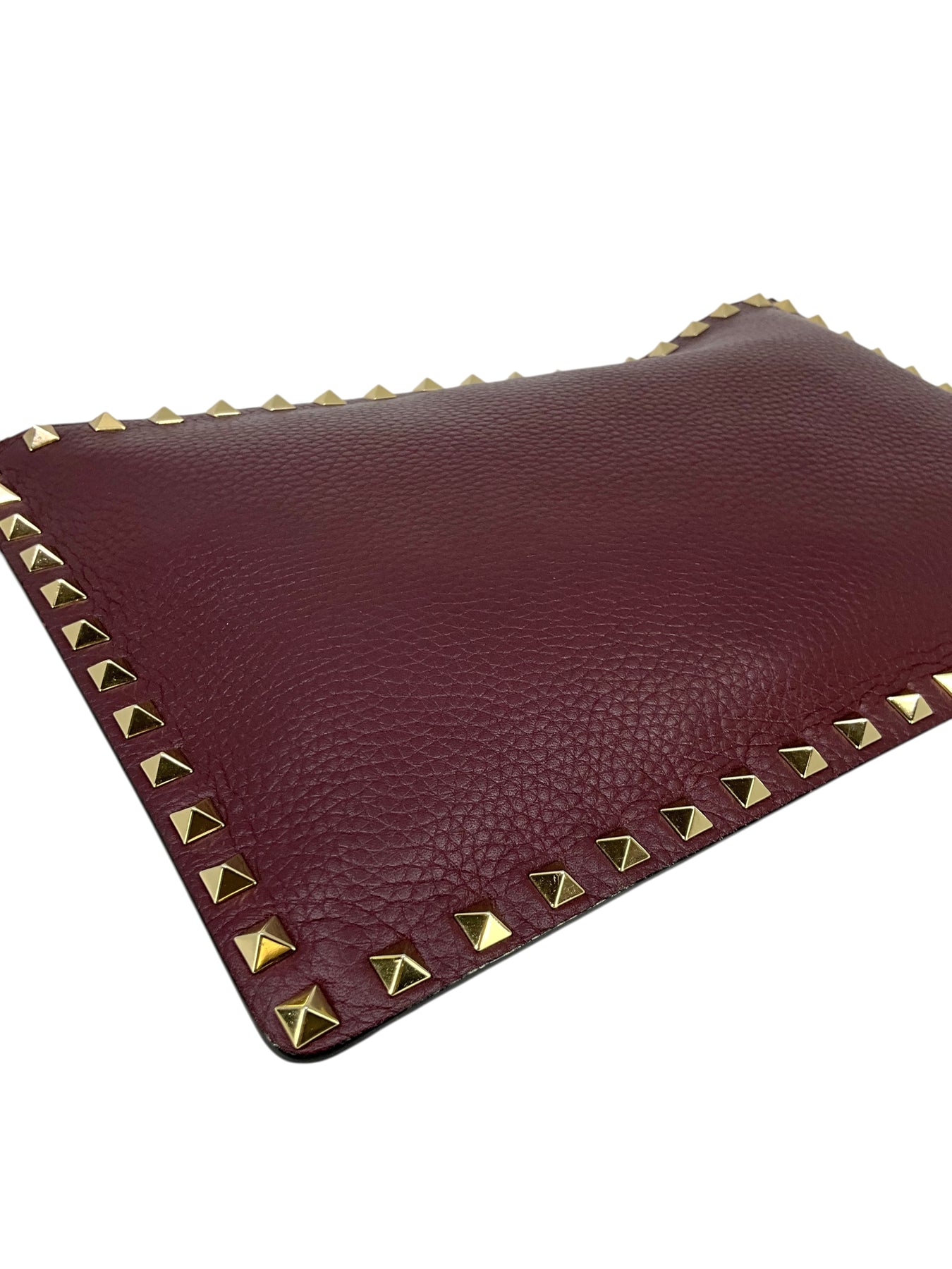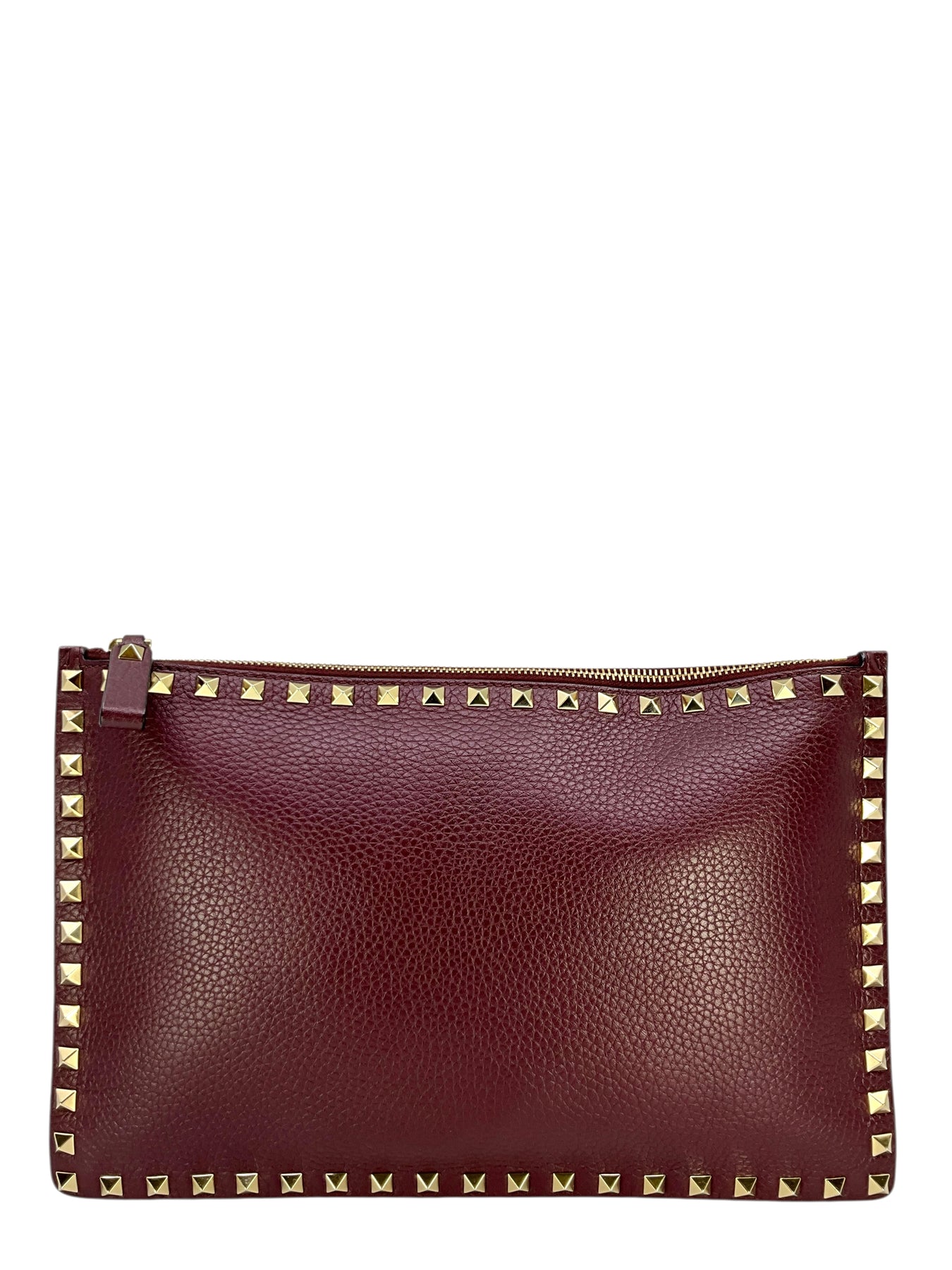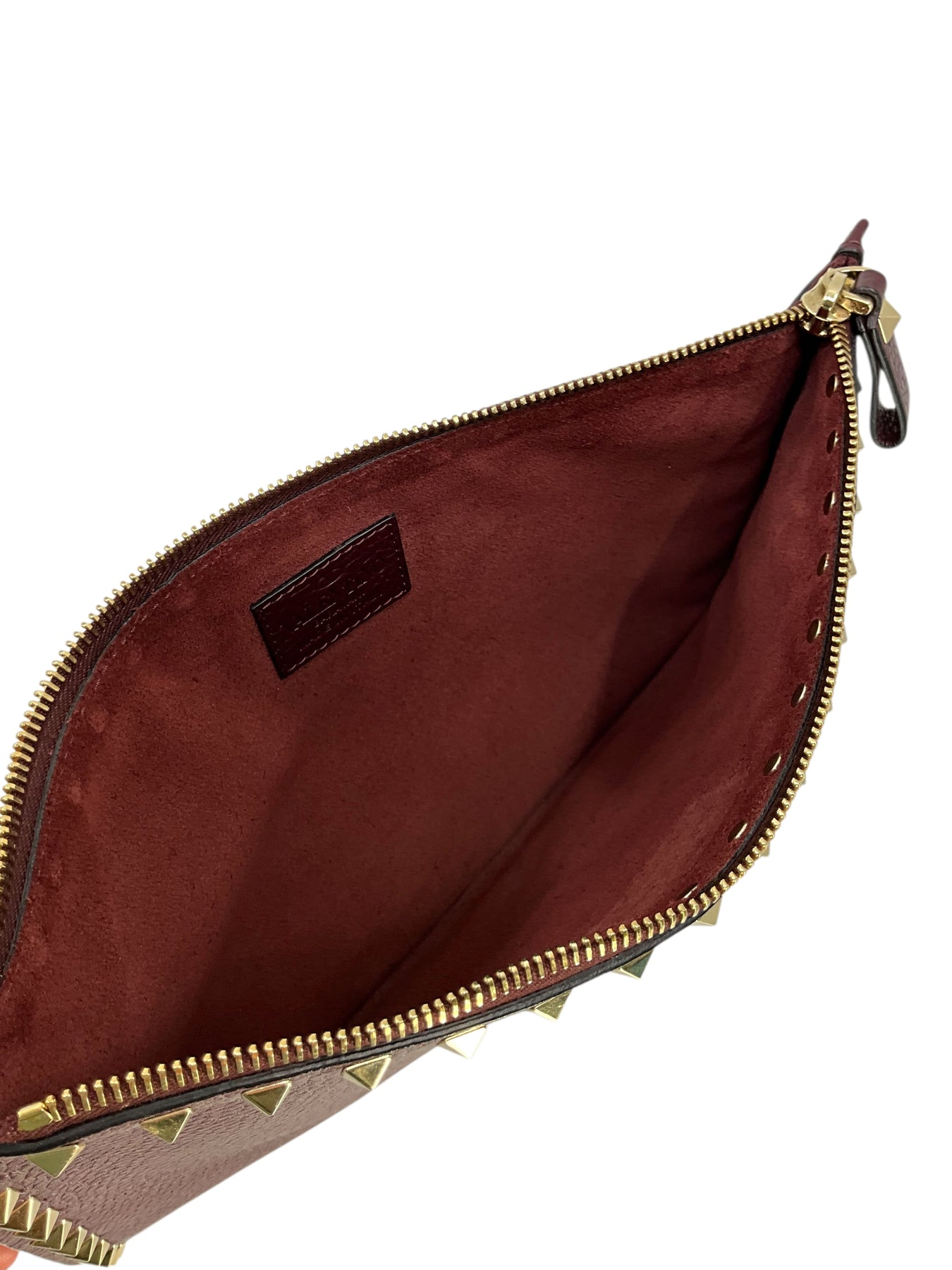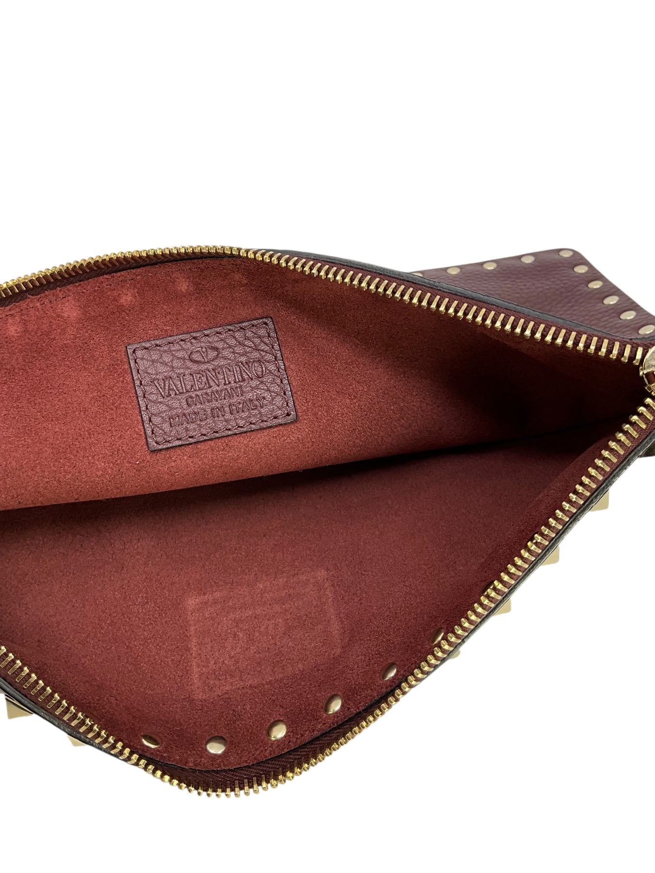 We guarantee the authenticity of this Valentino Garavani Rockstud Leather Zip Clutch Bag crafted from beautiful textured burgundy leather and gold-tone metal hardware. Featuring pyramid stud detailing and a single zip closure that opens to a beautiful tonal suede interior.