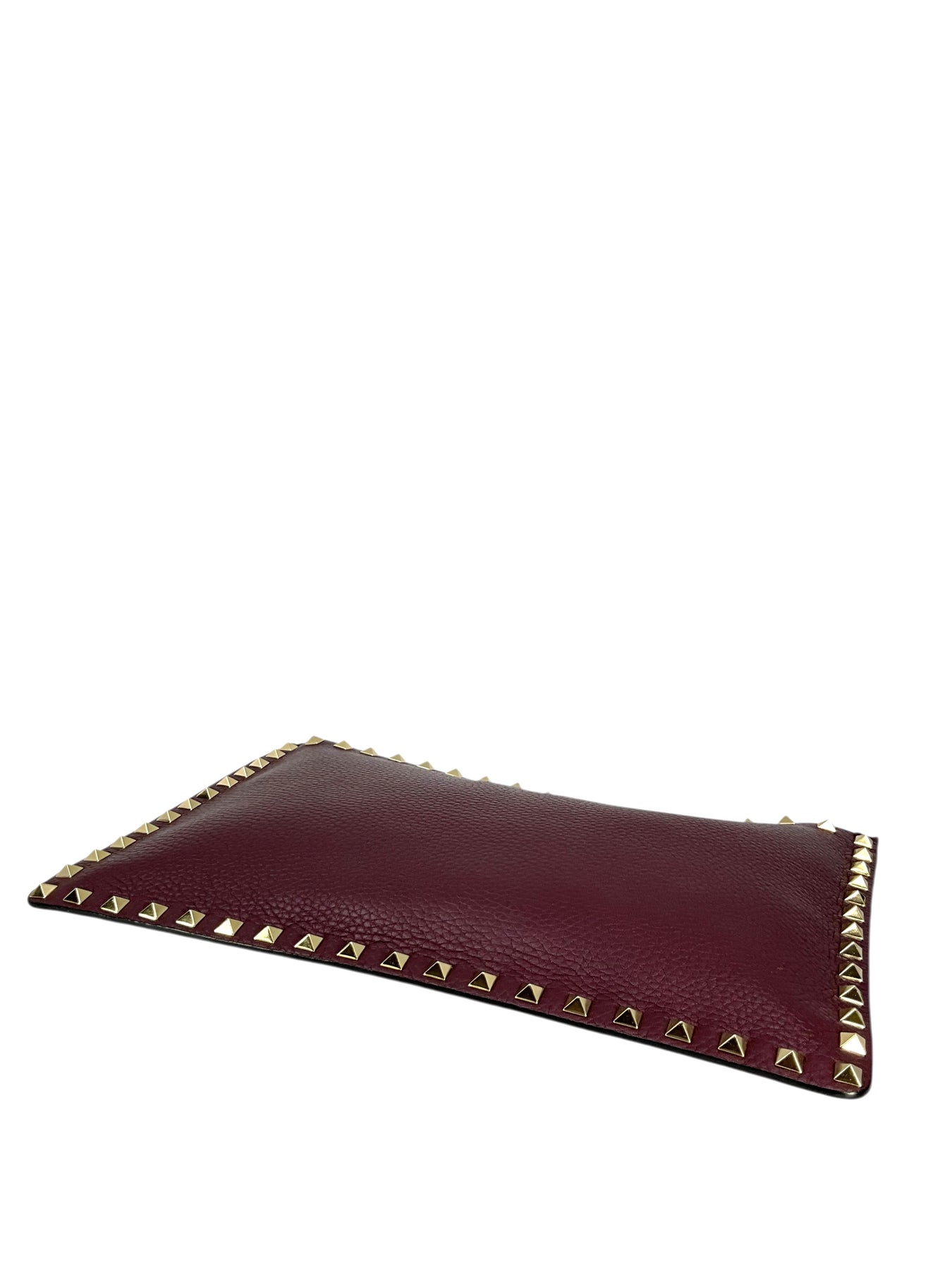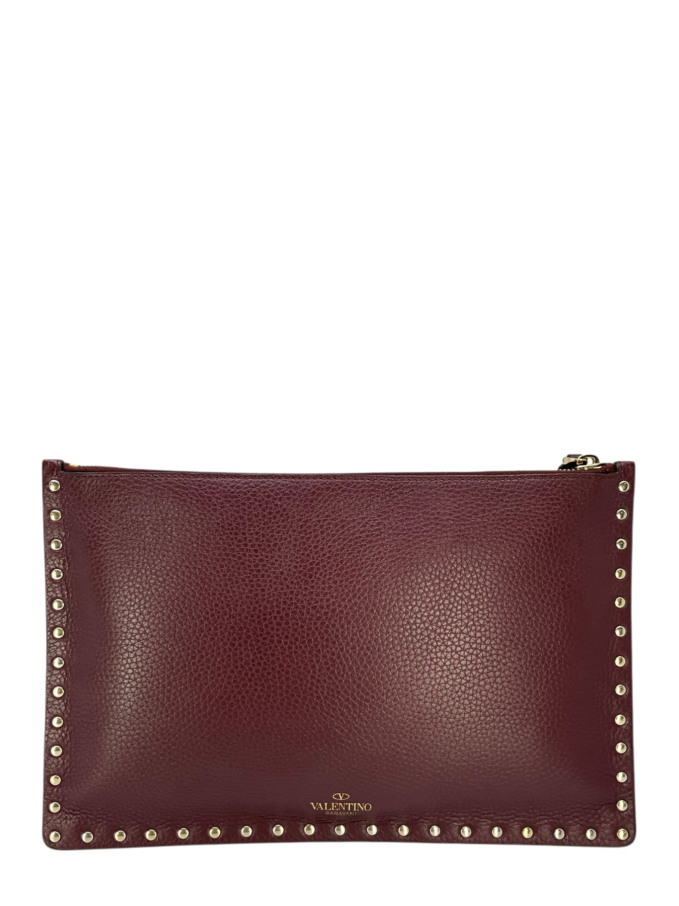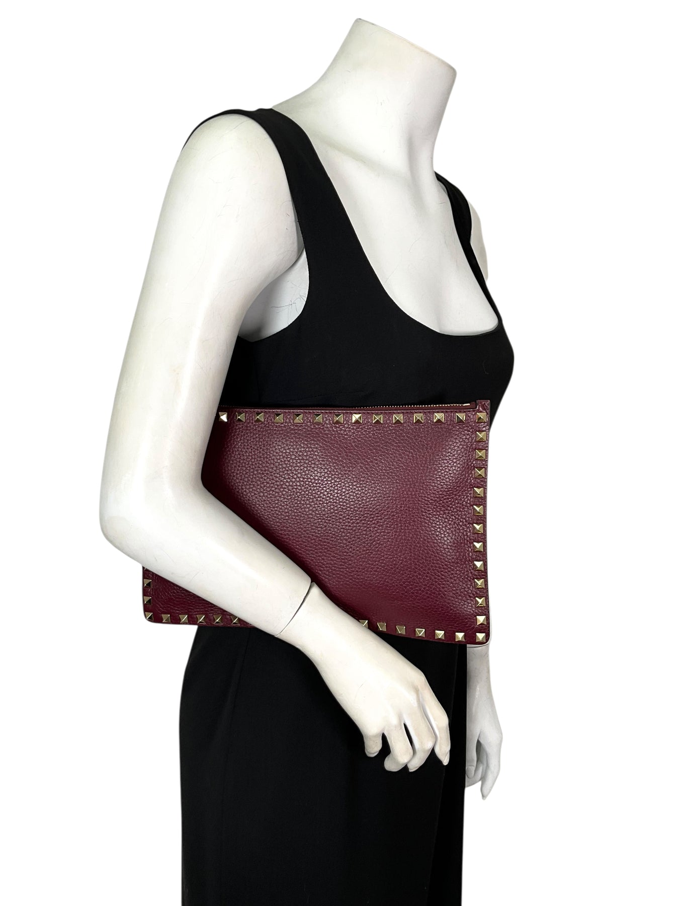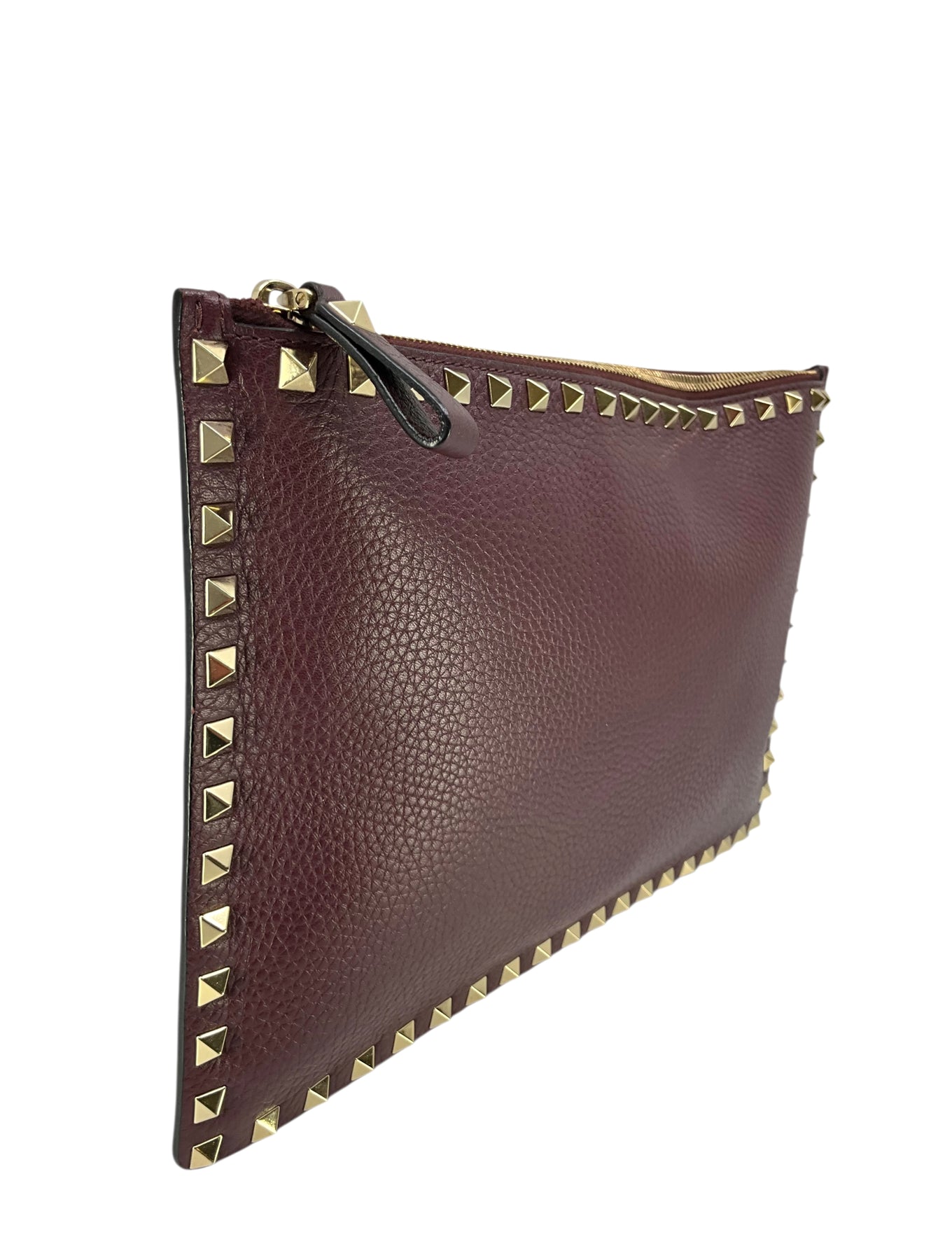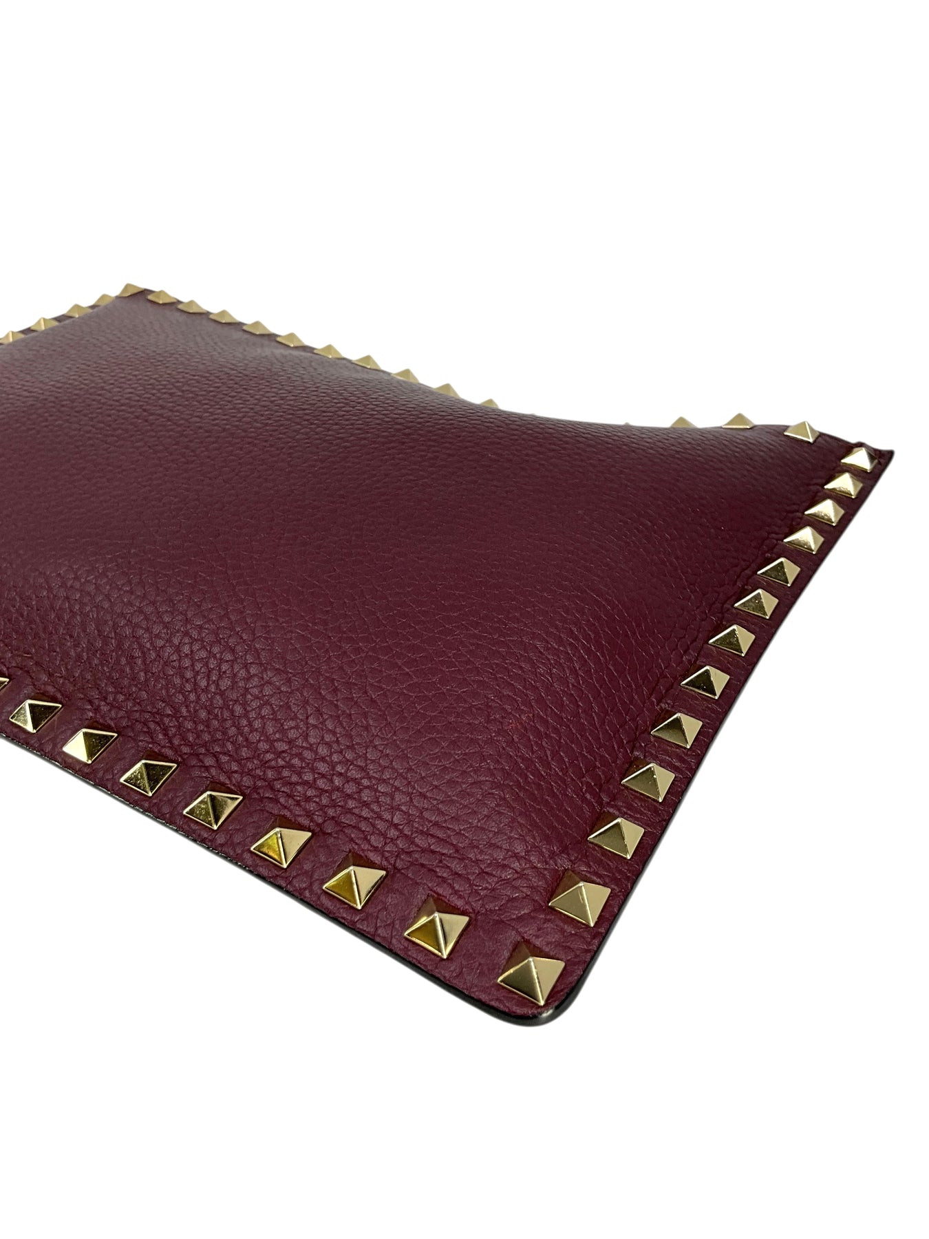 We guarantee the authenticity of this Valentino Garavani Rockstud Leather Zip Clutch Bag crafted from beautiful textured burgundy leather and gold-tone metal hardware. Featuring pyramid stud detailing and a single zip closure that opens to a beautiful tonal suede interior.