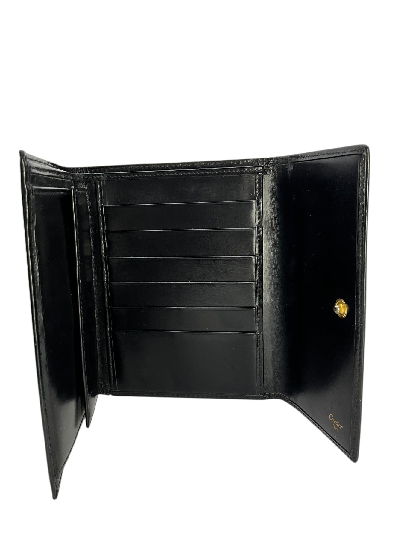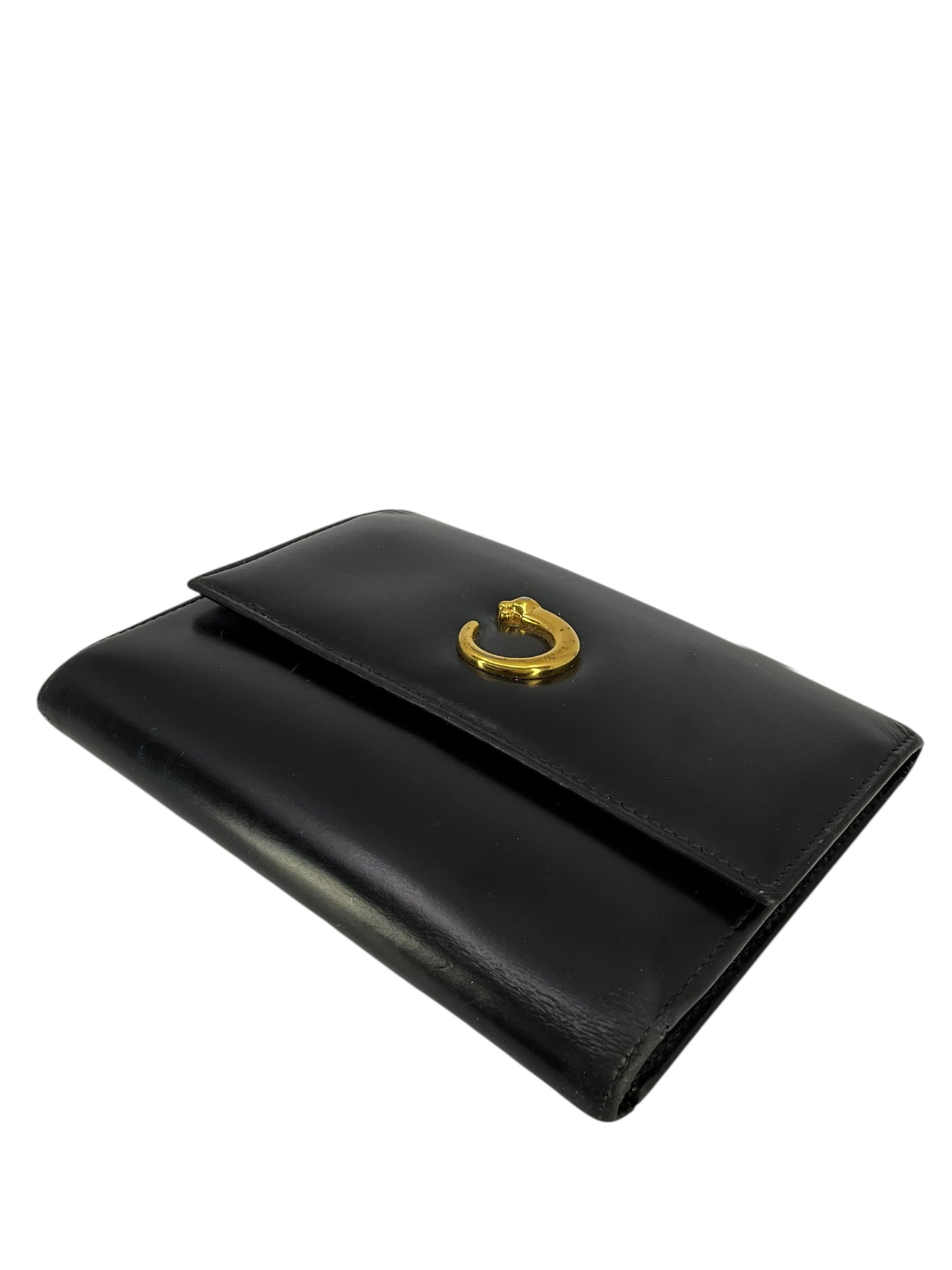 We guarantee the authenticity of this Cartier Vintage Panthere Trifold Wallet crafted in smooth black leather. Featuring a gold-tone panther accent and a frontal flap with a secure snap closure.