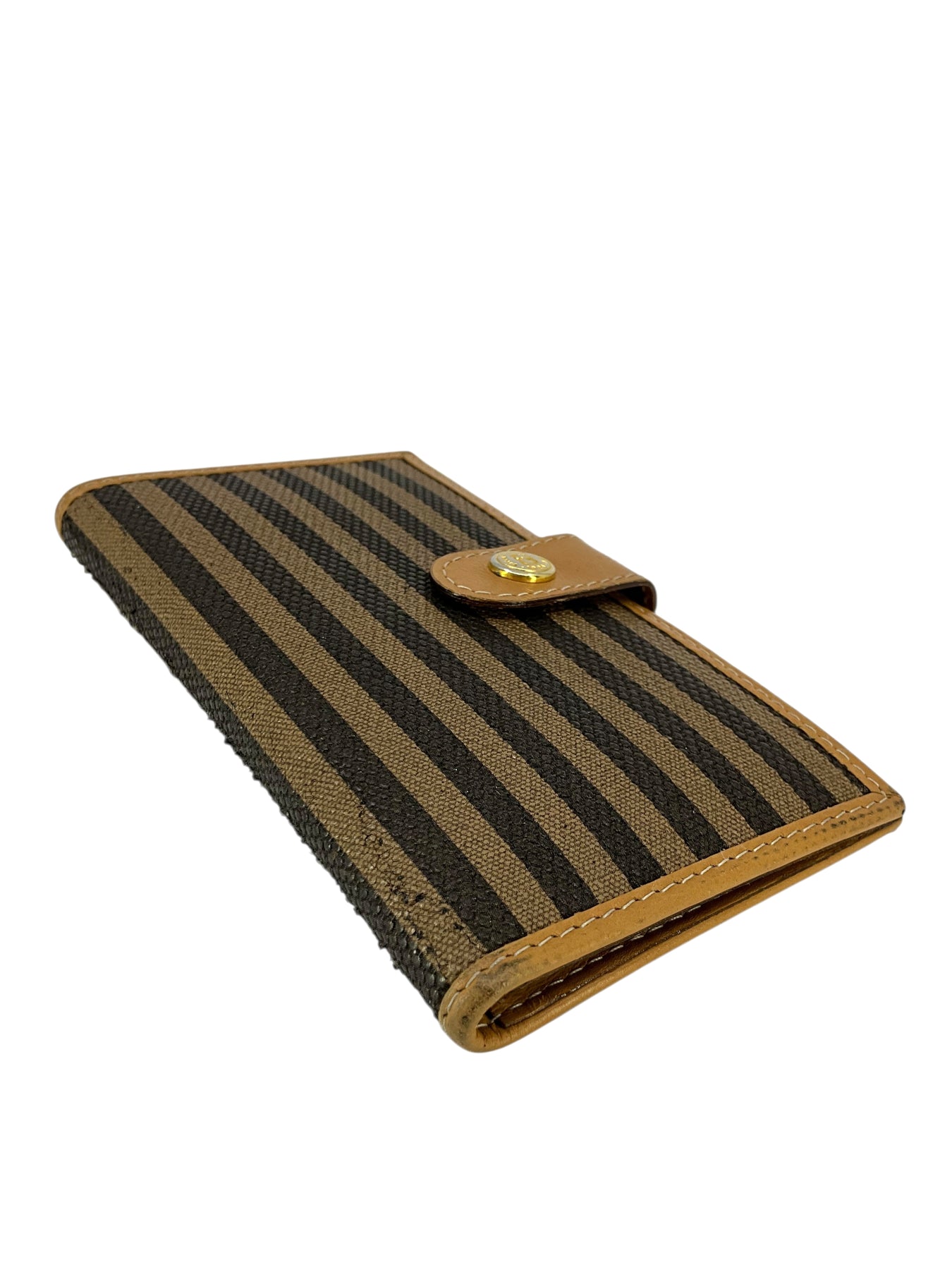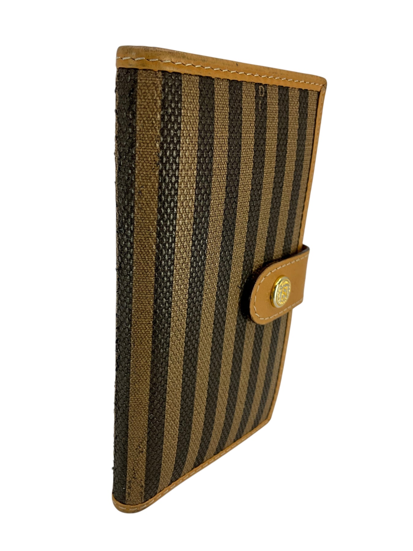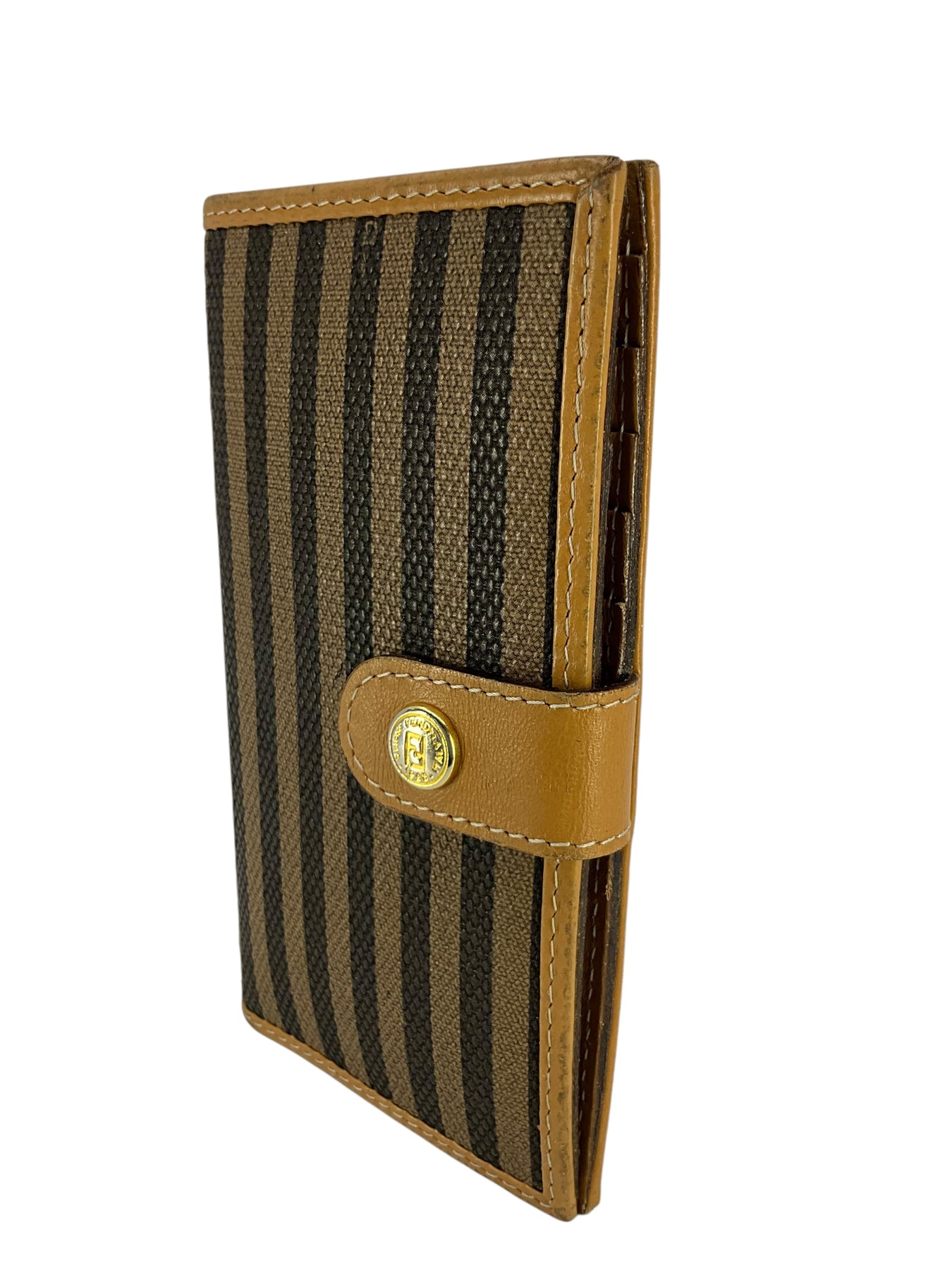This is an authentic Fendi Vintage Pequin Striped Card Holder crafted in brown coated canvas with a tan leather trim. Featuring a secure snap closure that opens to ten card slots and two open pockets.