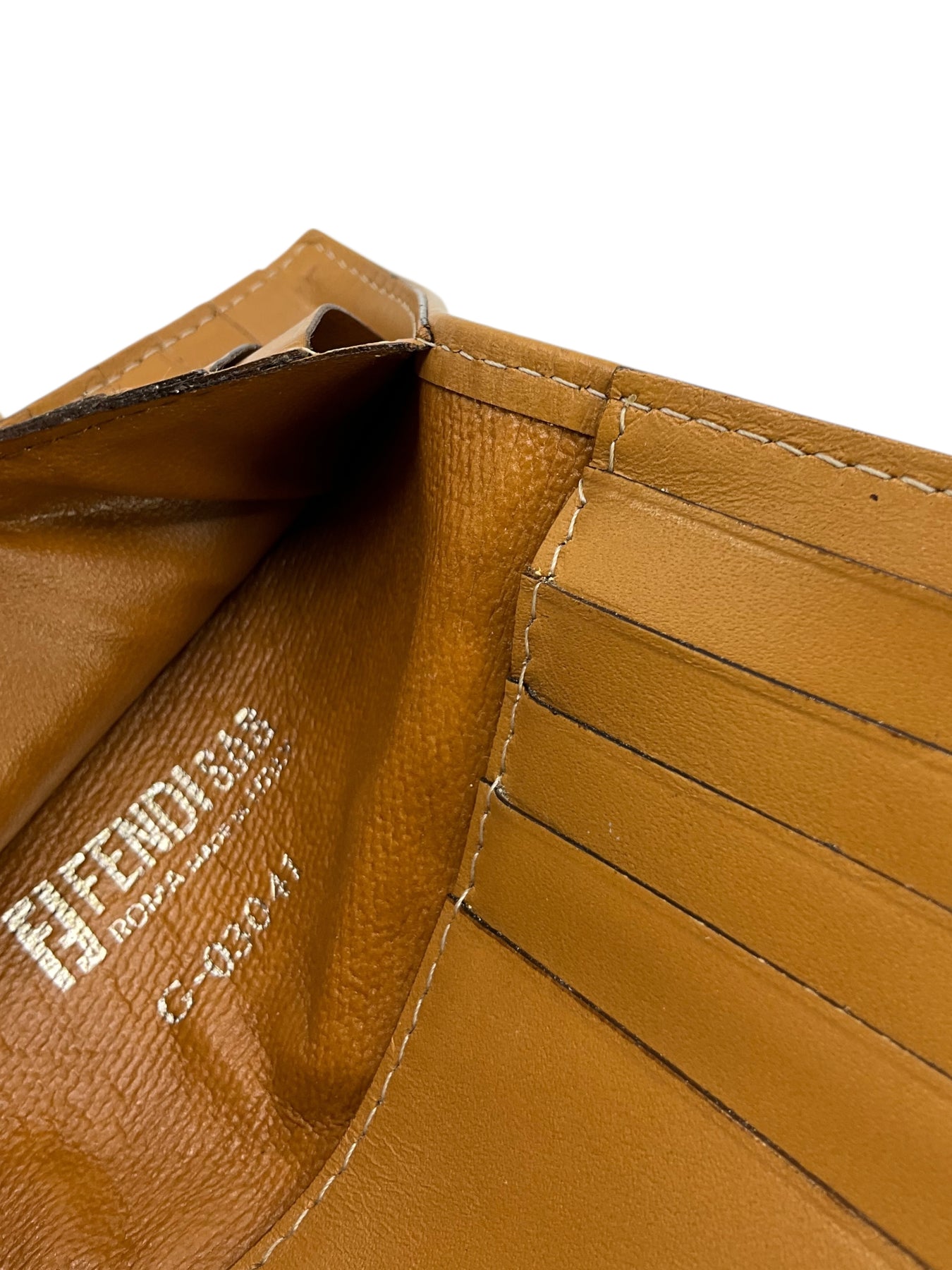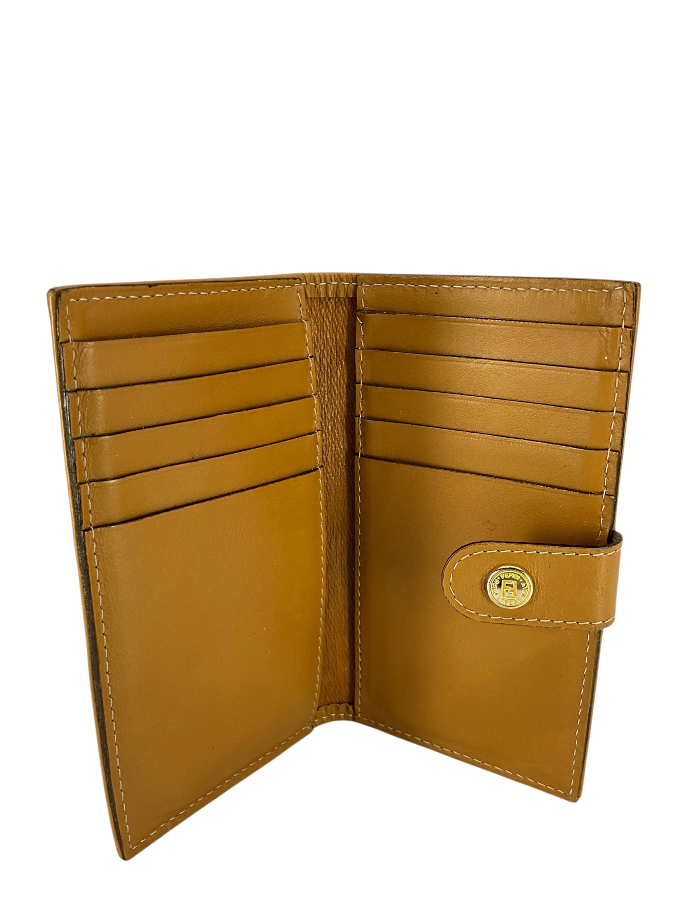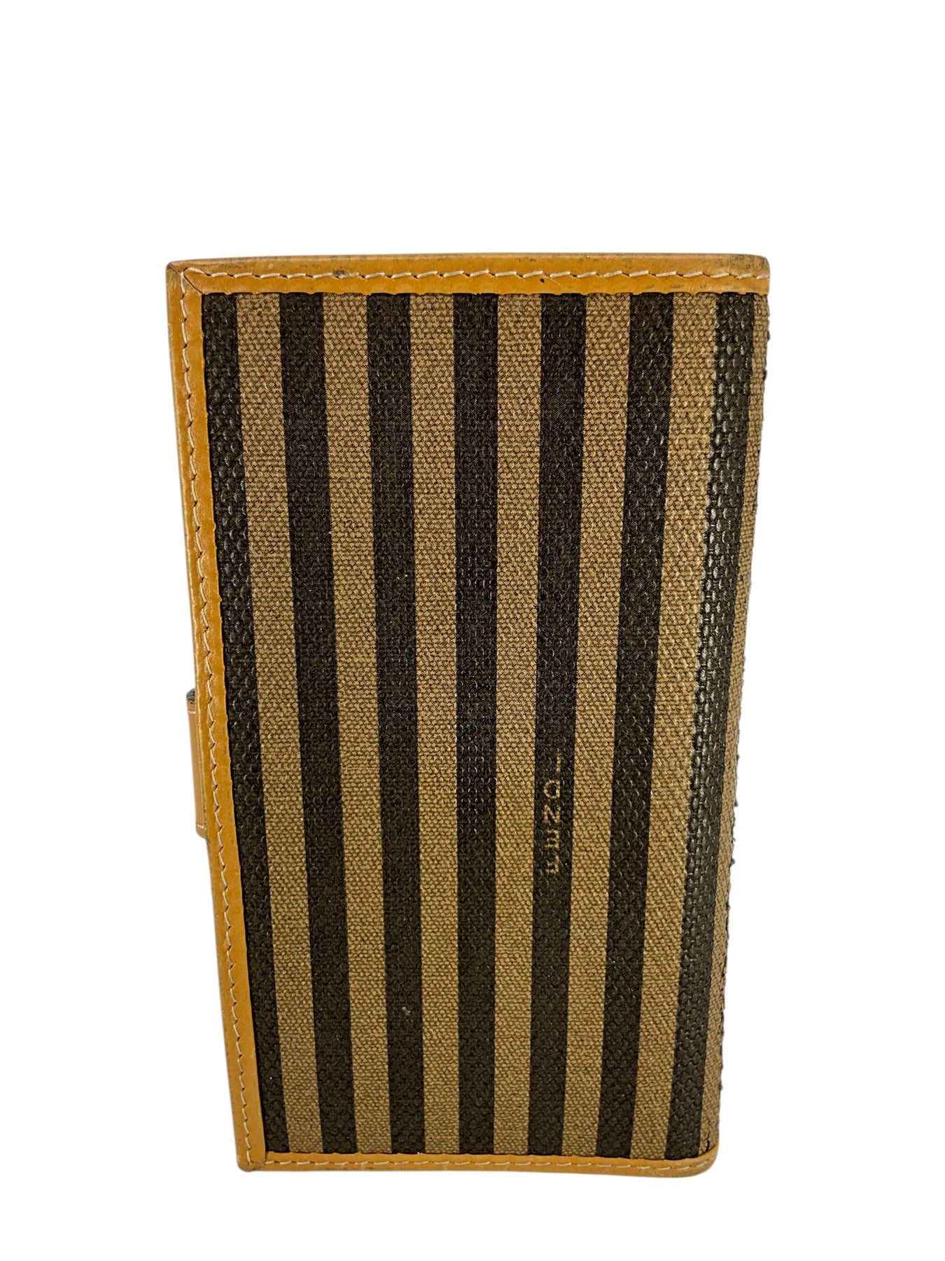 This is an authentic Fendi Vintage Pequin Striped Card Holder crafted in brown coated canvas with a tan leather trim. Featuring a secure snap closure that opens to ten card slots and two open pockets.