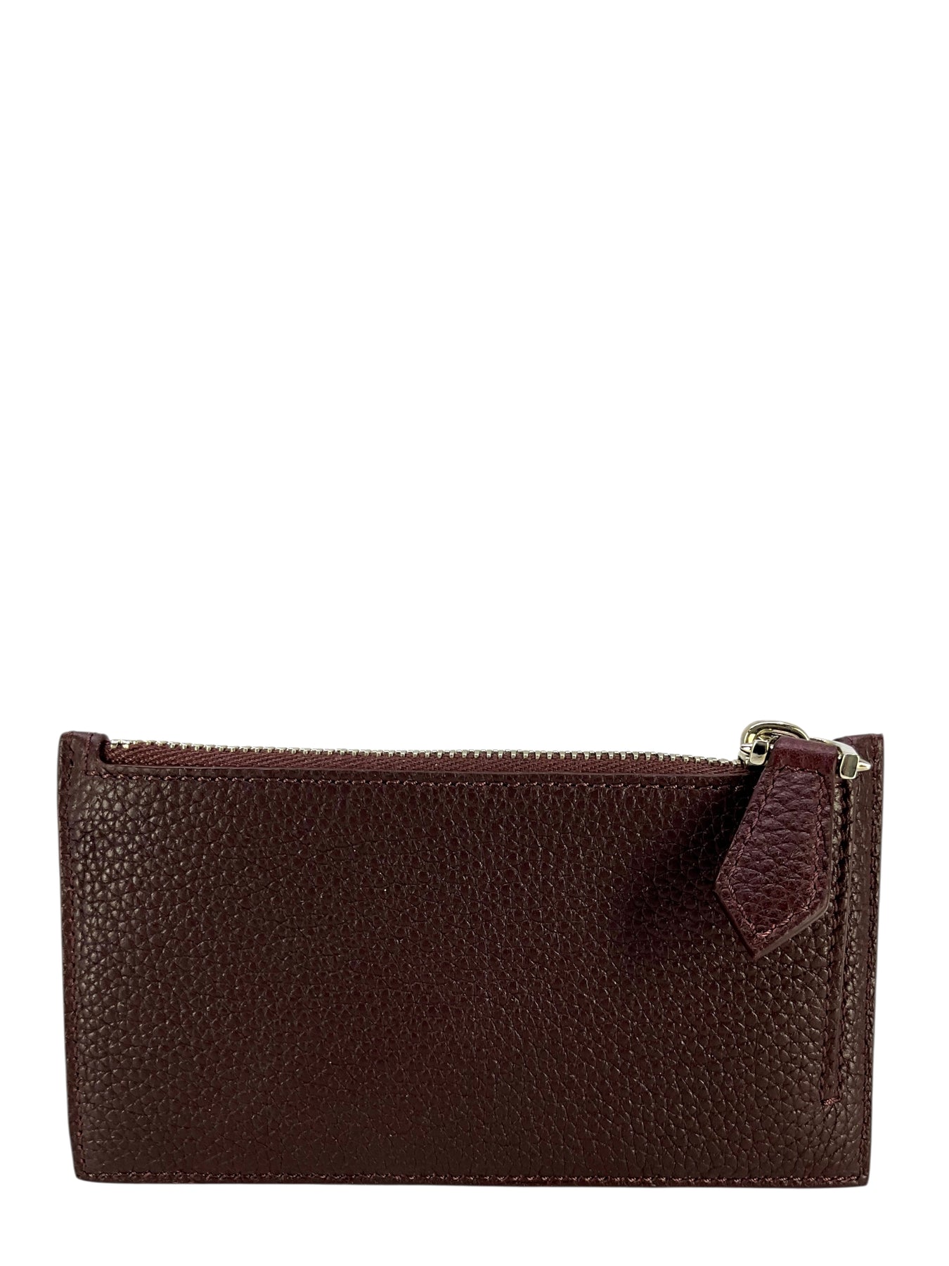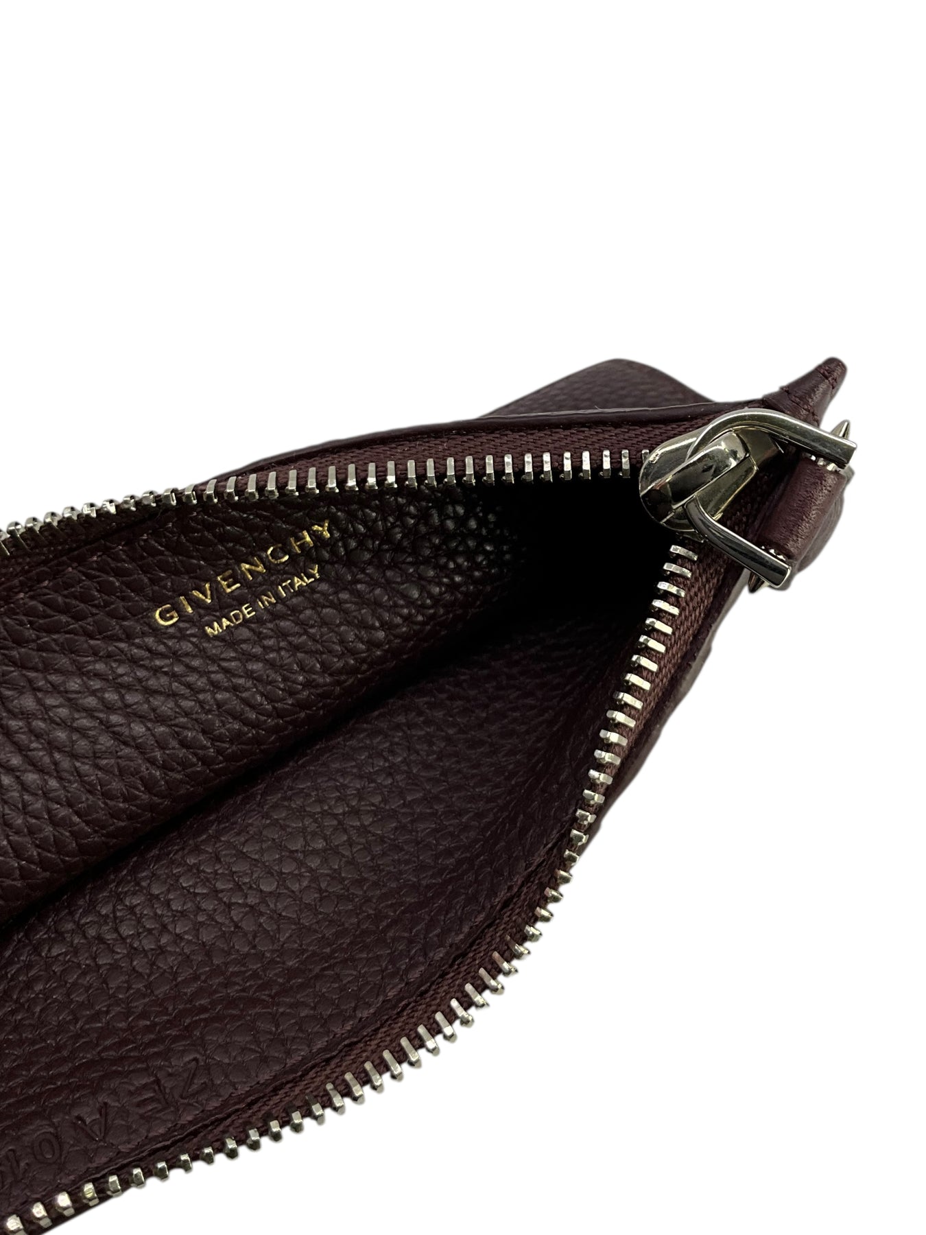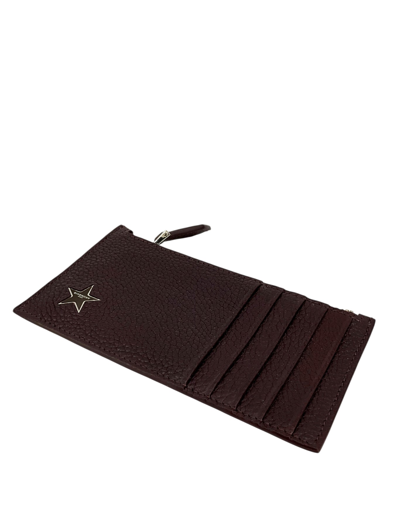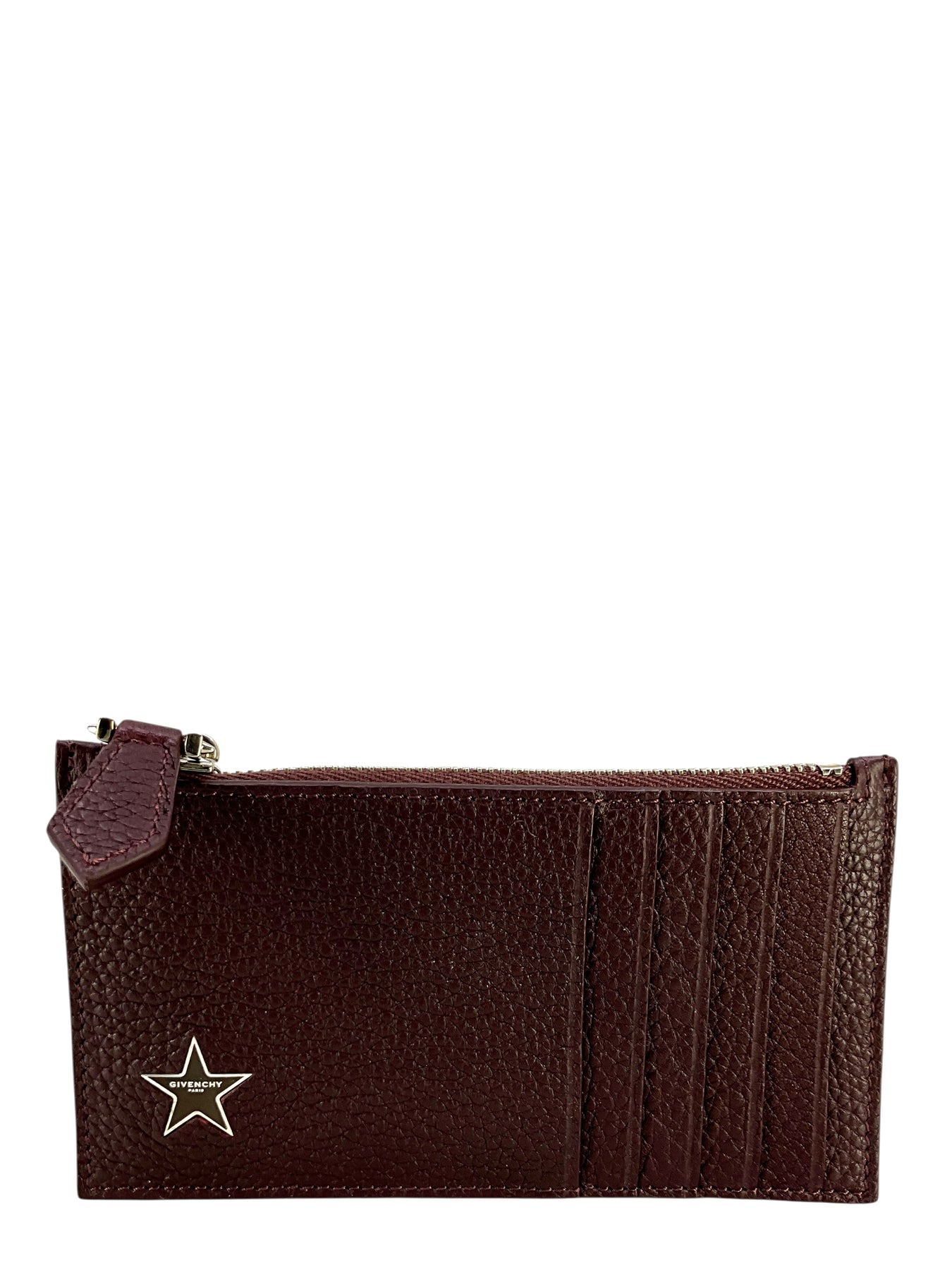 This is an authentic Givenchy Star Motif Leather Card Holder crafted in burgundy leather with a five card slots and a top zip coin pouch.