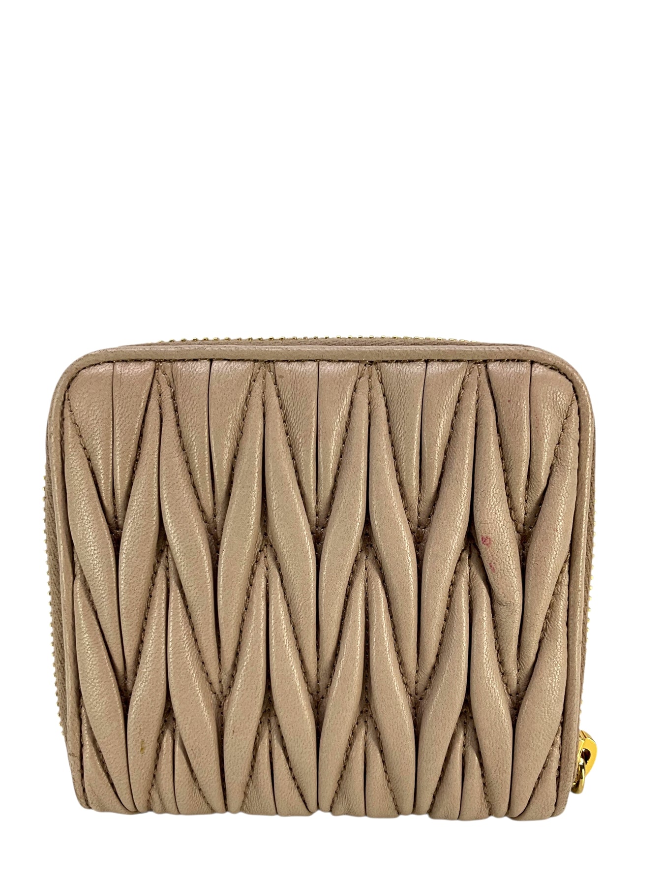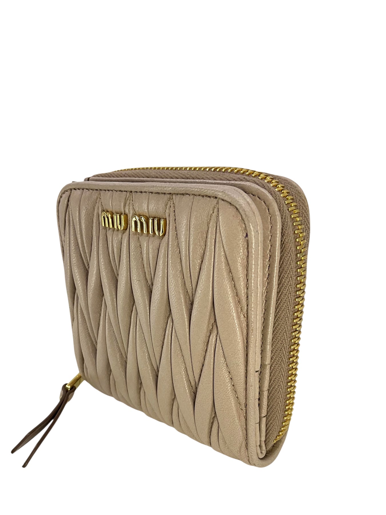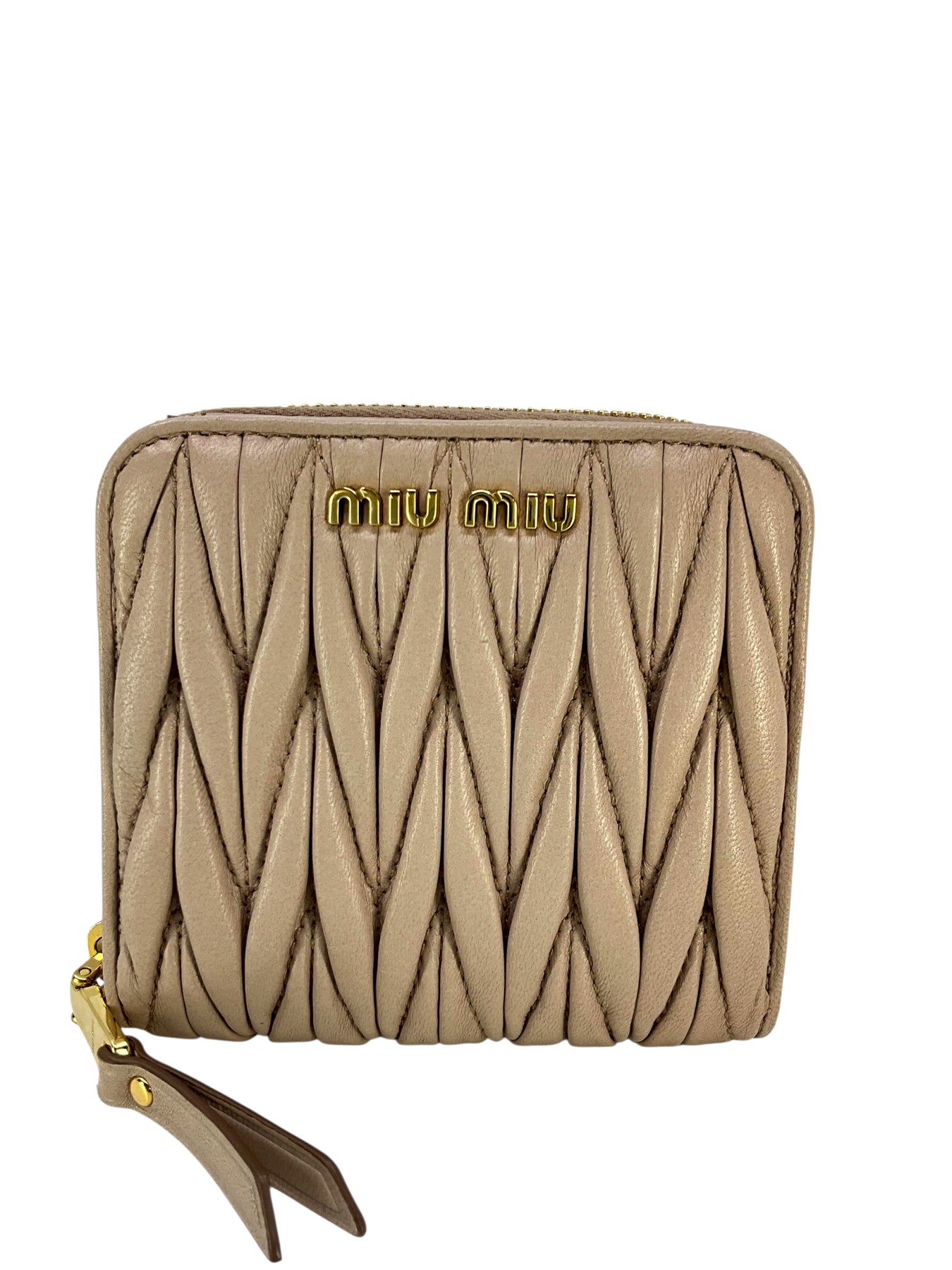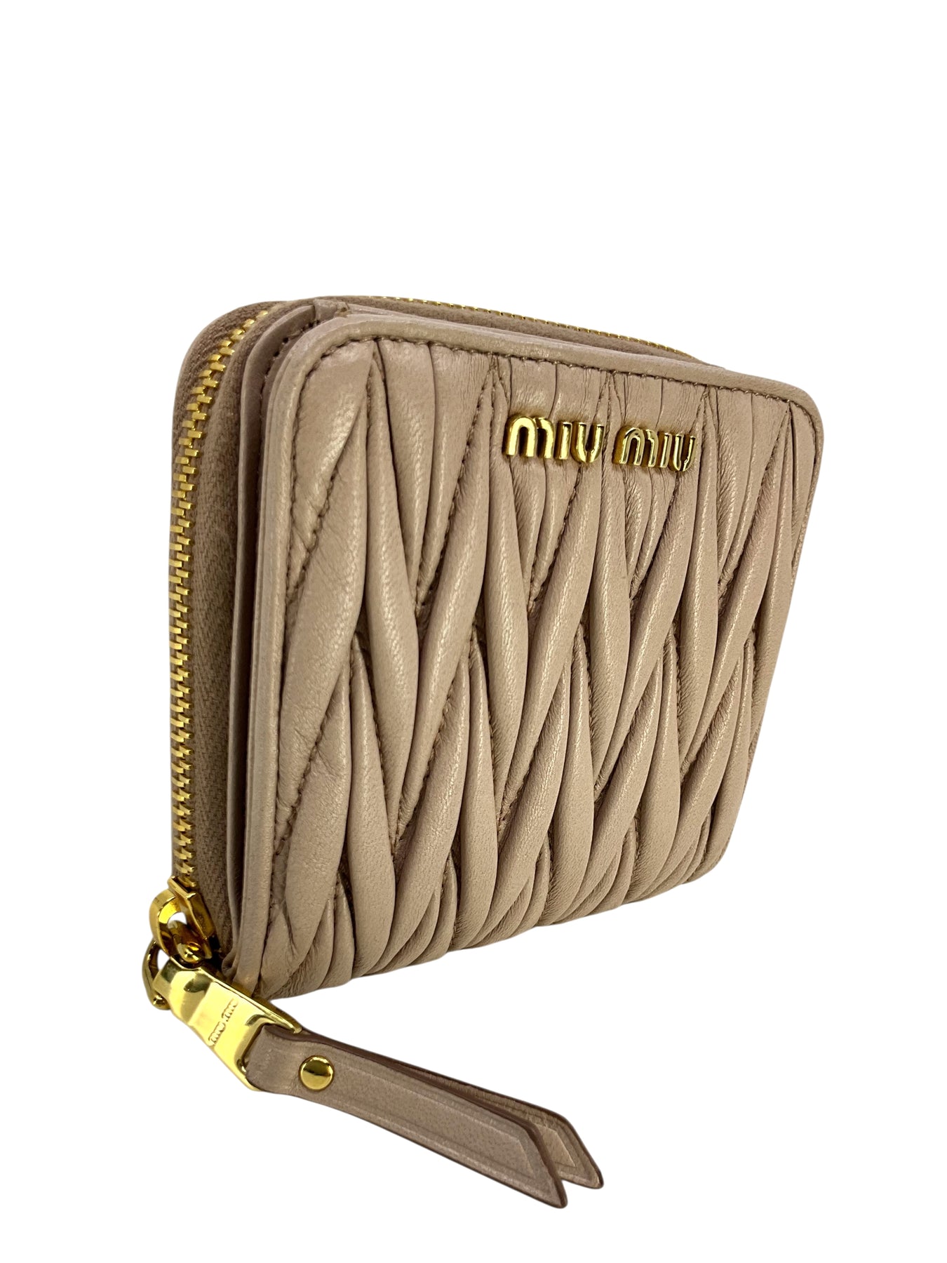 We guarantee the authenticity of this Miu Miu Matelasse Nappa Leather Small Wallet in taupe with a signature gold-tone logo front, a zip-around coin pouch and a secure snap closure.